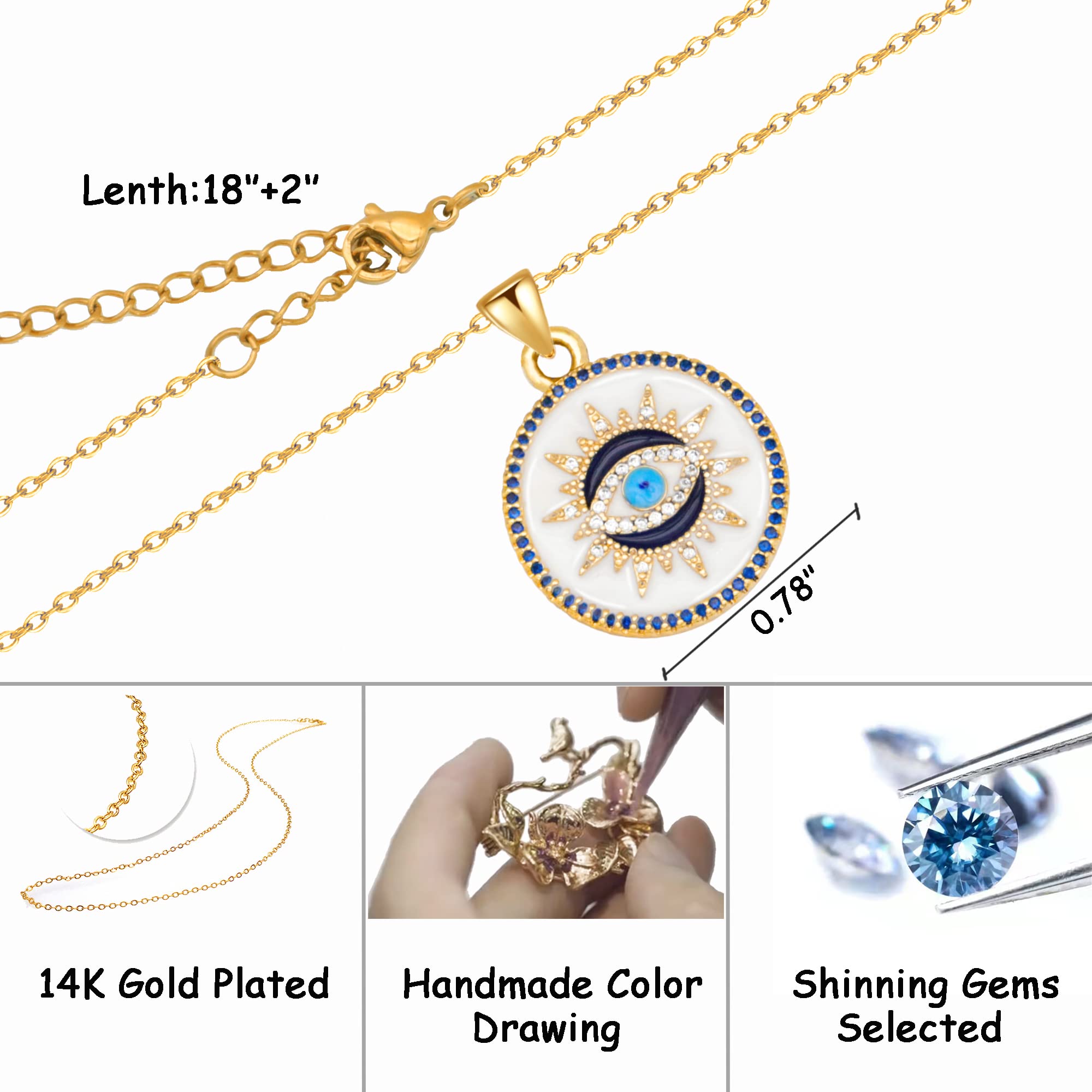 Handmade Jewelry: Unique evil eye coin necklace made with high quality and long-lasting 14K plated gold embellished with blue and silver Cubic Zirconia stones. The chain is 18" with an adjustable 2" extender. This Nazar beads necklace will ward off misfortune on many occasions.