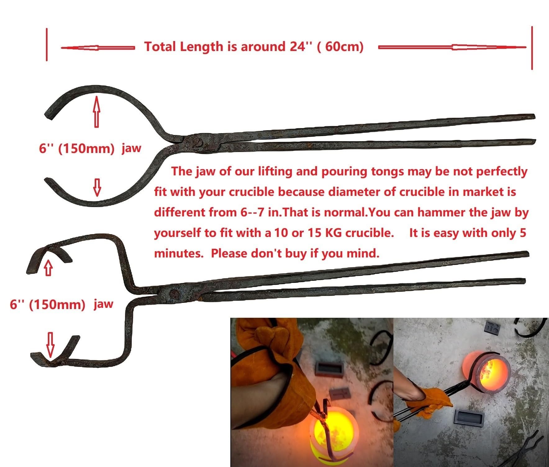 Be Attention: Different brands of crucibles may have different sizes. For your safty, You need ensure that the lifting tongs or pouring tongs fully fit with your crucibles before use. Heating the tongs and then you could adjust the jaws of the tong with a harmmer easily.