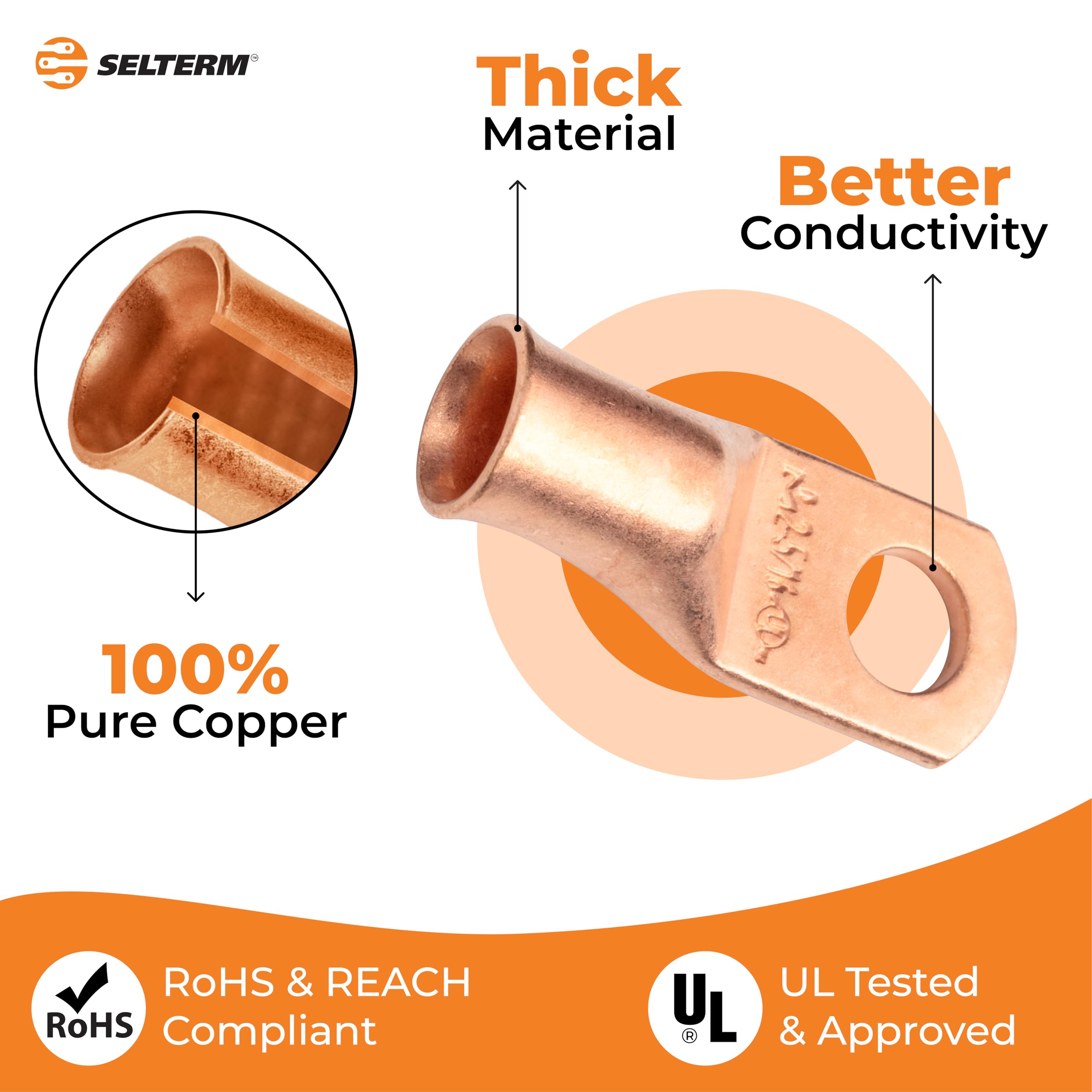PERFECT FIT: Selterm provides freedom to choose from a wide range of wire sizes, stud sizes, and pack quantities from 2 - 25 pcs. best suitable for all requirements and applications as battery connectors. Superior material quality of copper terminals lugs can be crimped or soldered. Use with a compatible copper cable; Audio wire may not be a direct fit. Recommend to check product dimensions to ensure a proper fit of the connectors.