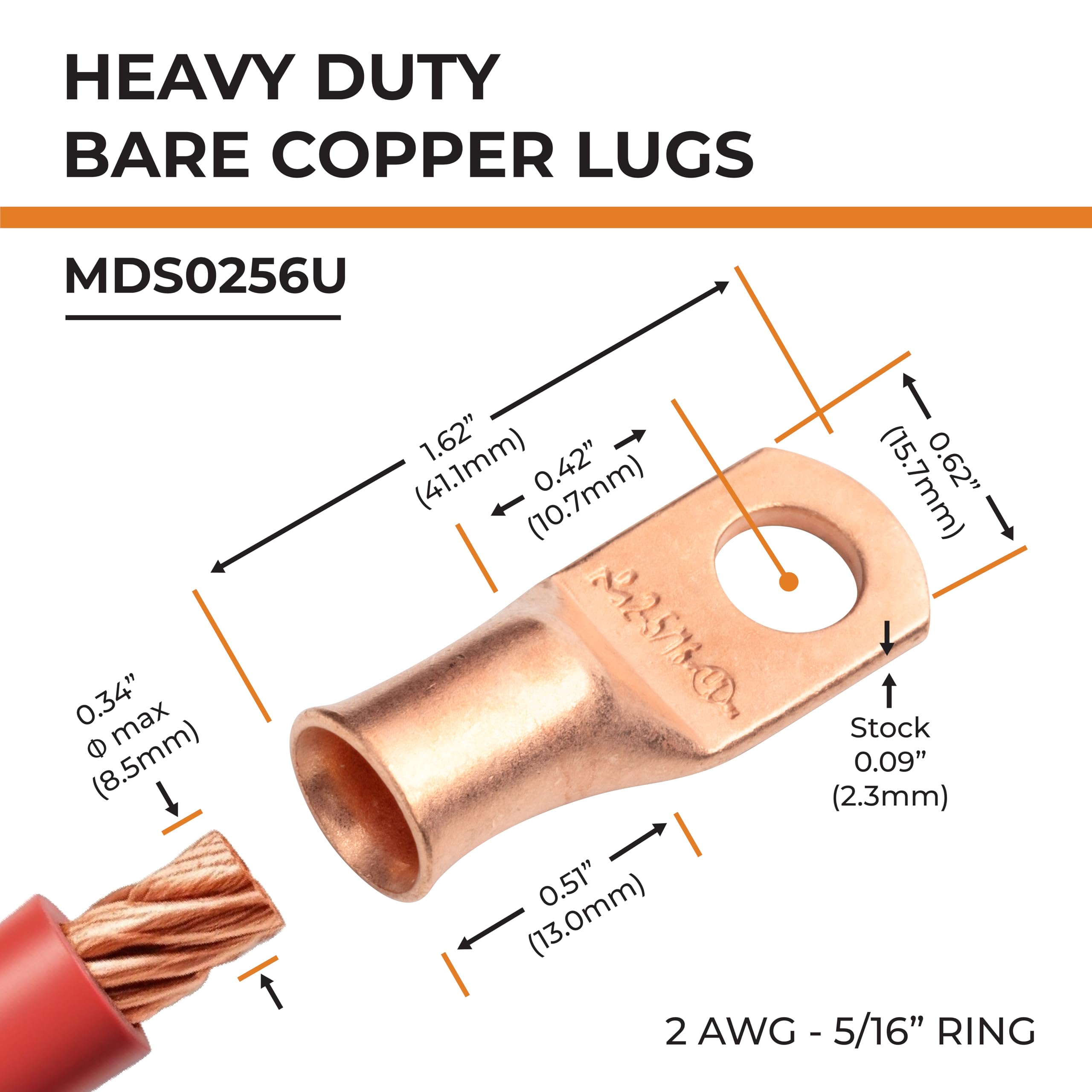 PACKAGE CONTENTS: 10 PCS. of Heavy Duty Bare Copper 2 Gauge (AWG) 5/16" ring battery cable lugs / terminal connectors. 100% annealed copper, providing a high degree of conductivity for maximum current flow when used as battery terminals.