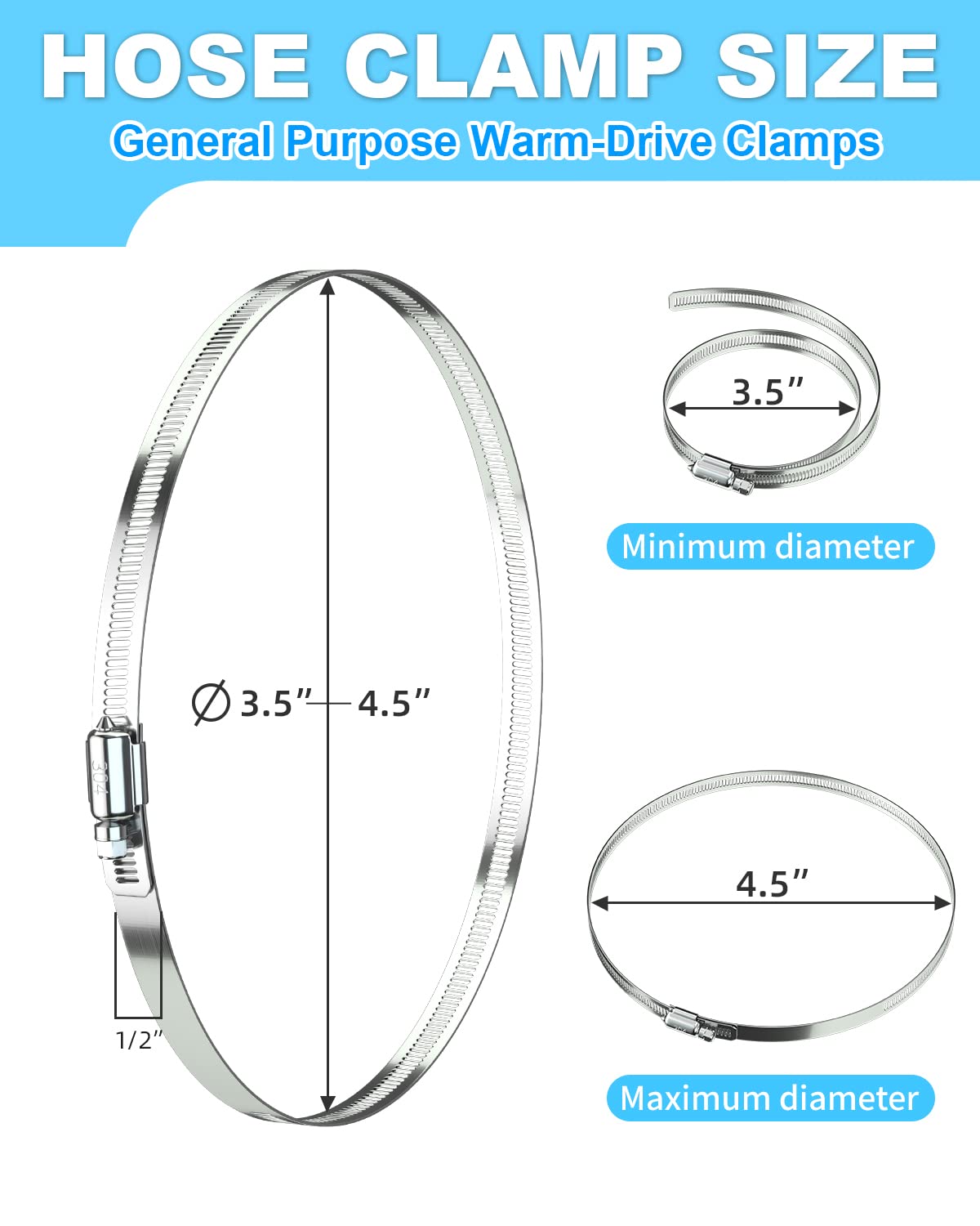 [Strong Tightening Performance]:The hose clamps are high torque,adjustable range, secure hold and smoothly drive. The average torque of the hose clamps is 9.5N and can hold well onto the hose and pipes for a very long time.Hose clamps have clamping range from 3 1/2 inch to 4 1/2 inch , perfect for 3 1/2 inch ,3 3/4'', 4'';4 1/2'' hose clamps etc.