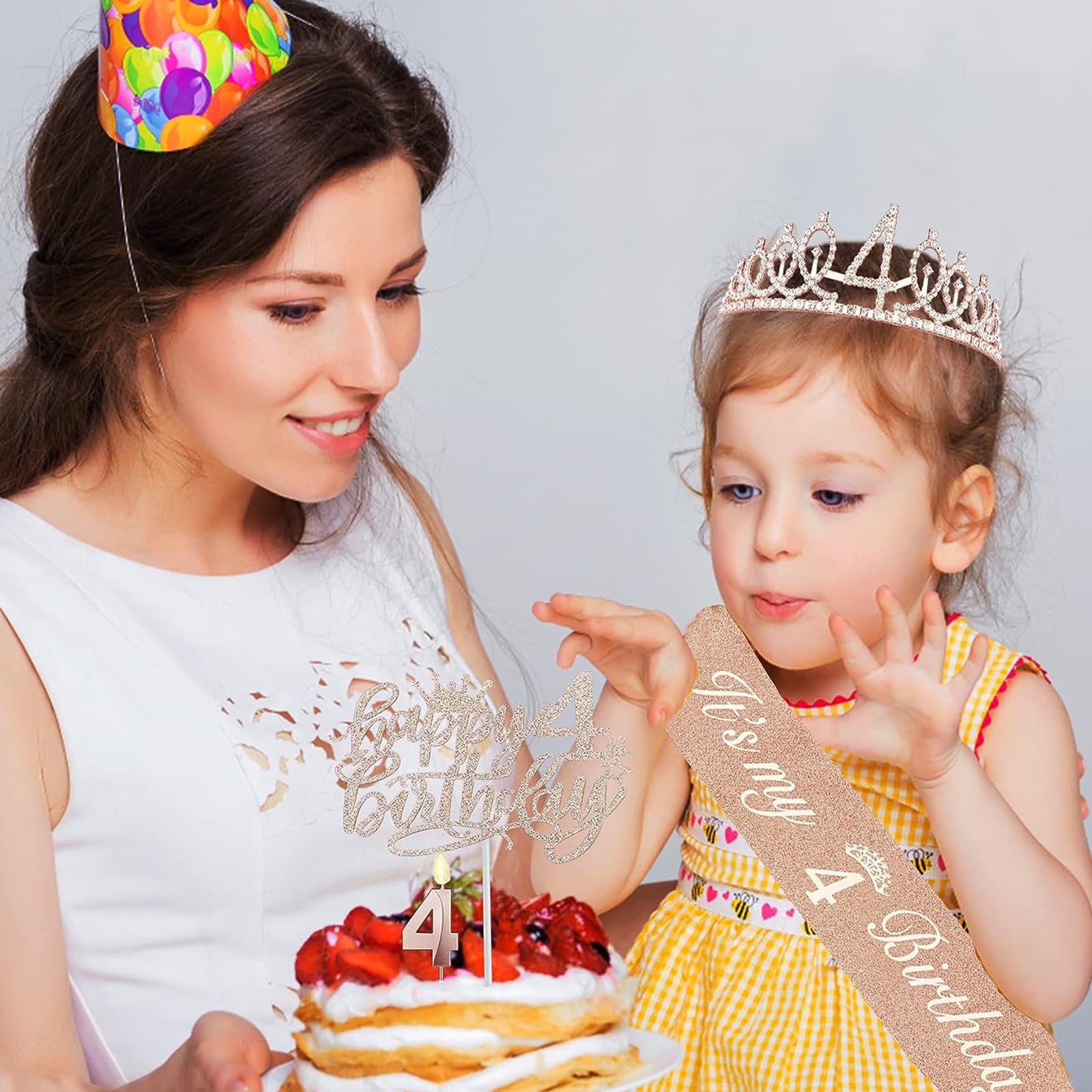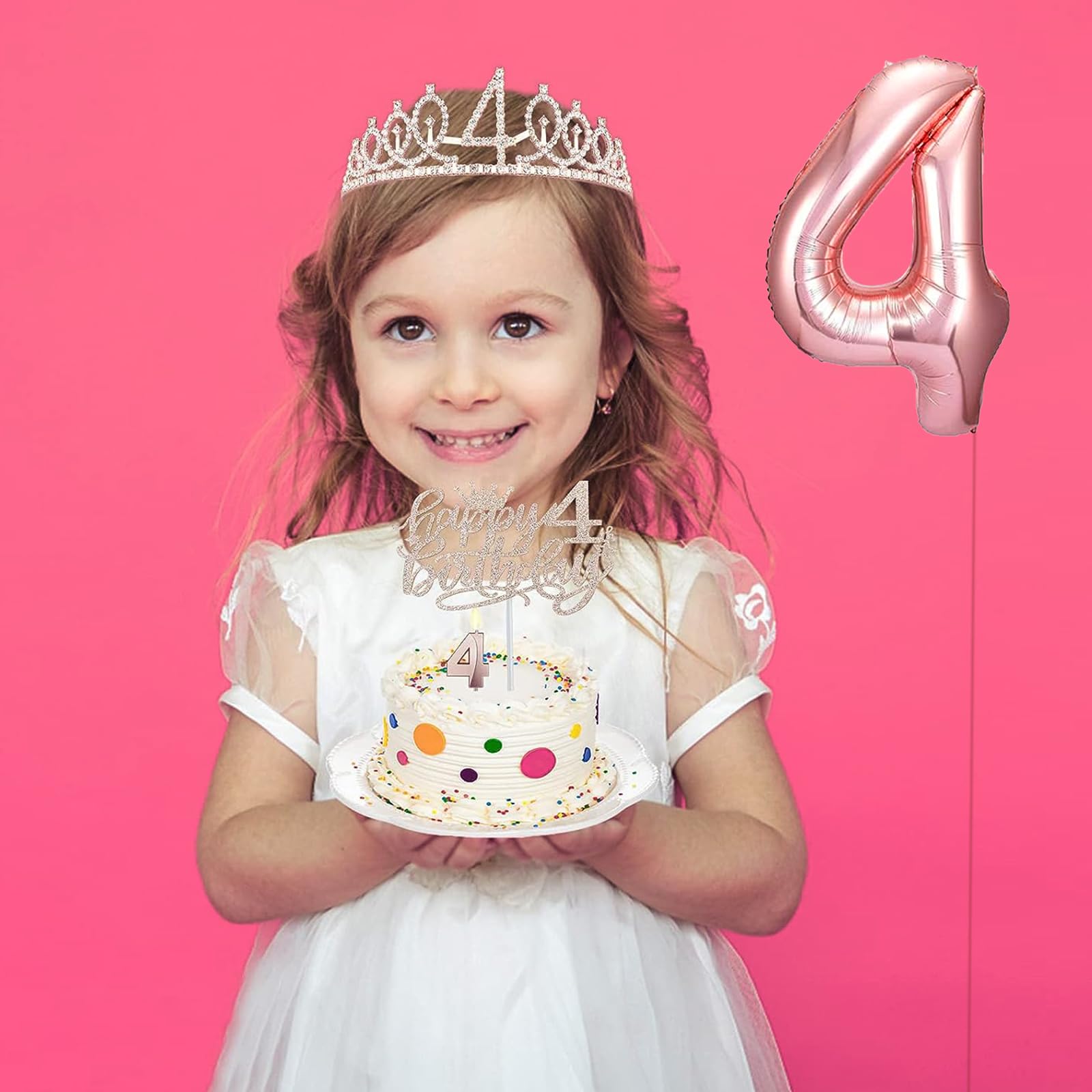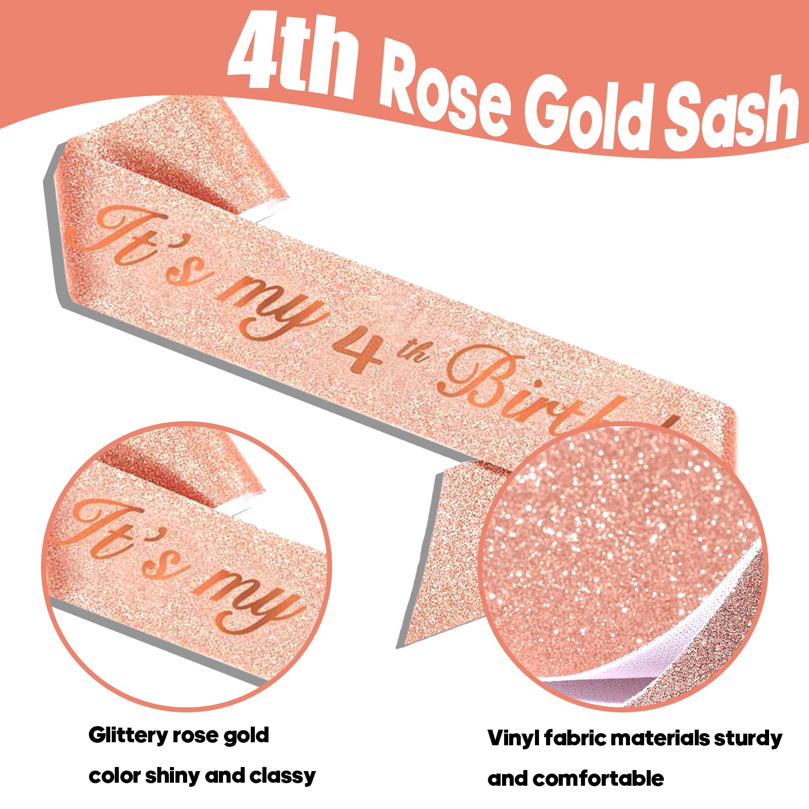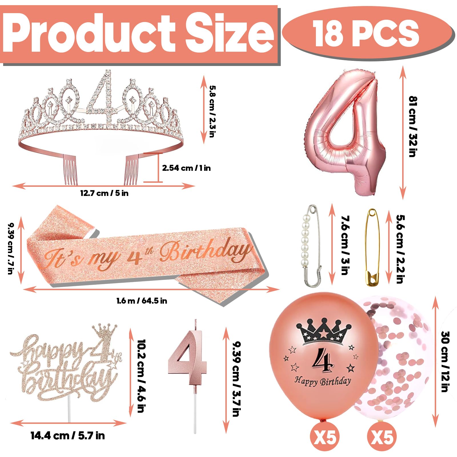 Hysilla 4th Birthday Decorations for Girls, 4th Birthday Sash, 4th Birthday Crown, 4th Birthday Cake Topper, Balloons, Pin and Candle Set, Rose Gold