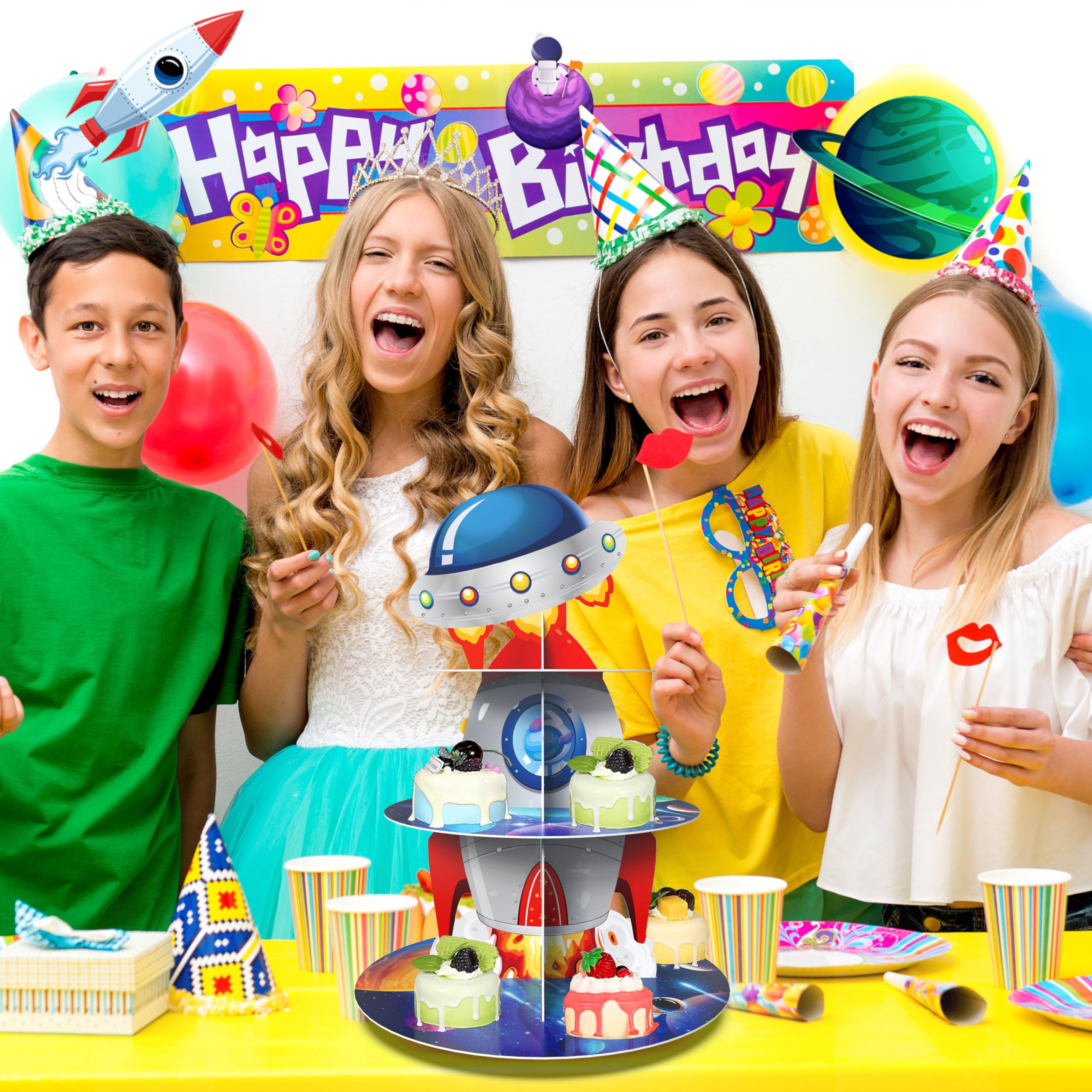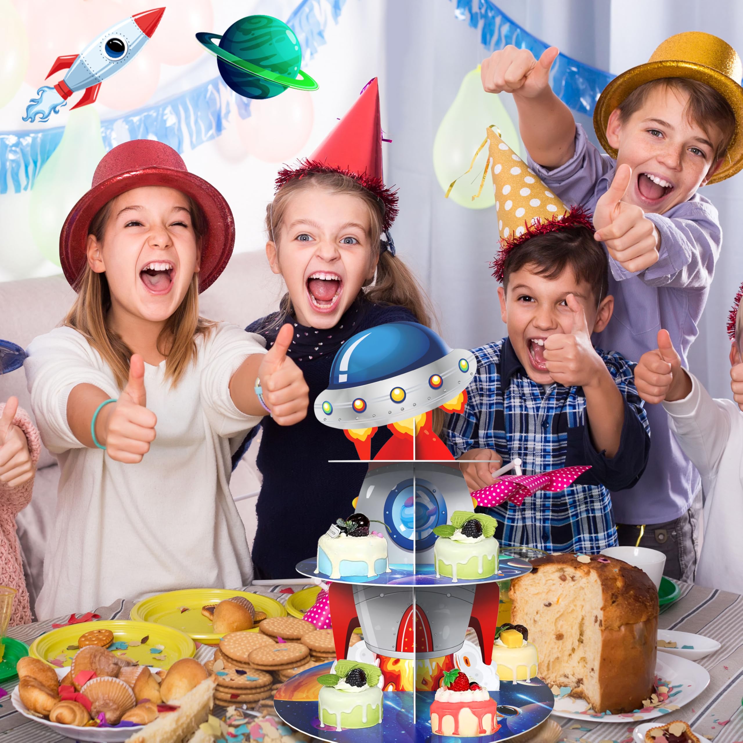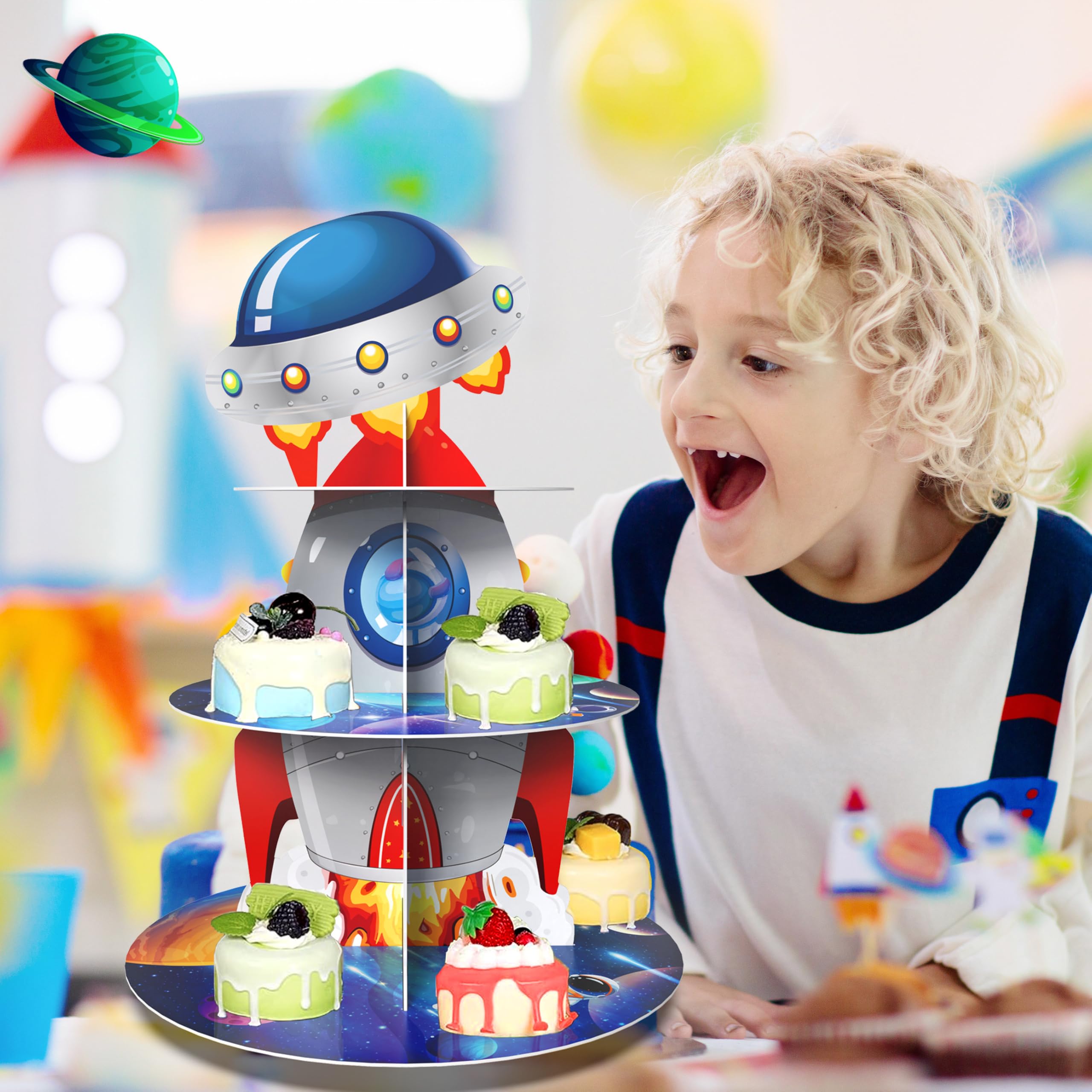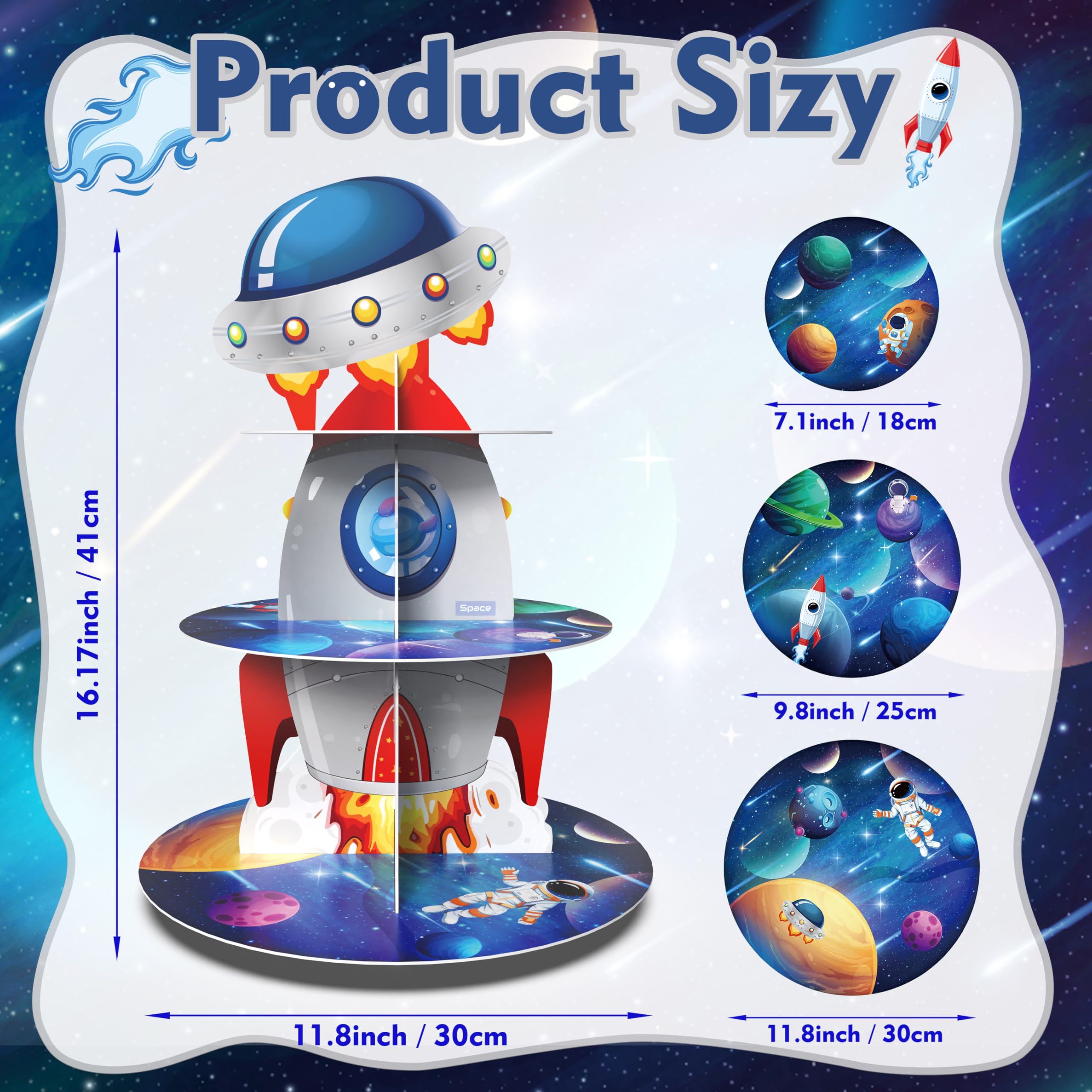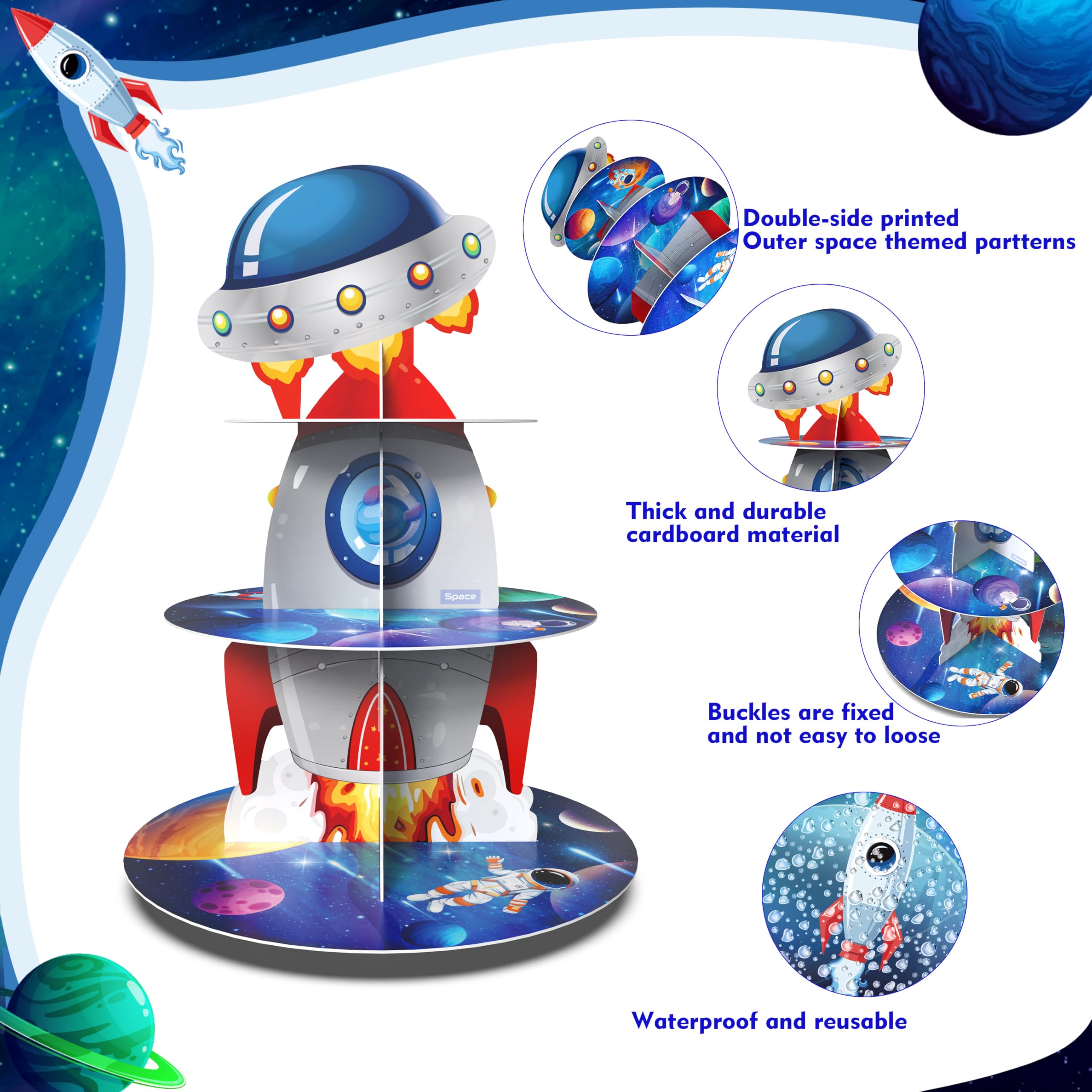 【Exquisite Design】: our rocket space cupcake stand designed to decorate space theme party; Designed with astronauts,rockets,outer planet spacecraft,planets,galaxy and stars on the vast universe background, it is ideal for decorating at kids party,create memorable outer space atmosphere