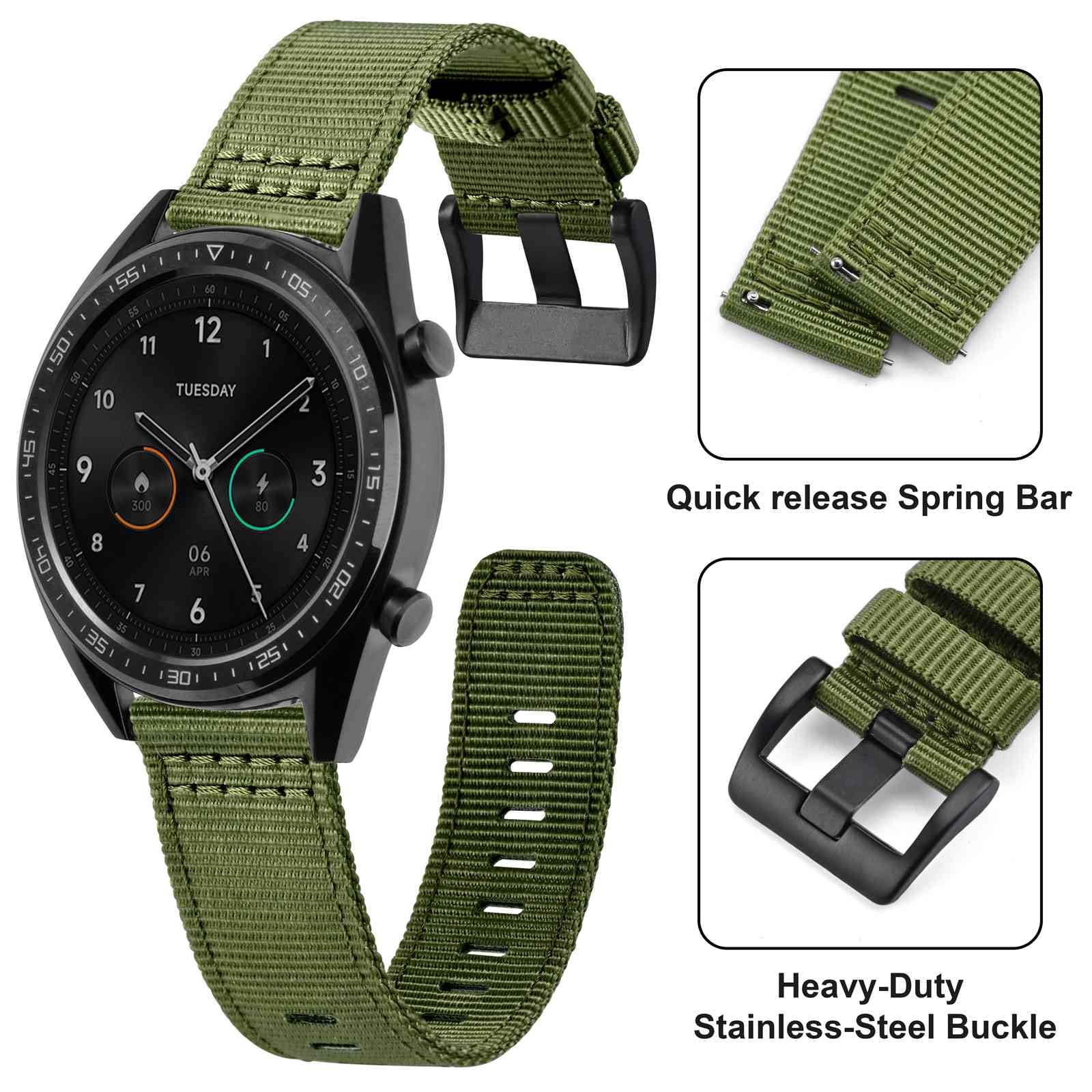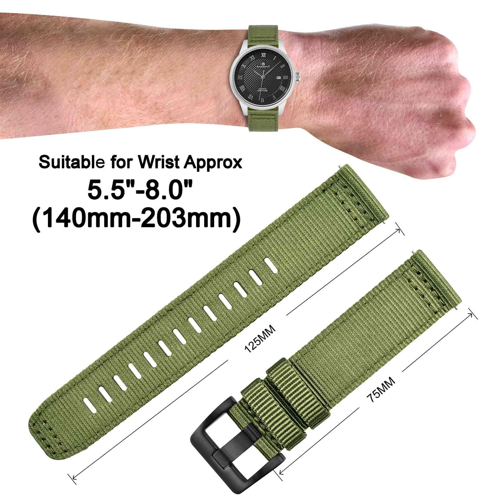 Premium Materials: This watch band is made of tightly weave nylon fabric, double layer (2.2mm), very durable, comfortable and breathable, fabric is waterproof, fully washable. Heavy-duty stainless-steel buckle in a brushed finish