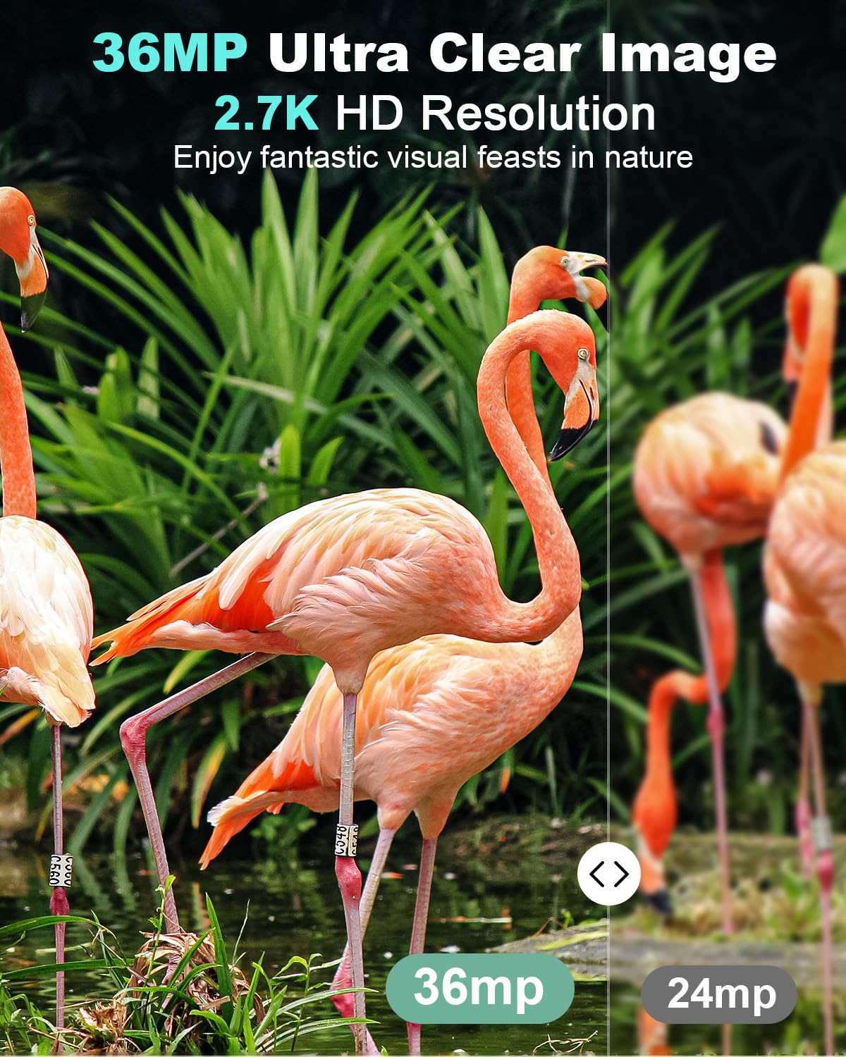 【Ultra-clear Photos and Videos】36MP Still Images & 2.7K Videos. Thanks to premium optical lens and an advanced image sensor, and built-in 22Pcs 850nm low glow LEDs, this trail camera provides crystal clear images and amazing smooth 2.7K videos with sound in the daytime, low light or nighttime, combined with noise reduction speaker and 2.0” HD TFT Color Screen, which takes you into the world of wildlife.