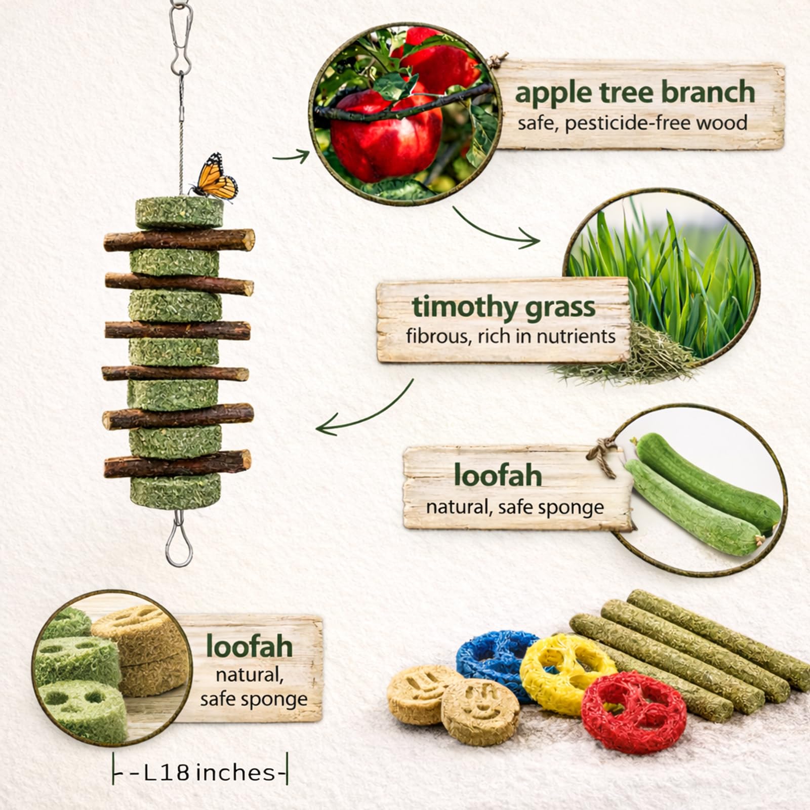 【NATURAL MATERIAL 】 All toys are made of natural materials such as apple wood, loofah,timothy grass,wood vines,very safe for your lovely pets to play and chew. there materials are not only rich in fibers can clean your pet’s tooth,promote digestion,but also excellent toys for exercising and relieving stress