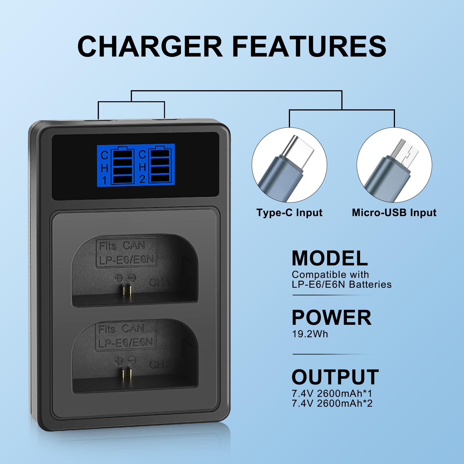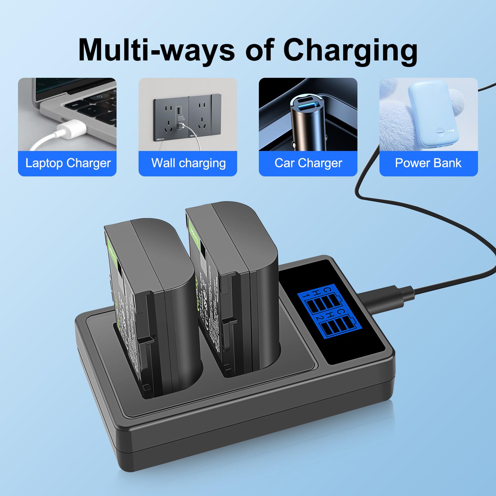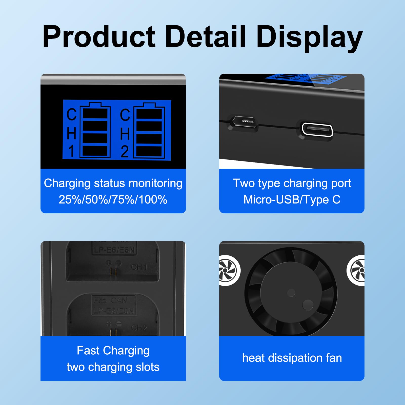 This charger With a Type-C & Micro-USB input port and a Micro-USB Extra Cable that can be connected with any power source with 5V USB Port, laptop ,USB wall charger, car charger or an power bank etc.The charger LCD display shows the charging status of each battery,Dual Charging Slots charger can charge 2pcs batteries simultaneous.