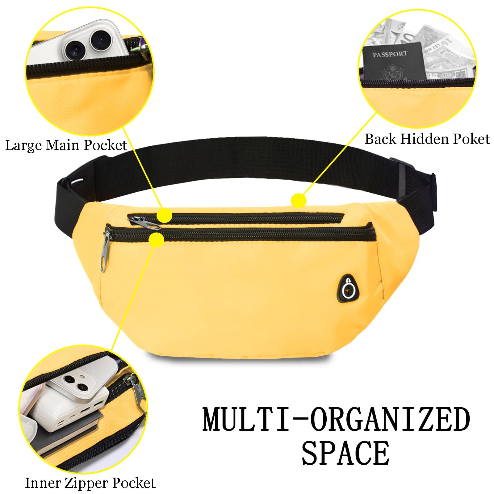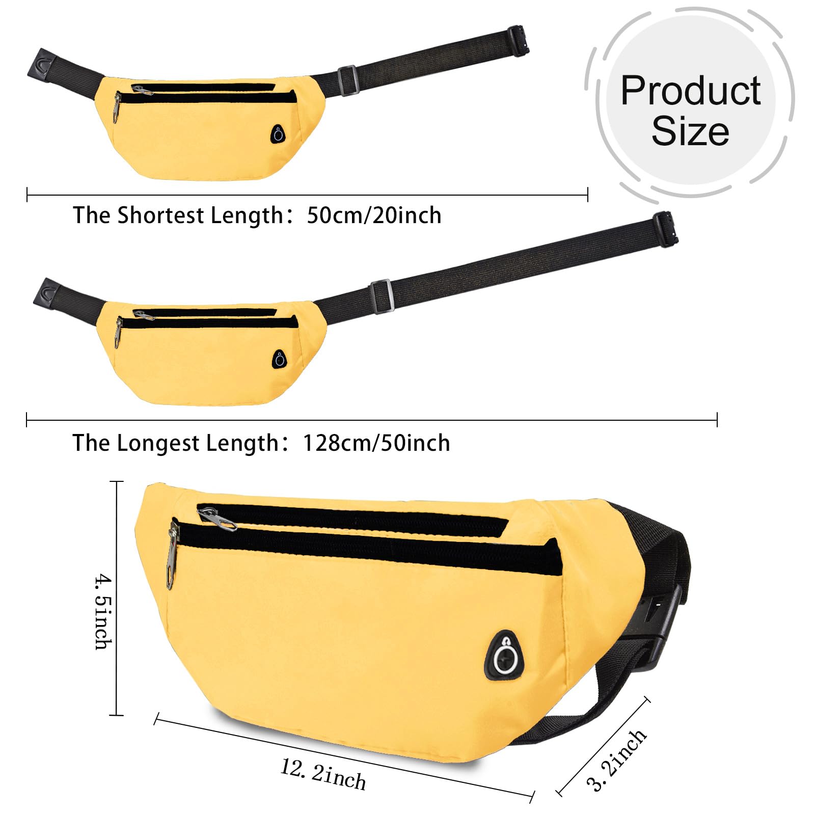 Large Capacity:The Fanny Pack size is about 12.2"x4.5" x 3.2" with 3 zippered pockets,Include main pocket,front pocket and back pocket.You can put your mobile phone, key, headset, headset, sunglasses, cosmetics, wallets, passports, etc.