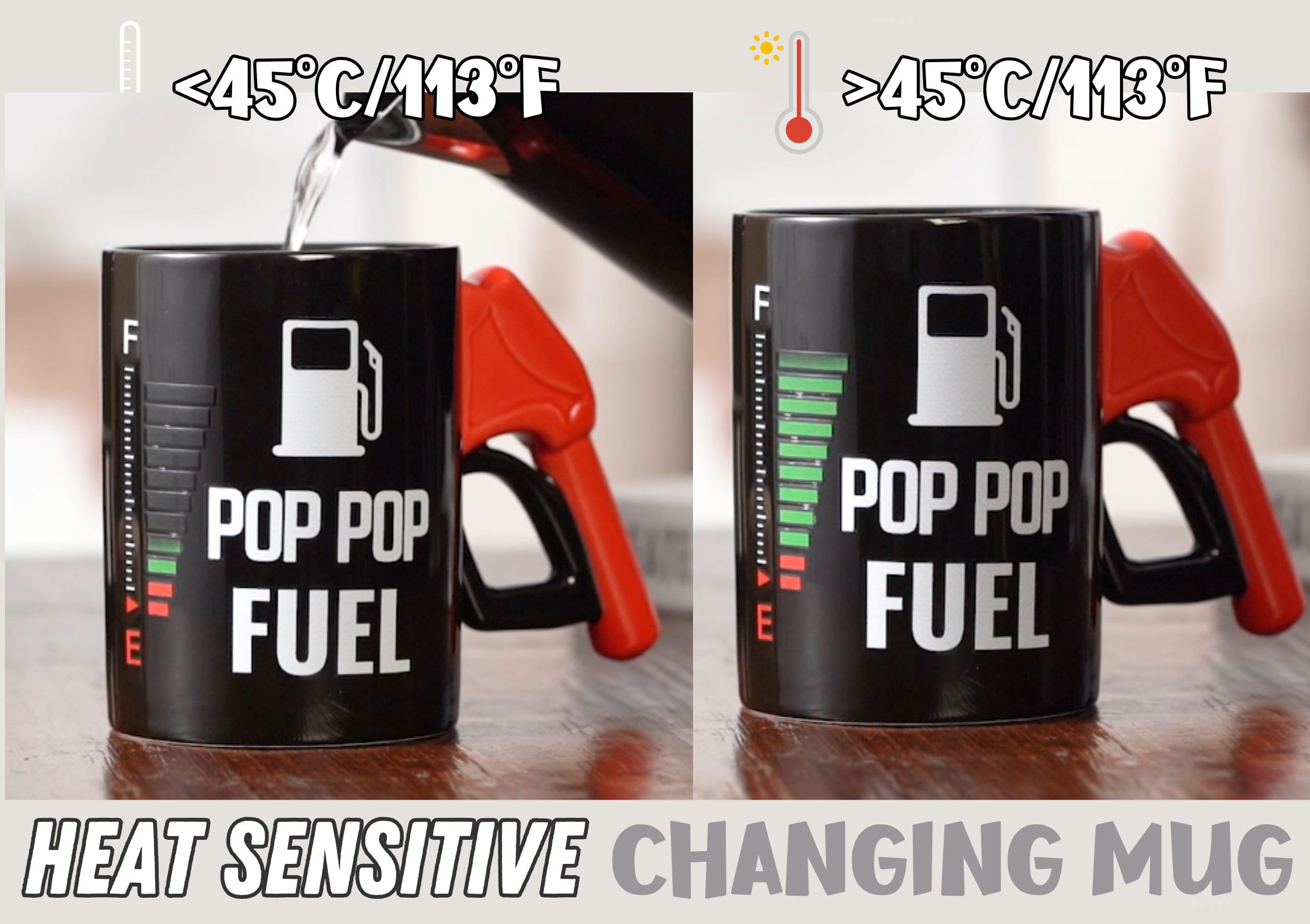 Unique Fuel Nozzle Handle & Color-Changing Magic: Cleverly designed with a gas pump handle and a heat-reactive "fuel gauge" that fills up when 113°F+ liquid is poured in.