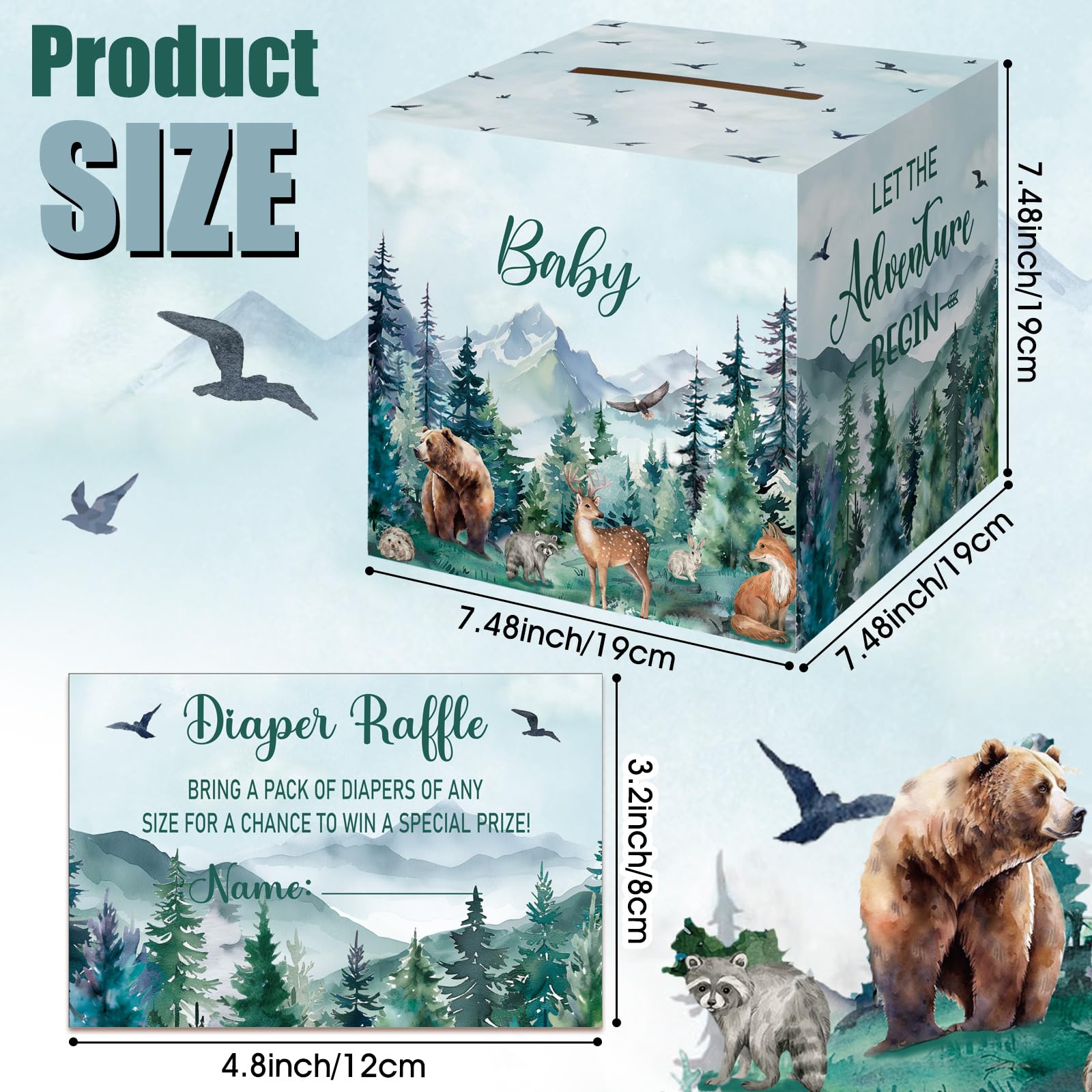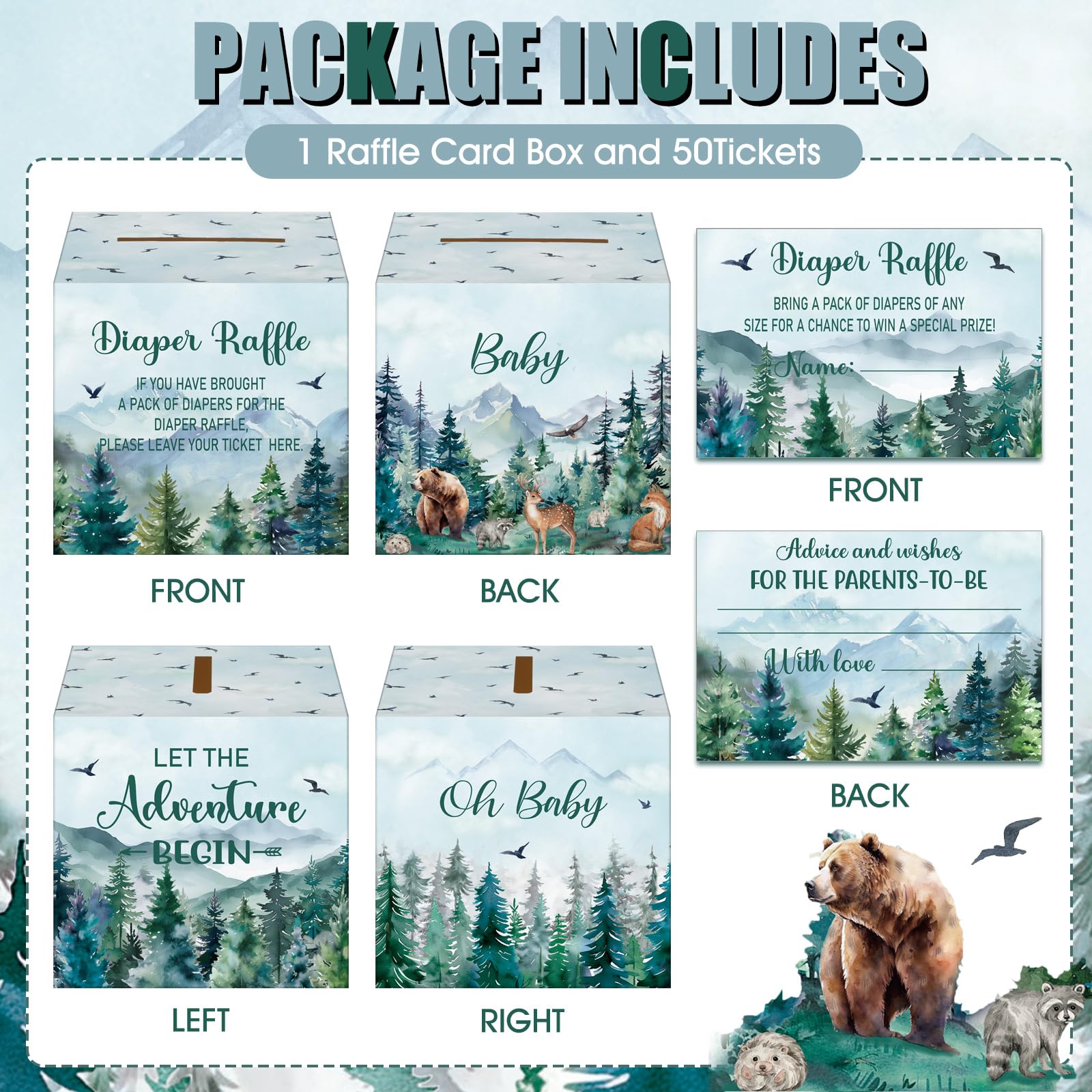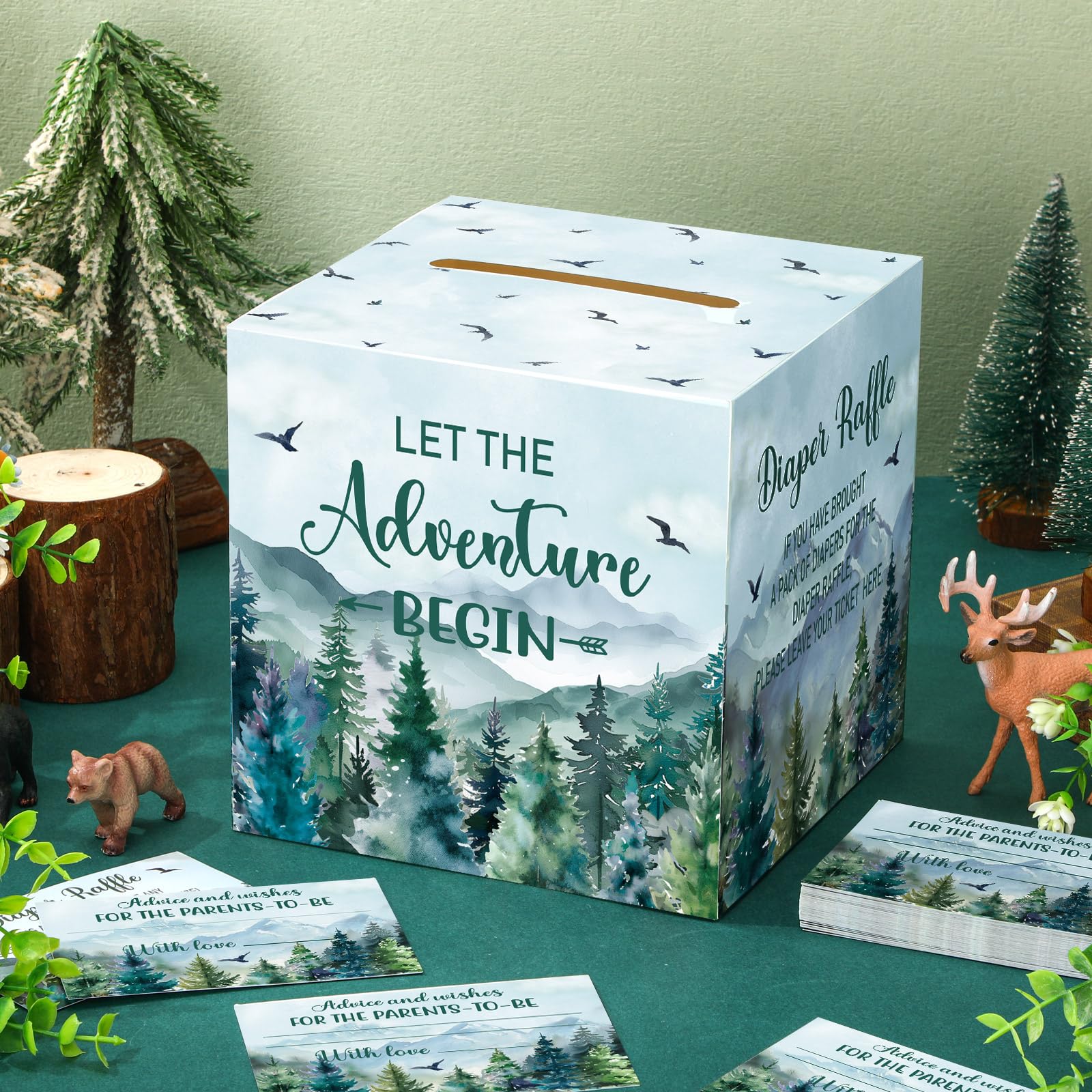 Adventure Awaits Themed Design: the let the adventure begin baby shower decorations are designed in the theme of tree mountain wilderness diaper raffle, and printed with relative words and patterns, such as foest, flying birds and more, delicate and adorable, creating a warm and joyous atmosphere