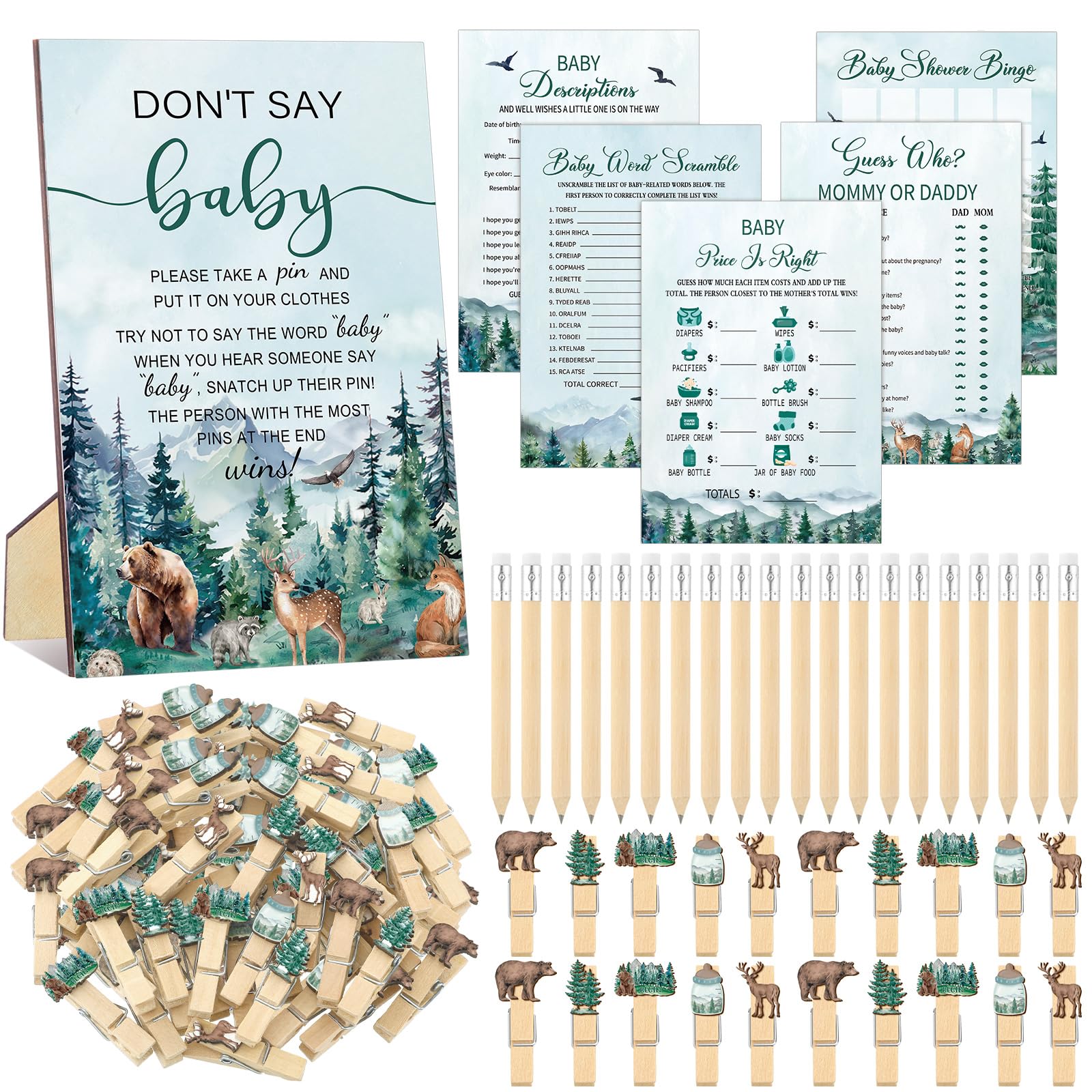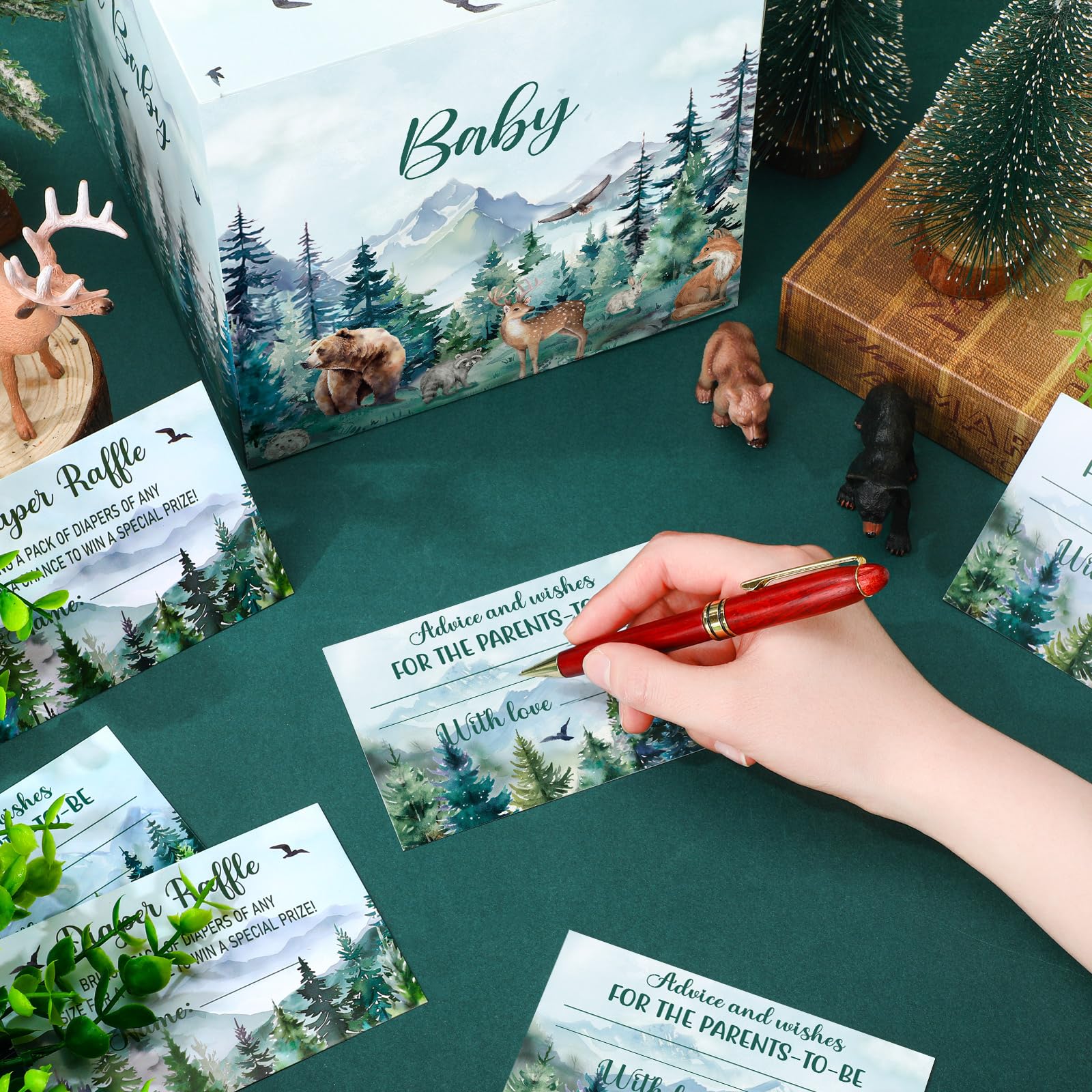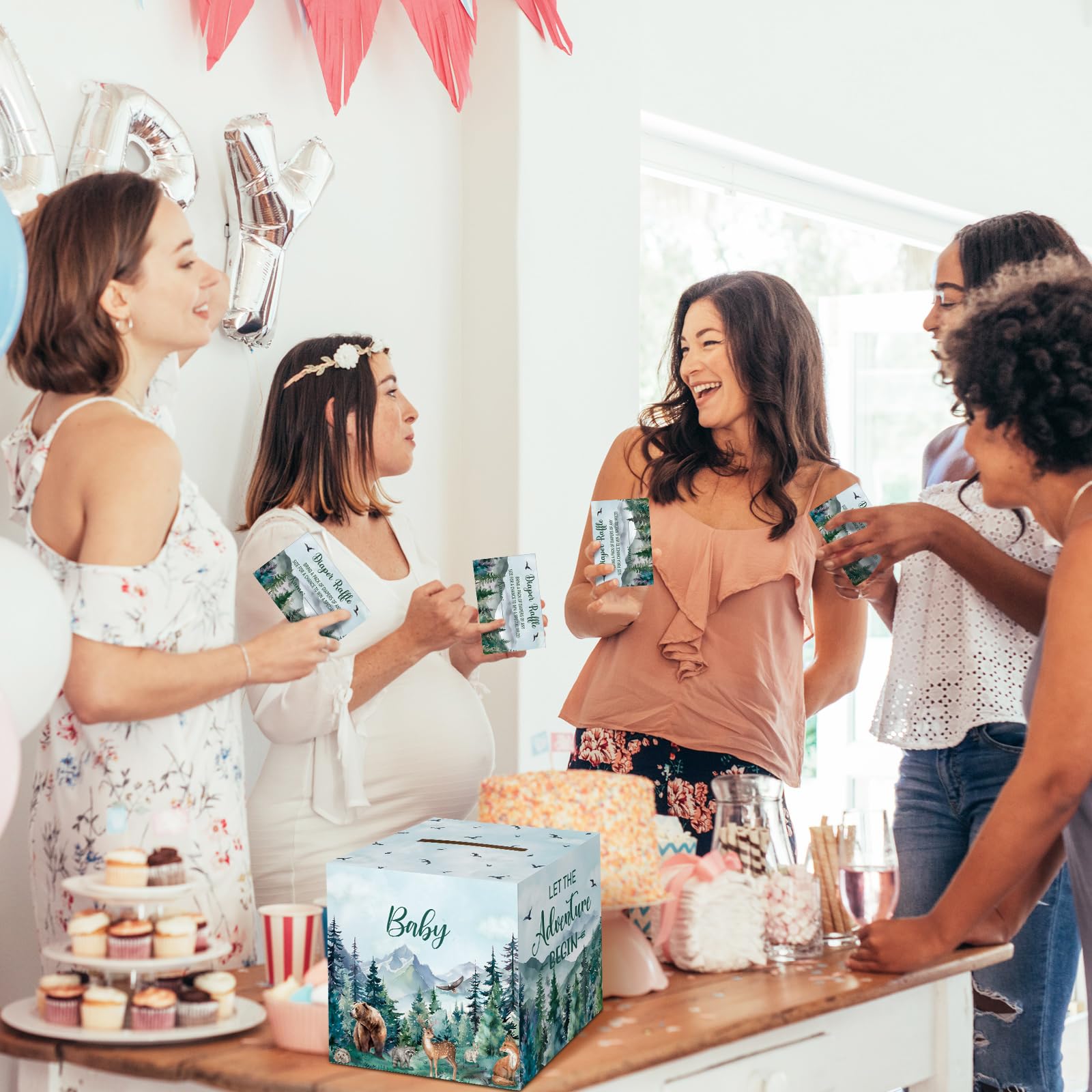 Adventure Awaits Themed Design: the let the adventure begin baby shower decorations are designed in the theme of tree mountain wilderness diaper raffle, and printed with relative words and patterns, such as foest, flying birds and more, delicate and adorable, creating a warm and joyous atmosphere