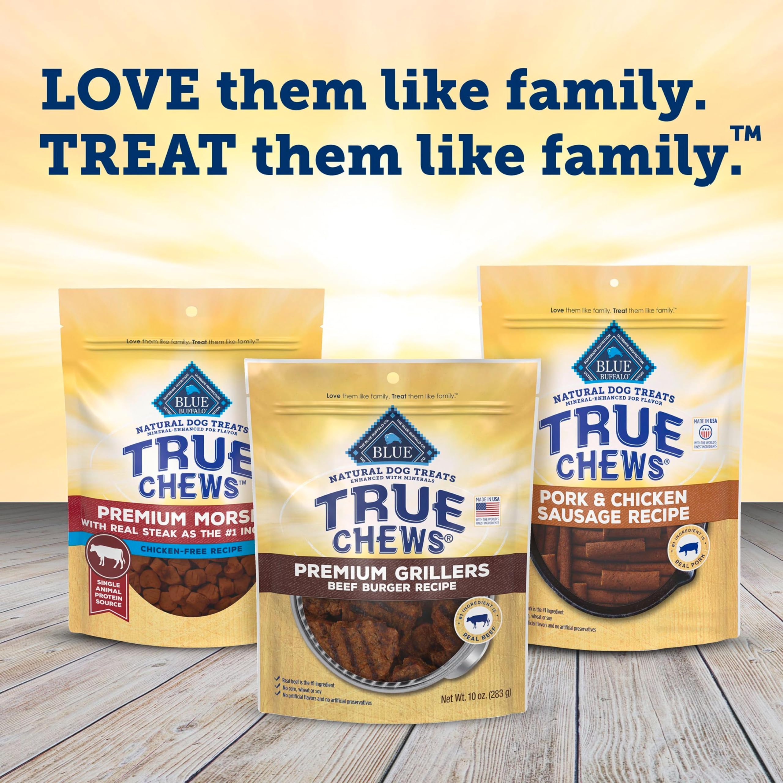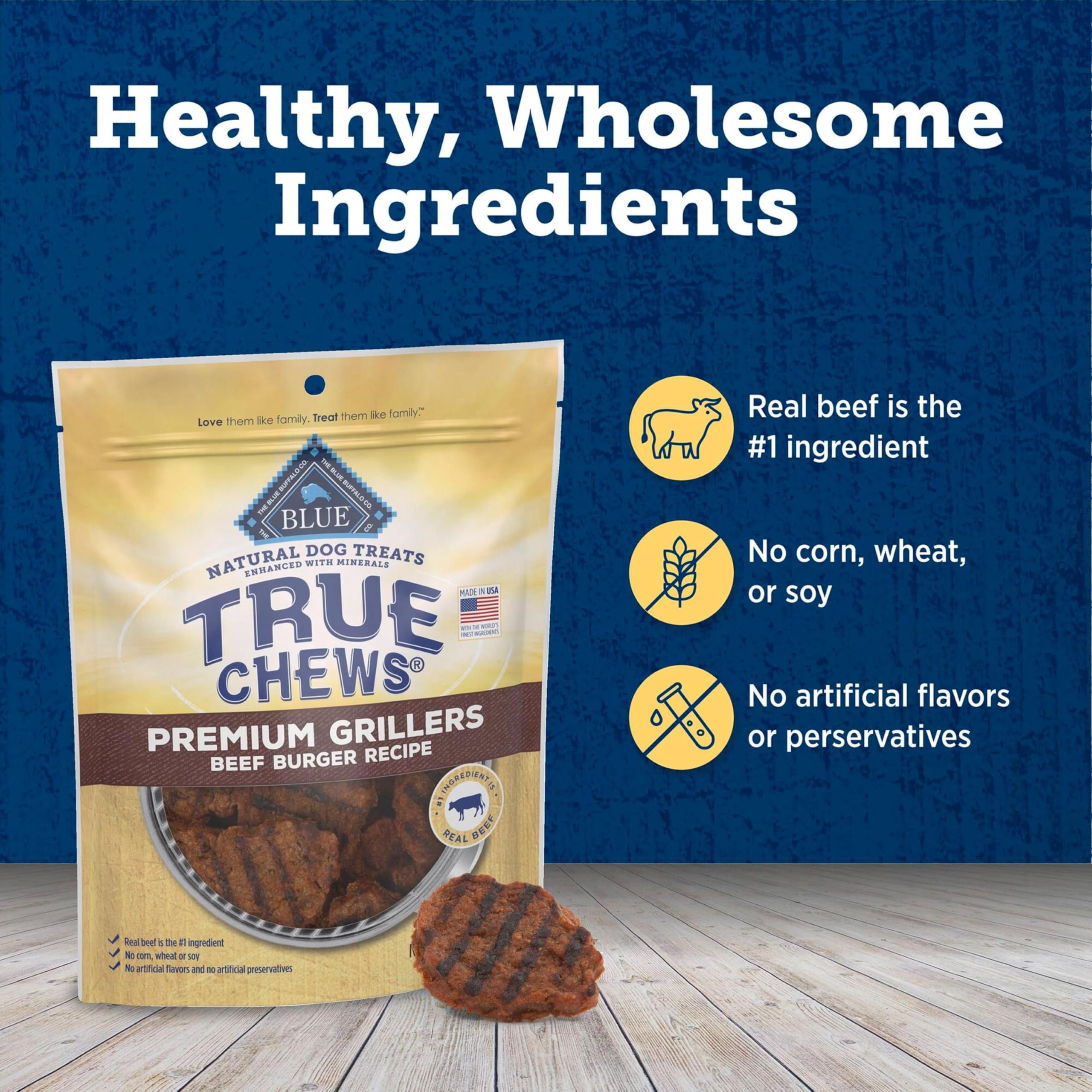 Contains: One (1) 10-oz bag of BLUE True Chews Natural Chewy Dog Treats; Beef Burger Recipe