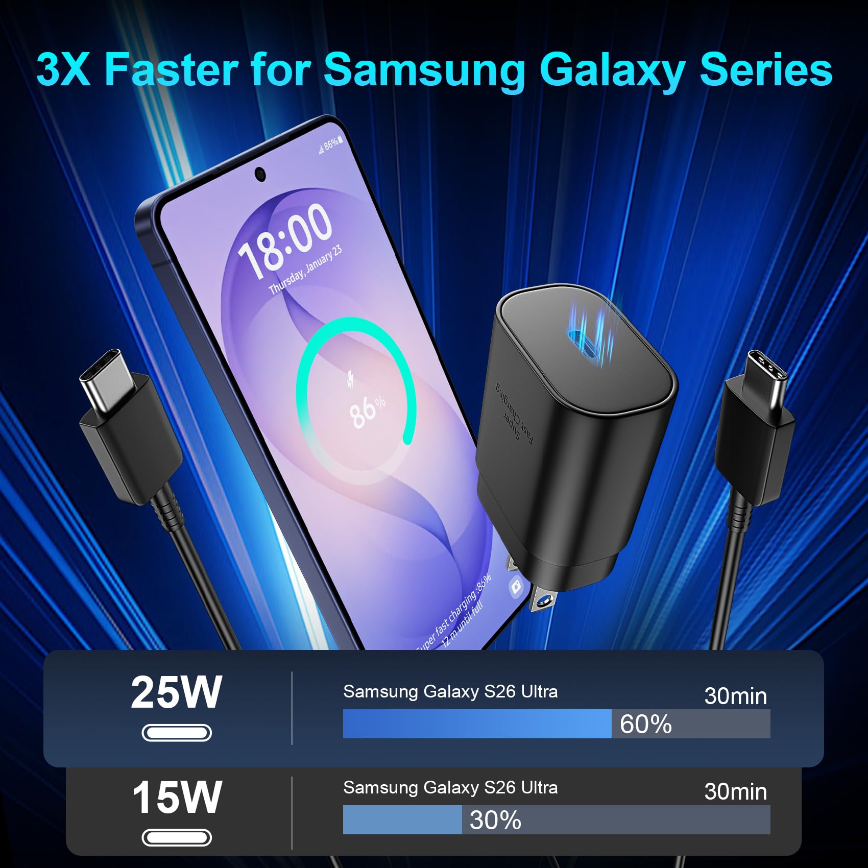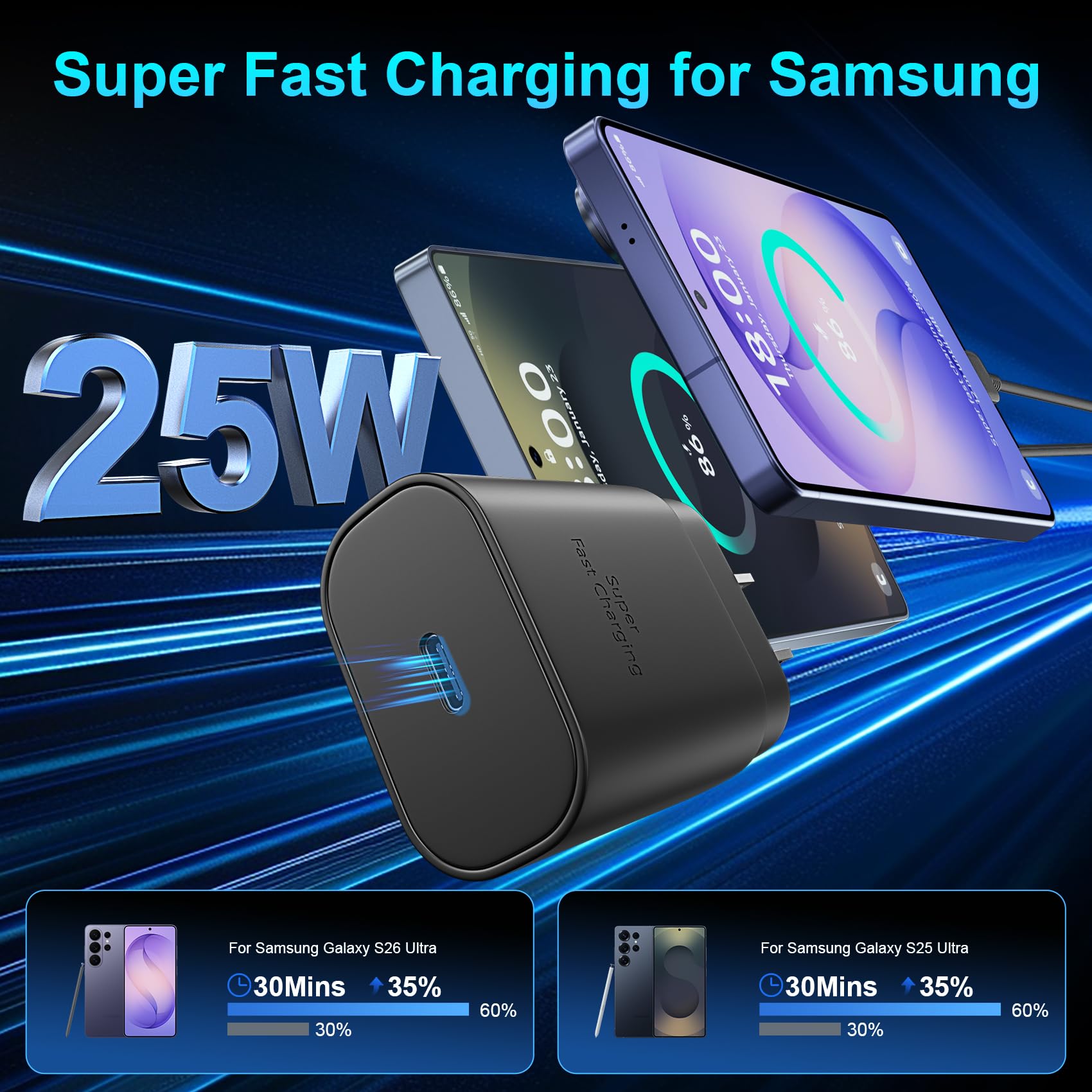 Small & Powerful: With 25W charging power but smaller size, this Samsung charger fast charging cord is more convenient and portable. Equipped with a type c port, you can charge your device back to full power in no time by using the 25W USB C fast charger for Samsung Galaxy S26 S25 series. It only takes 30min to charge your Samsung Galaxy S26/S25/S24/S23 ultra from 0 to 60%, 5 times as fast as standard USB C charger.