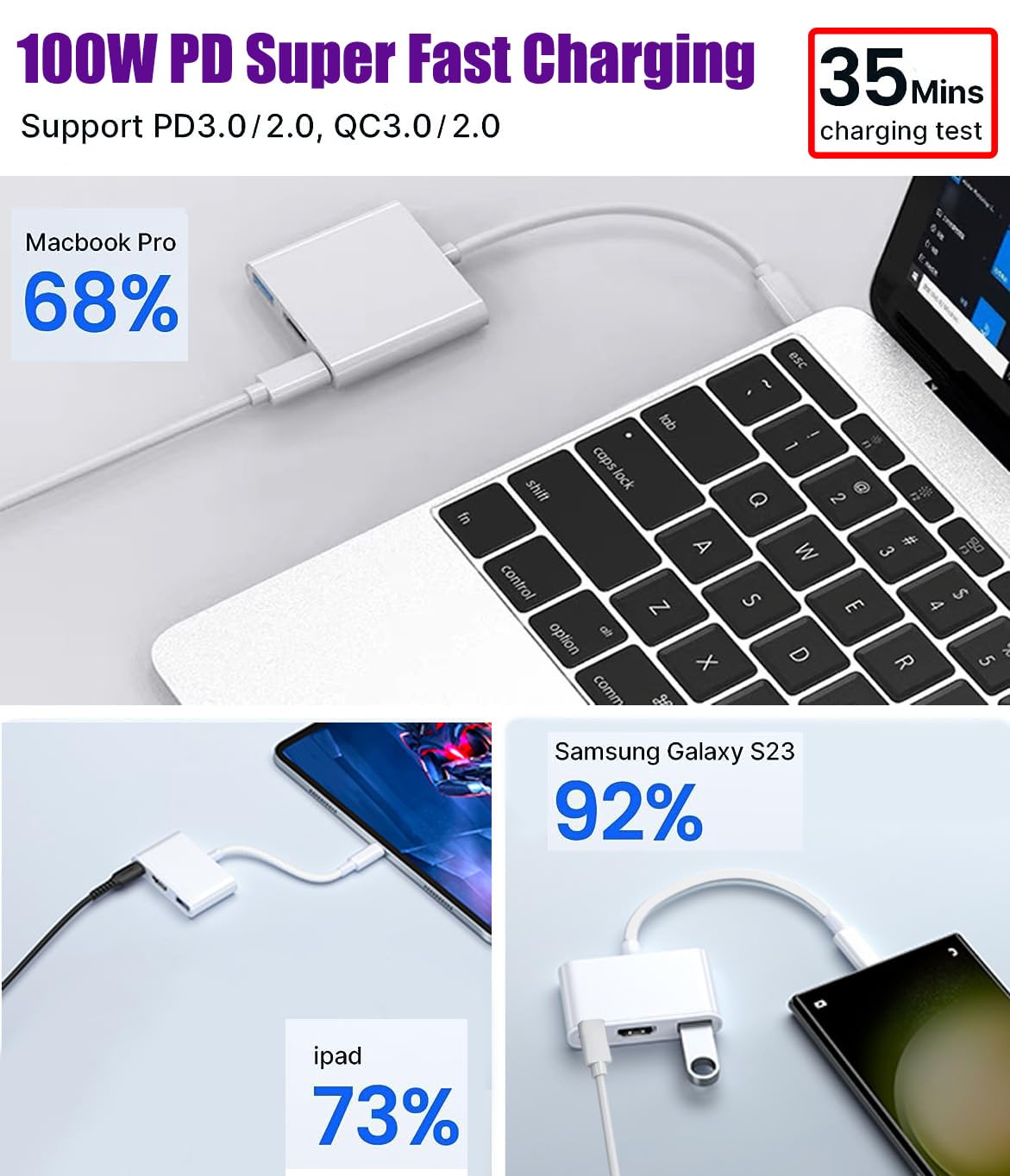 USB-C 100W PD Input: The USB-C Port Supports Up to 100W Fast Input Charging For Your USB-C Port Laptop/Tablet/Smartphone. (Note: Actual Charging Speed May Different, Depending On The Device Charging Cable, Charg ing Adapter, Voltage Level)