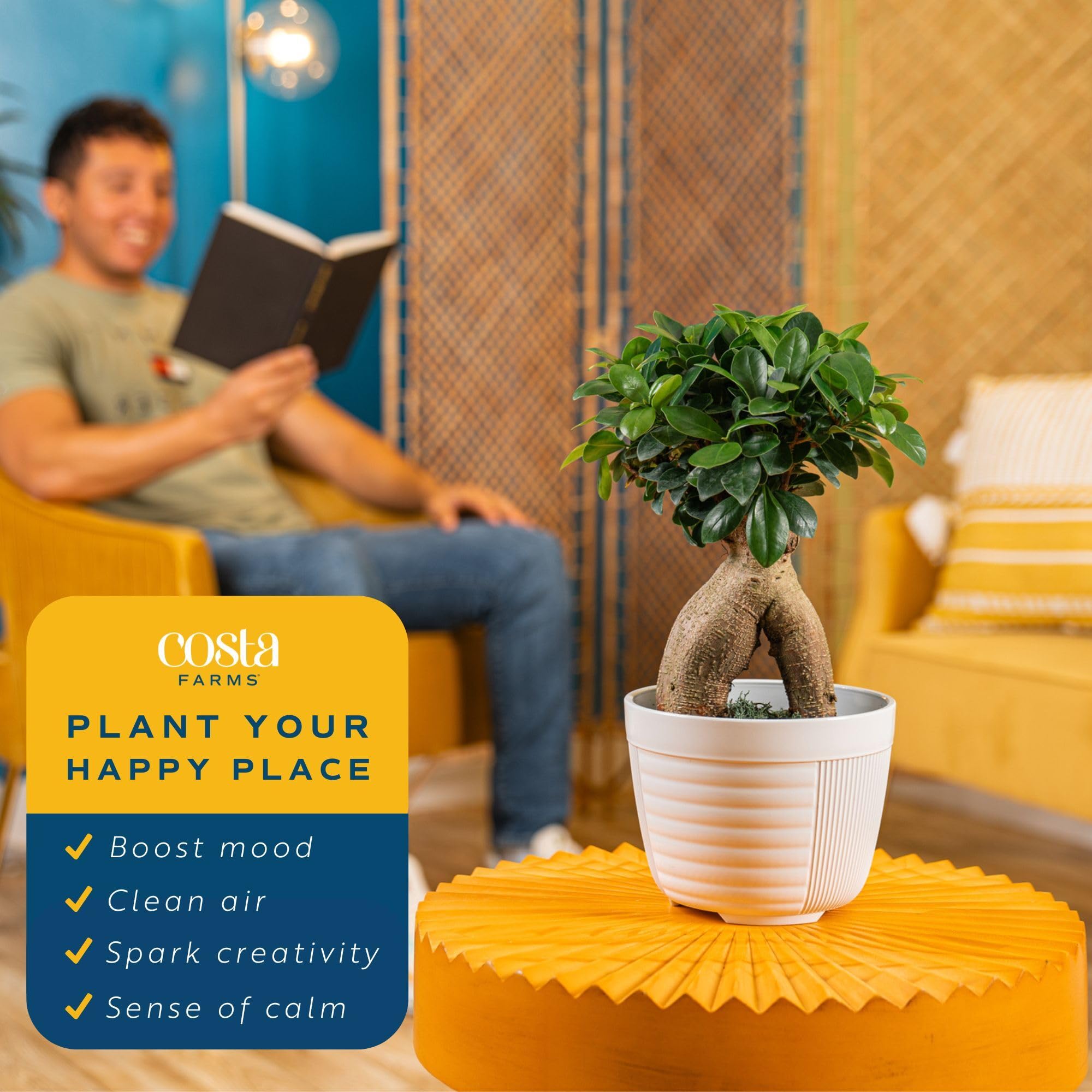 BONUS! A ZENLIKE DECORATOR POT: Mini Ficus Bonsai comes planted in a 3.75-inch white ceramic planter. These tiny trees are grown and carefully clipped to their unique shapes by the horticultural experts at Costa Farms.