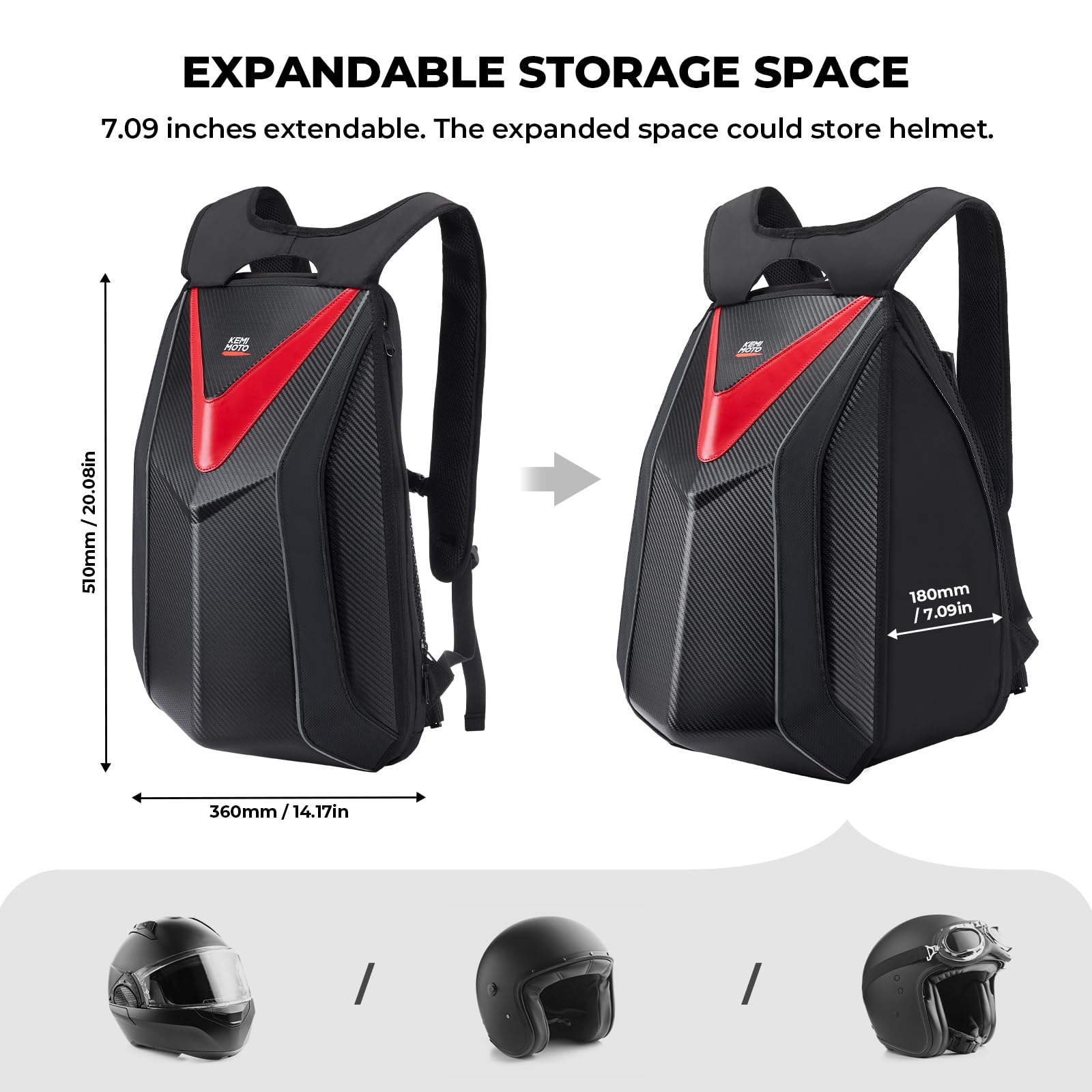 EXPANDABLE STORAGE - The size of the motorcycle riding bag is 20*14*7 inches.The bottom extendable length is 7.09 inches. There is an expansion zipper on the backpack. Open the zipper to get more storage capacity to hold a helmet.