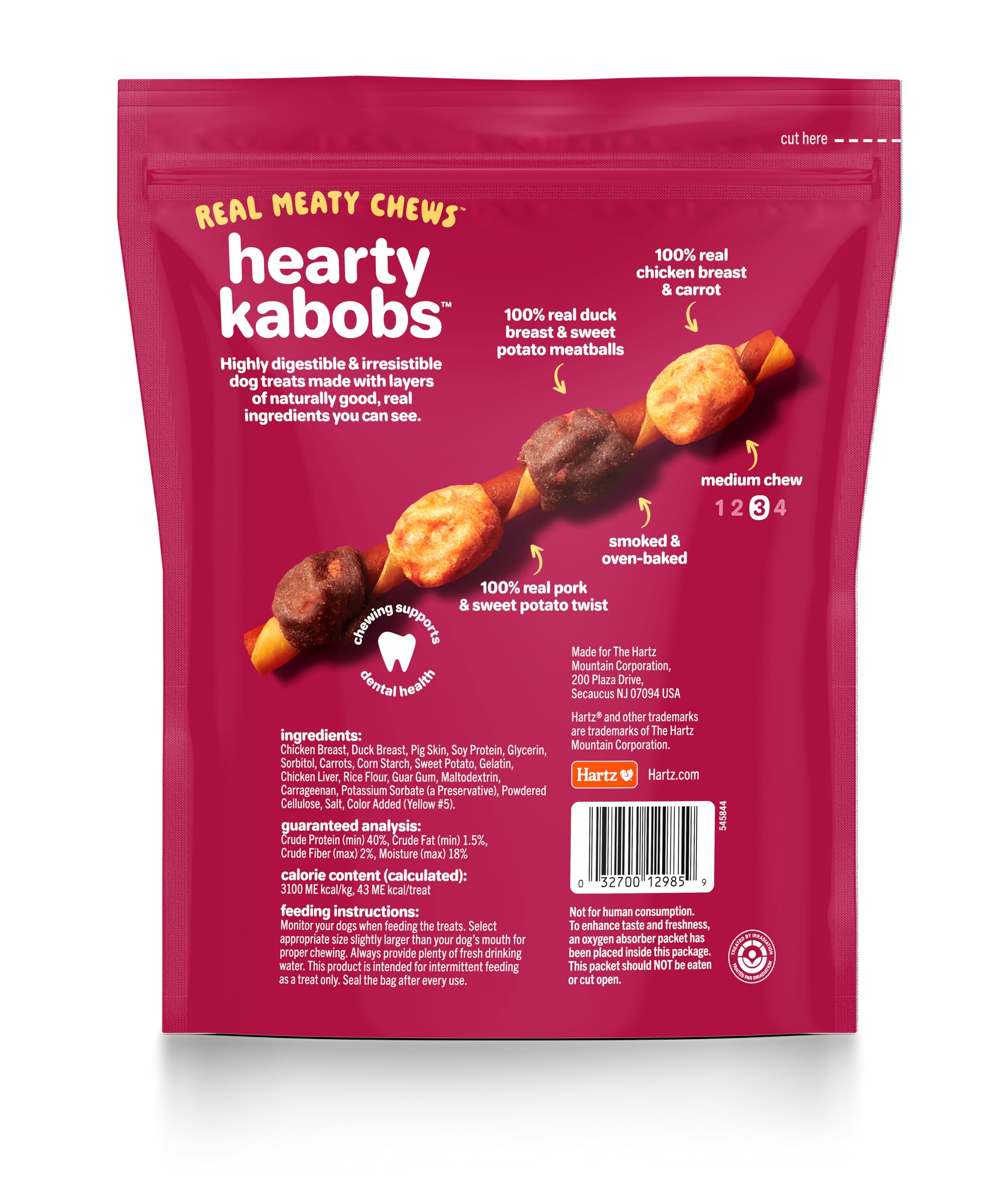 Hartz Oinkies Meathouse 'n' Veg Hearty Kabobs are highly digestible and irresistible dog treats made with layers of naturally good, real ingredients you can see. Does not contain beefhide or beef rawhide, the real pork and sweet potato twist core is loaded with chunks of real chicken breast & carrot meatballs and real duck breast and sweet potato meatballs. These dog treats are smoked and oven-baked to lock in that delicious flavor your dog will go crazy for! Oinkies Hearty Kabobs are considered a medium chew.