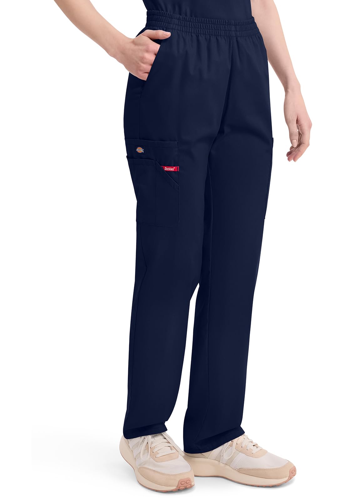 Description Dickies EDS Signature Nurse Scrubs for Women | Classic Elastic Waist Styling Medical workers are passionate, tough and strong. Made with these workers in mind, Dickies EDS Signature scrubs have the strength and endurance to stand up to multiple wears on the job and many washes in between. Our Modern Classic fit uniform scrubs for women are constructed of a soft and durable cotton/polyester blend poplin fabric. These natural rise women's pants feature an all-around elastic waistband and tapered leg. There is a total of seven pockets so you have plenty of room to store your gear: two roomy front slash pockets, two cargo pockets with stretchy knit interior pocket inside right cargo pocket. (Knit pocket is red on all colors except white. White pants have a white knit pocket.) Right cargo pocket features layered accessory pockets and logo twill tape instrument loops for additional storage. Pockets are large enough for iPhone and Galaxy phones. Woven iconic red Dickies horseshoe label on right cargo pocket. Plus size scrubs for women available. For cargo pants women will love, shop the entire Dickies EDS Signature collection. Dickies EDS Signature: Tough and strong, get the job done in Dickies EDS Signature scrubs. Modern Classic fit 55% cotton / 45% polyester brushed poplin Regular inseam = 30 ½" Petite inseam = 28" Tall inseam = 33 ½"