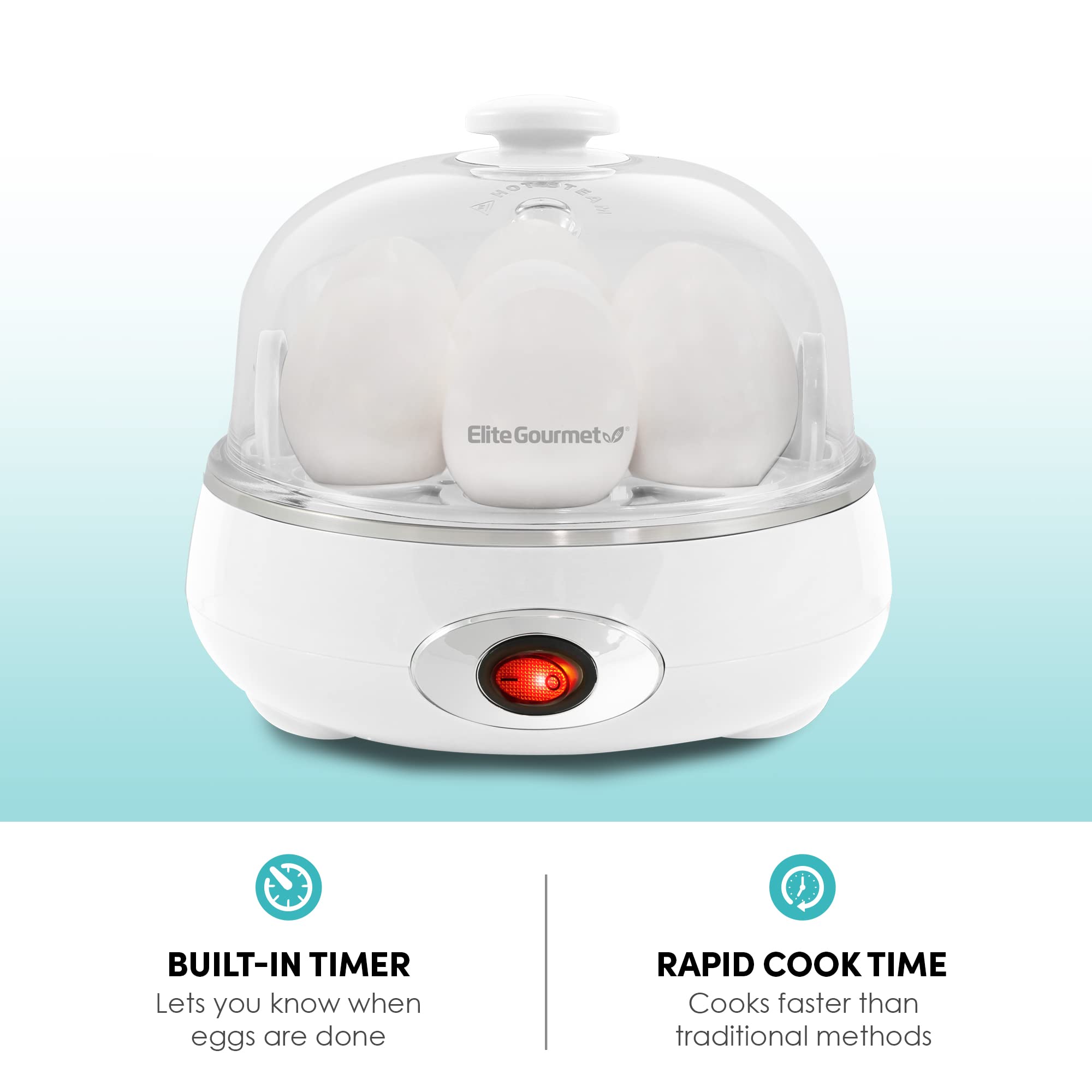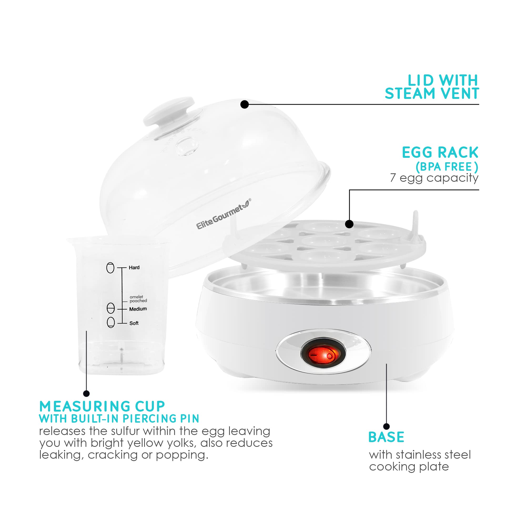 The Elite Gourmet Automatic Easy Egg Cooker cooks up to 7 eggs at one time. Eliminate the guesswork of stovetop boiling by using the included measuring cup which allows you to add the exact amount of water to consistently prepare eggs to your desired style, soft medium or hard boiled. The convenient automatic shut-off indicator light & audible buzzer lets you know exactly when the cooking cycle is complete. The built-in timer adjusts automatically from soft to hard and cooks eggs exactly to your liking! The included measuring cup has a built-in piercing pin to pierce the egg shell and prevent cracked shells during cooking. This also releases the sulfur within the egg which results in consistently perfect golden yellow yolks. Prepare quick and healthy breakfast meals or even just snacks for the whole family! Designed to make busy mornings easier and to save you time & money. The Elite Gourmet Easy Egg Cooker can quickly boil eggs in the morning while you are brushing your teeth! Just add eggs & water then push the power button and within minutes your eggs will be ready! After cooking, use the egg tray handles to hold the egg tray under cold water to rinse and cool down if you need to peel them right away. Pair your boiled eggs with toast and avocado for a hearty breakfast or brunch. Prepare deviled eggs for you, two or the office potluck. Included with your purchase: Egg Cooker Base, (dishwasher safe parts include 7 egg tray, clear lid and measuring cup with piercing pin). Also included with the Instruction Manual are 16 delicious recipes. Do not use outdoors.