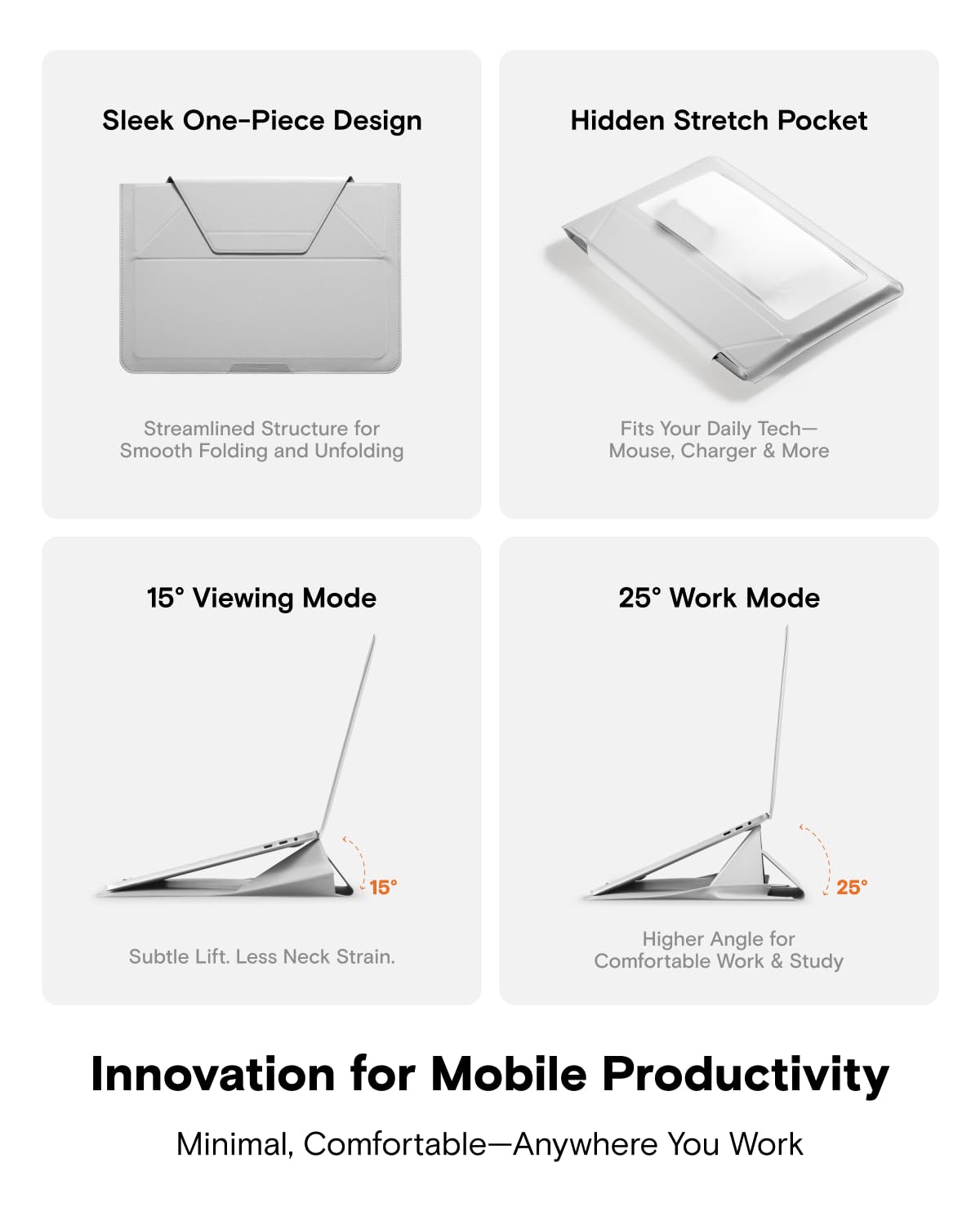 Two Angles Laptop Sleeve Stand: Instantly convert this sleek Laptop Sleeve into a sturdy Laptop Stand. Features dual-angle adjustment (15° for typing; 25° for viewing) to elevate your screen, reducing neck/wrist strain from poor posture. More than a protective Laptop Bag, this ergonomic Computer Bag works anywhere – transforming your carry sleeve into a pain-relieving workstation.