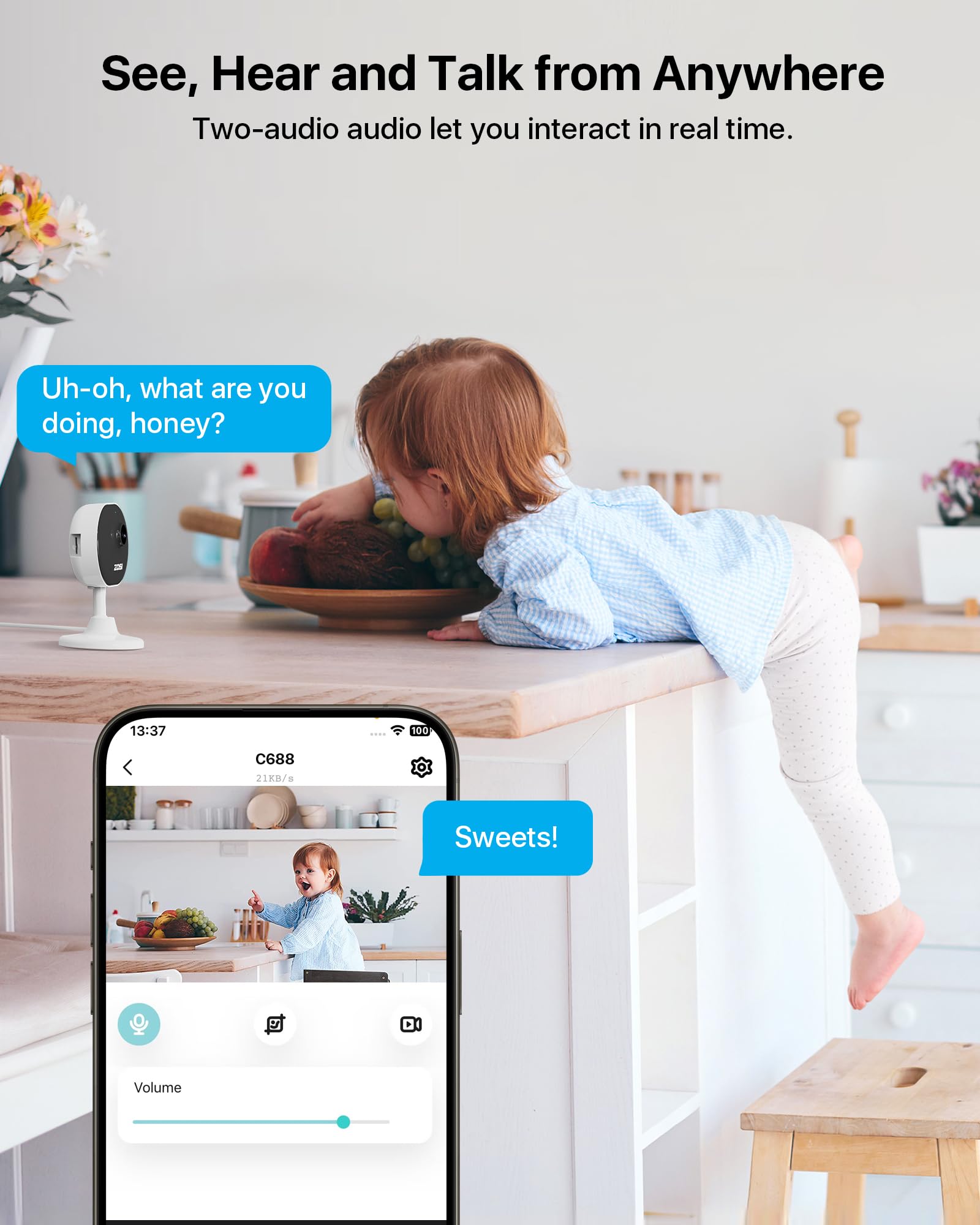[1080PHD & Night Vision] ZOSI C688 indoor camera with clear 1080P high-resolution video that provides clear images day and night. With up to 33ft night vision, you can see crystal detailed visuals to keep your house safe even at night. And it let you to easily see what your baby or pet is doing even in low light conditions.