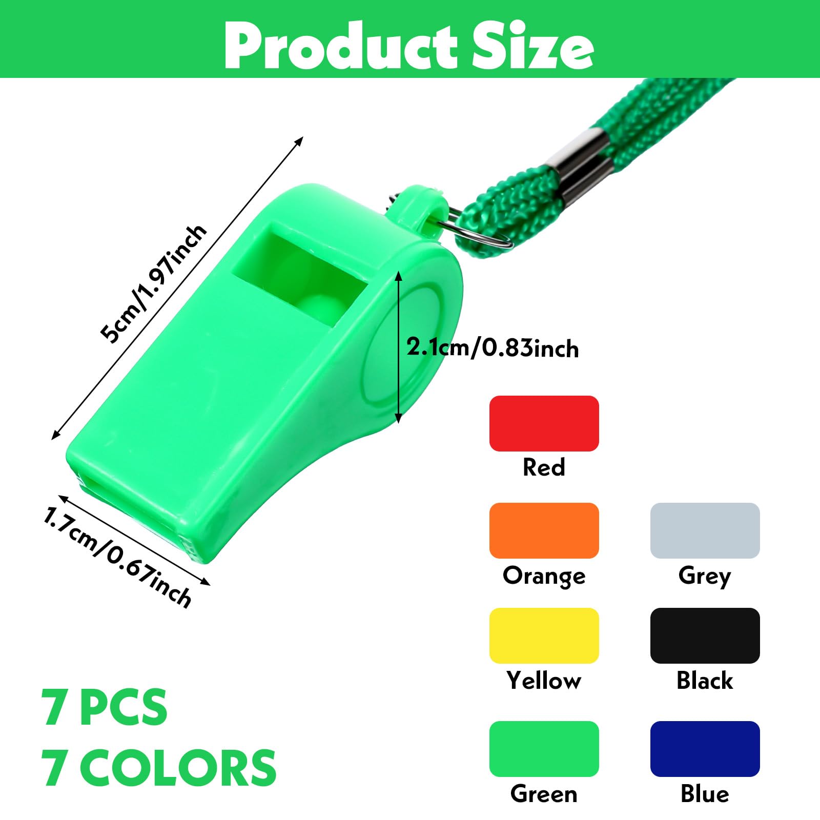 Category: Whistle with lanyard Color: Red, yellow, blue, green, black, gray, orange Material: ABS plastic Function: Referee whistle Product Size: 2 × 0.82 × 0.66 inches/5 × 2.1 × 1.7 cm Lanyard Length: 18.50 inches/47 cm Packing List: 7pcs × soccer whistles