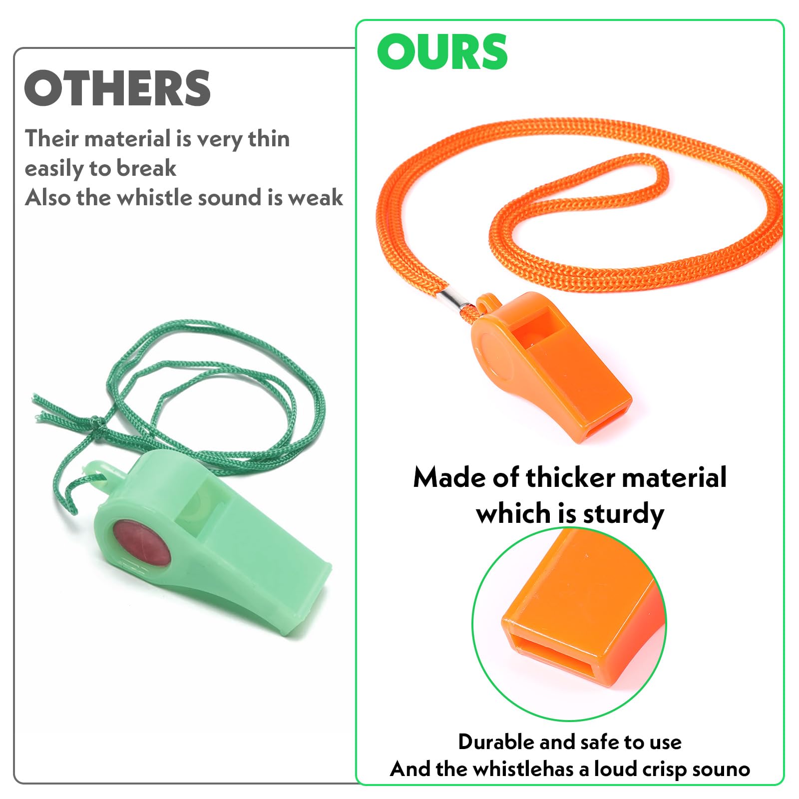 Durable & High-Quality Material: Made of thickened non-toxic food-grade plastic, the kids whistle is sturdy and durable. Unlike other plastic whistles on the market, it is designed to last for years. The coaches whistle with lanyard has solid construction and won't rust or corrode, ensuring it remains in excellent condition for long-term use.