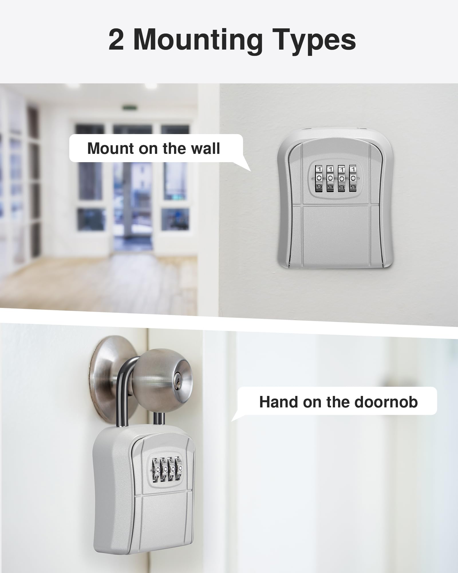2 Installation Methods: It comes with a removable lock shackle so you can hang the portable lock box on a door knob or someplace. Or you can securely mount it on the wall of your home or office with the provided 4 screws and 4 expansion plugs. (Notice: Please open the lockbox to find the removable shackle.)