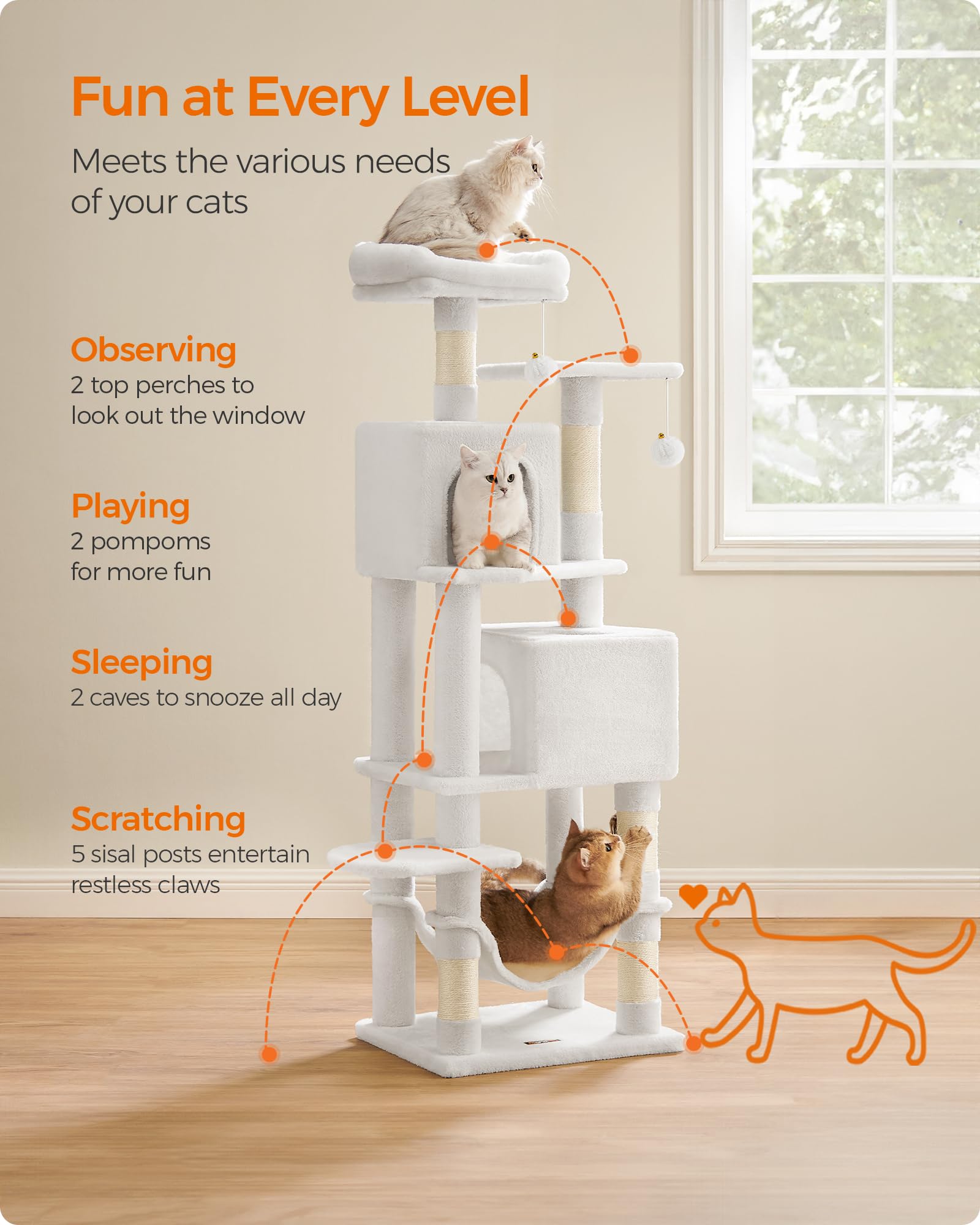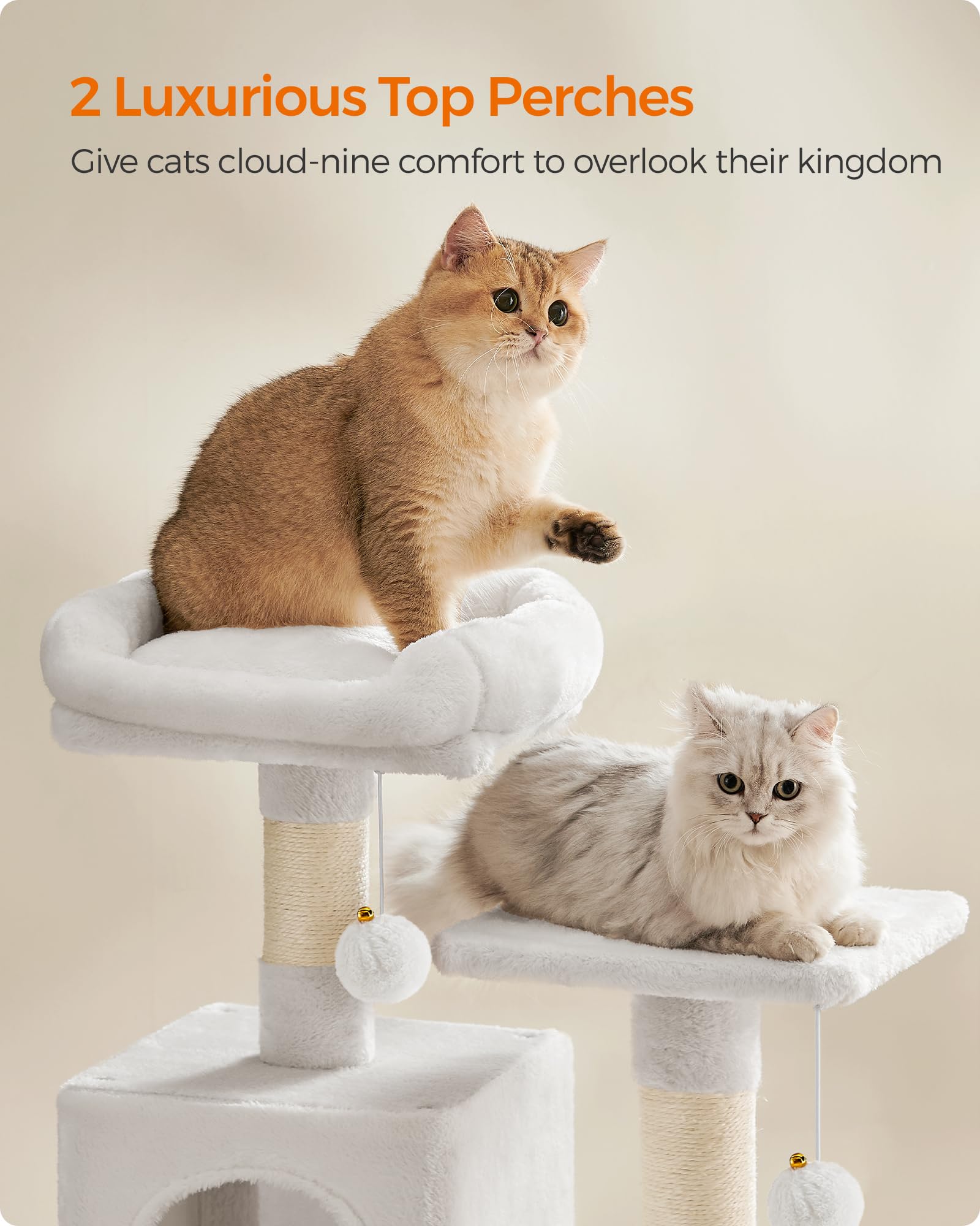 2 Perches, 2 Caves: This cat tree boasts two luxurious top perches and two spacious cat caves, providing multiple comfy spots for cats to unwind and observe from—perfect for multi-cat households