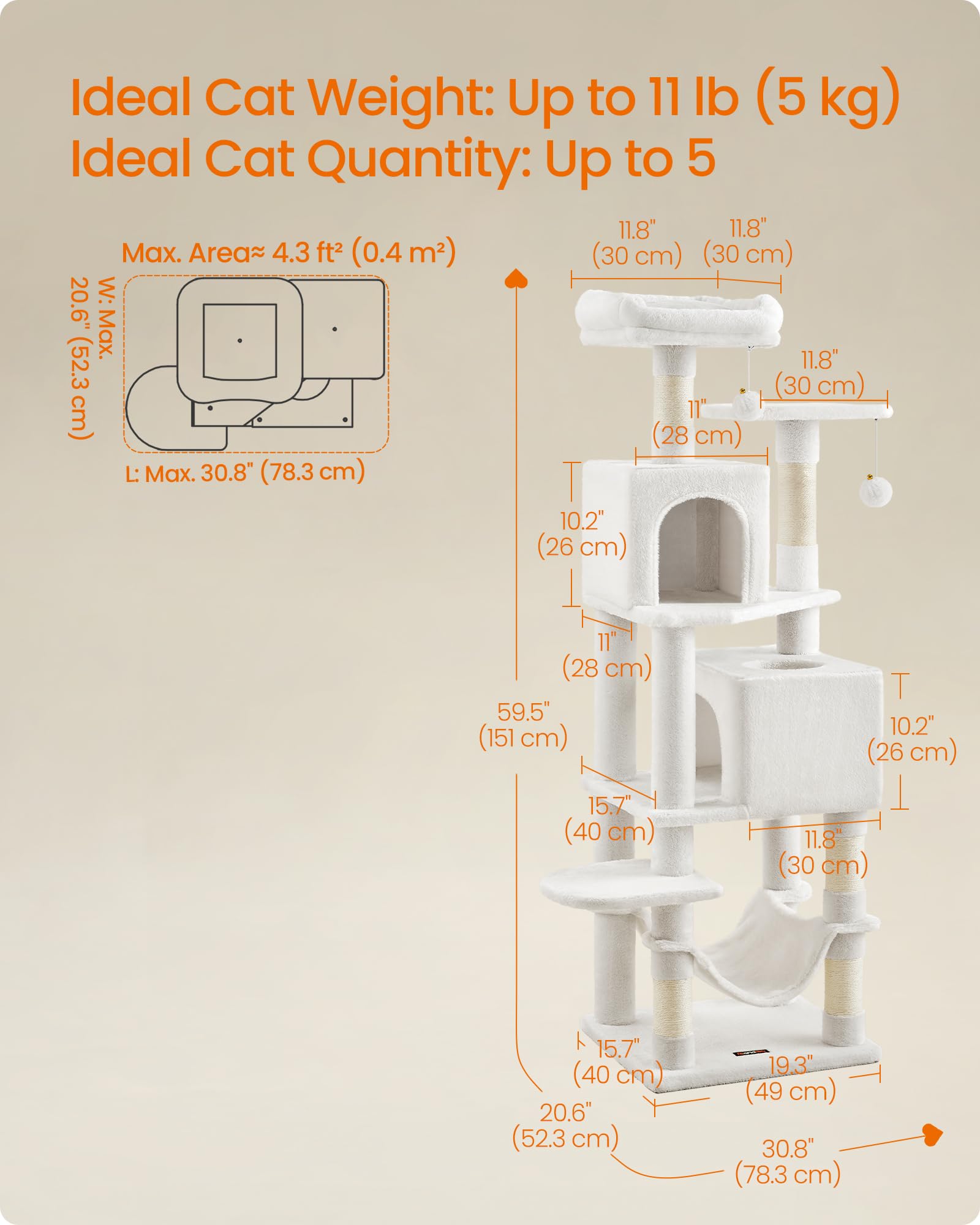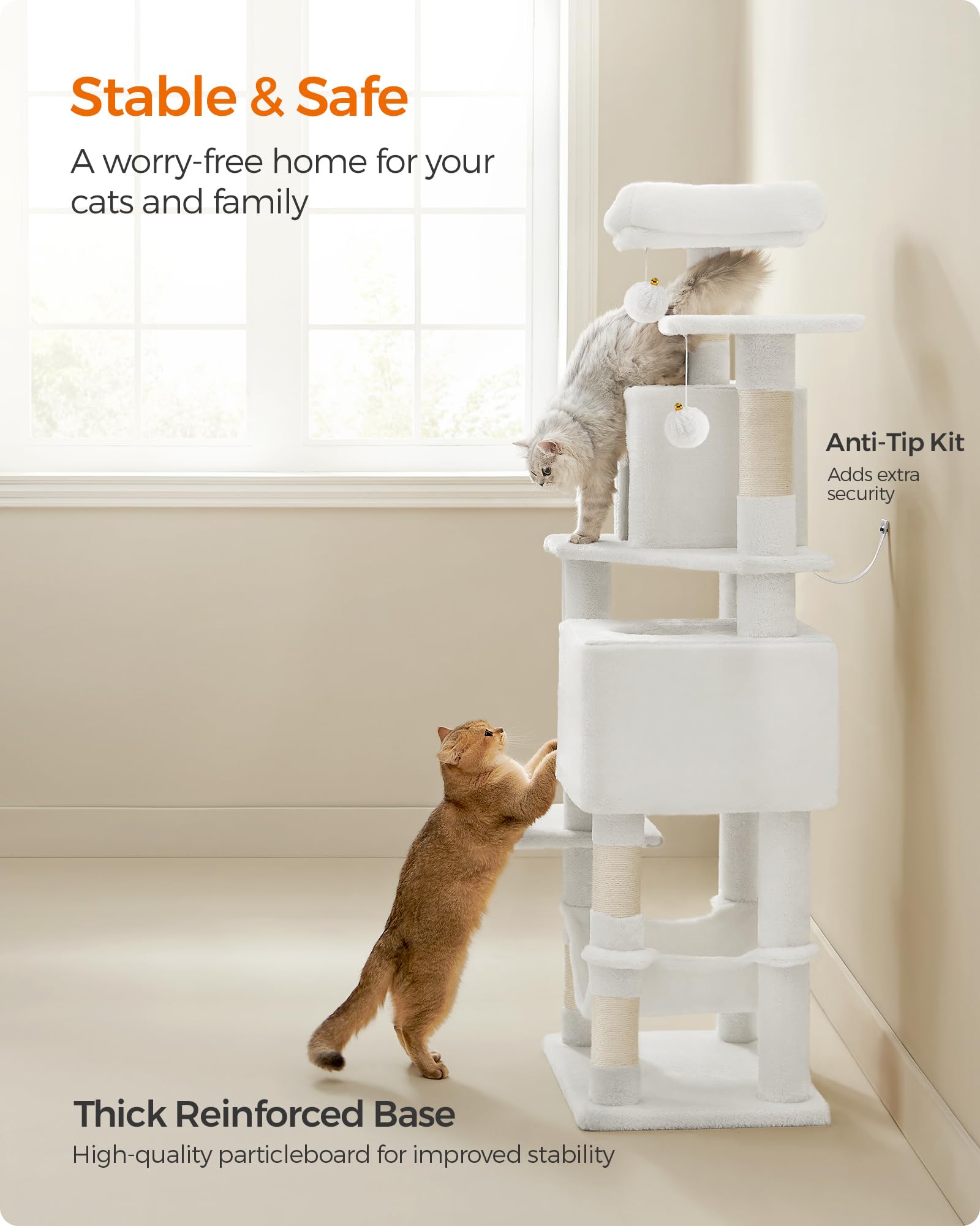 Sturdy and Secure: Supported by a strong structure and secured with an anti-tip kit, this cat tree is strong and safe for up to 5 cats (max. 11 lb each) to climb and play with peace of mind