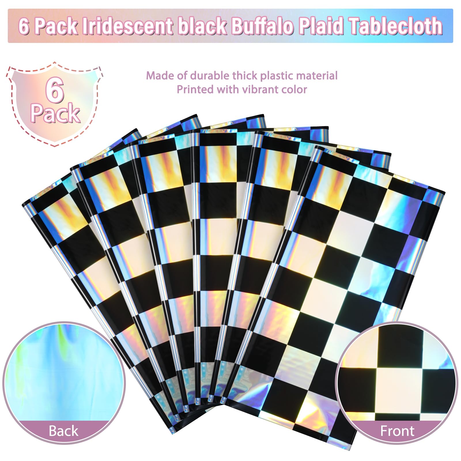 Package Includes: You will receive 6 black and iridescent checkered plastic tablecloths. Each iridescent table cover measures approx 54 x 108 inches, fits any rectangular table up to 8 feet in length, suitable for party decoration.
