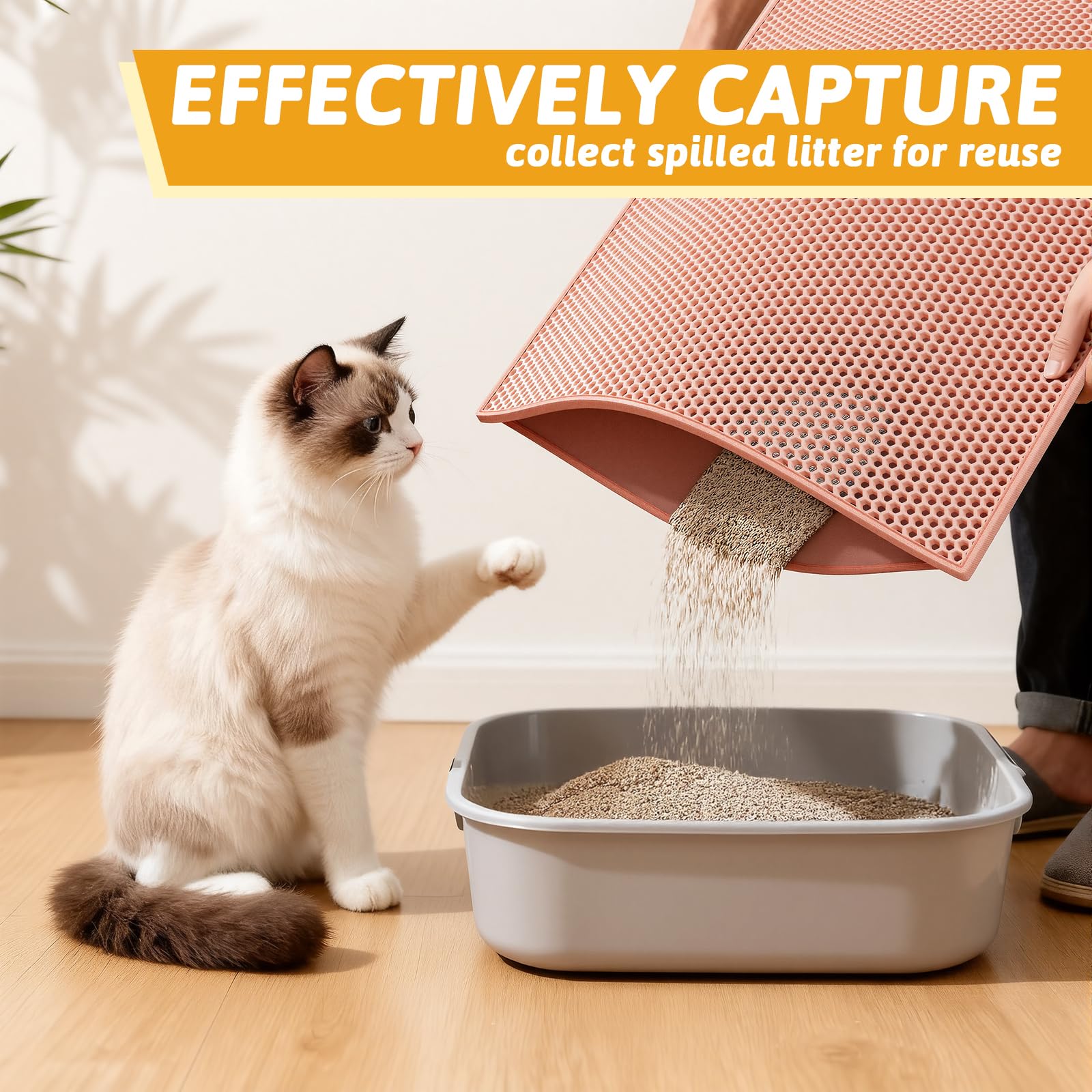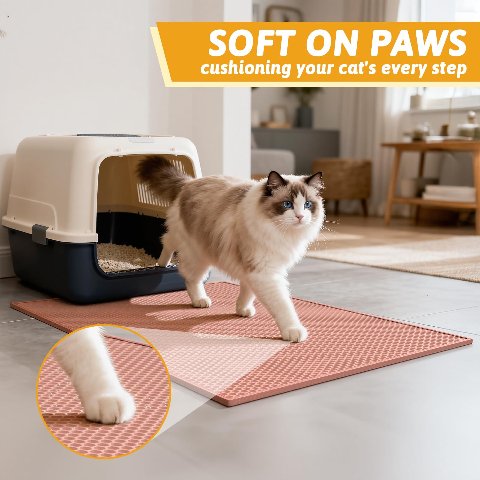 Anti Tracking EZ Open Edge Litter Mat: Double-layer honeycomb design helps you gather the litter. You just pick up the mat and all the litter falls through and then dump it back in the litter box make it recycling. No more getting litter stuck to my feet on a daily basis! Large holes is large enough to catch and trap litter. Suitable for lots of type of litter, and kitty litter boxes,hooded,self cleaning litter box.