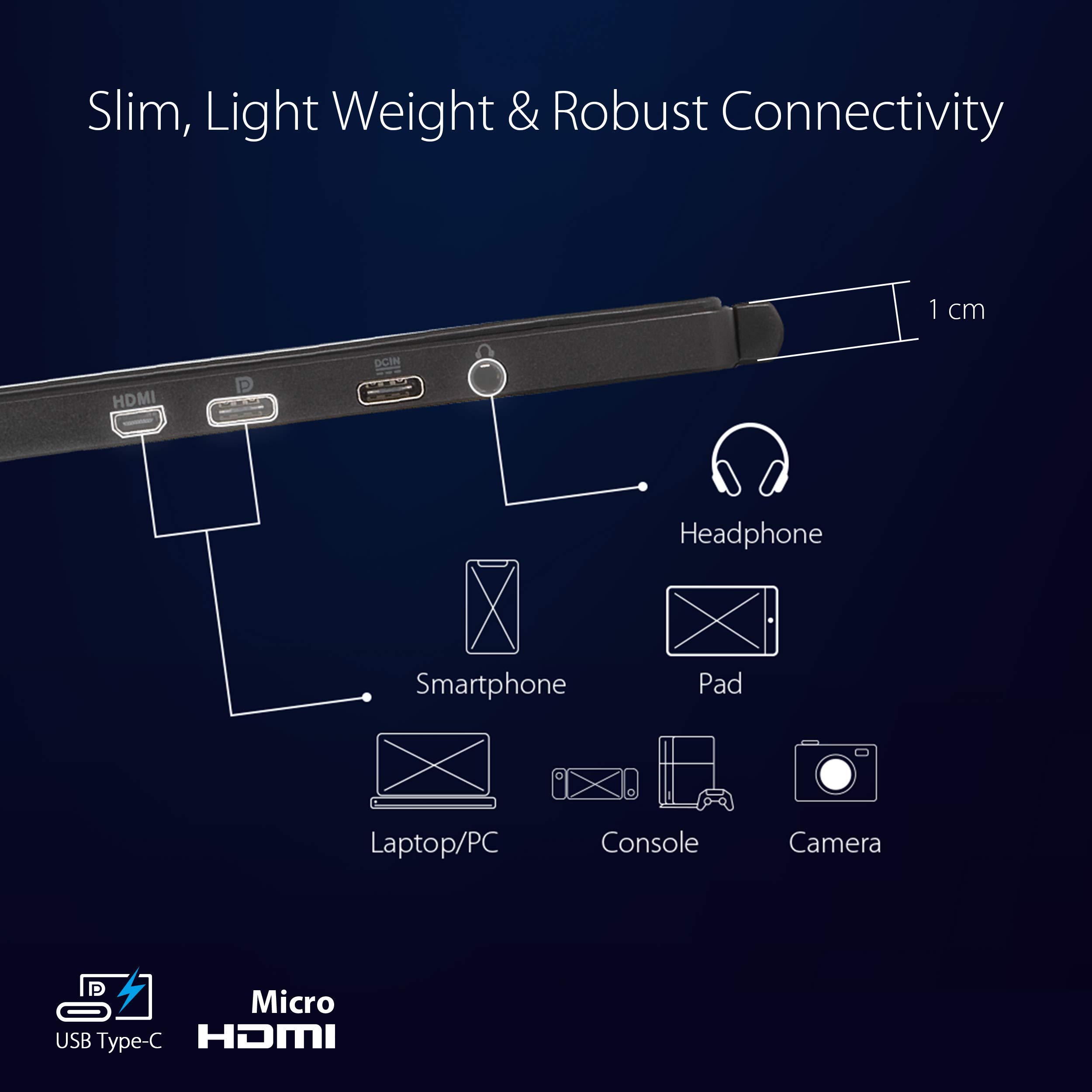 Hybrid-signal USB-C and micro-HDMI ports provide versatile connectivity with smartphones, laptops, game consoles, cameras, tablets and more