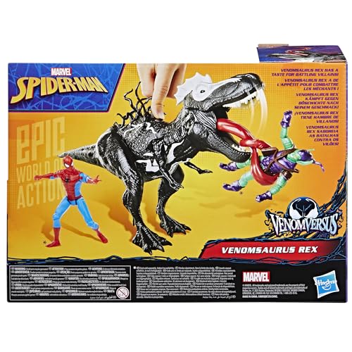 Venomsaurus Rex has a taste for battling villains! Kids ages 4 and up can roar into web-slinging action to battle Venomized baddies with the Marvel Spider-Man Venomsaurus Rex action figure! Let evildoers know you’re coming for them with this 16-inch (40cm) Spidey toy, featuring black-and-white Venom deco and design. Press the button on the Venomsaurus Rex toy’s back to open its mouth, then release the button for chomping action. This large-scale Marvel toy features a soft and stretchy tongue that can wrap around other Epic World of Action figures to capture them. The possibilities for play with this Spider-Man dinosaur toy are endless! Kids ages 4 and up can create their own exciting and interactive play scene with other Marvel Epic World of Action Spider-Man toys and action figures! (Each sold separately. Subject to availability.) These Marvel Super Hero toys for boys and girls make great Marvel gifts for kids! Copyright MARVEL. All trademarks and registered trademarks are the property of their respective owners. HASBRO and all related trademarks and logos are trademarks of Hasbro, Inc.