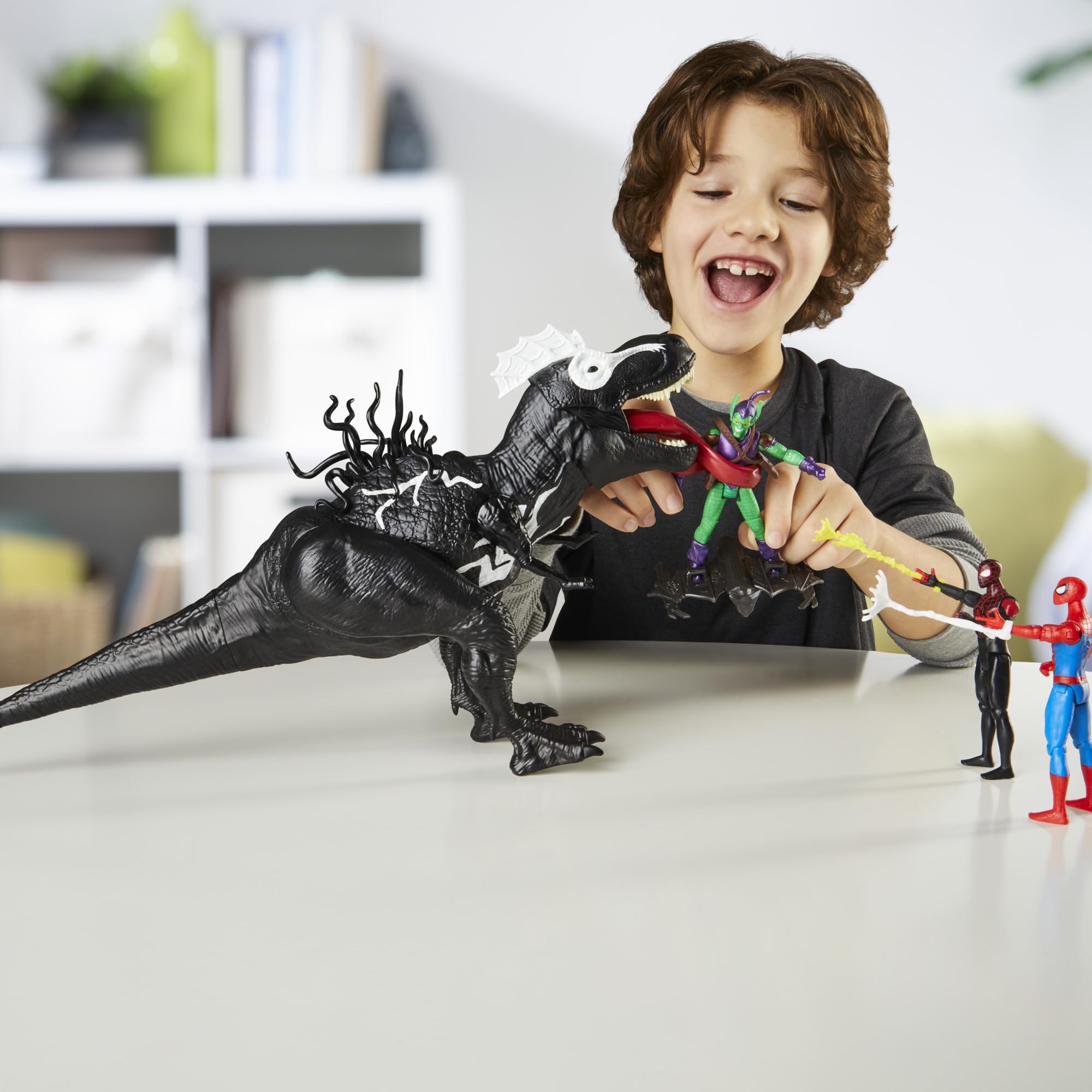 SPIDER-MAN VENOMSAURUS ACTION FIGURE: This poseable Marvel toy features a Venomized Spider-Rex, sporting classic black-and-white Venom deco and design