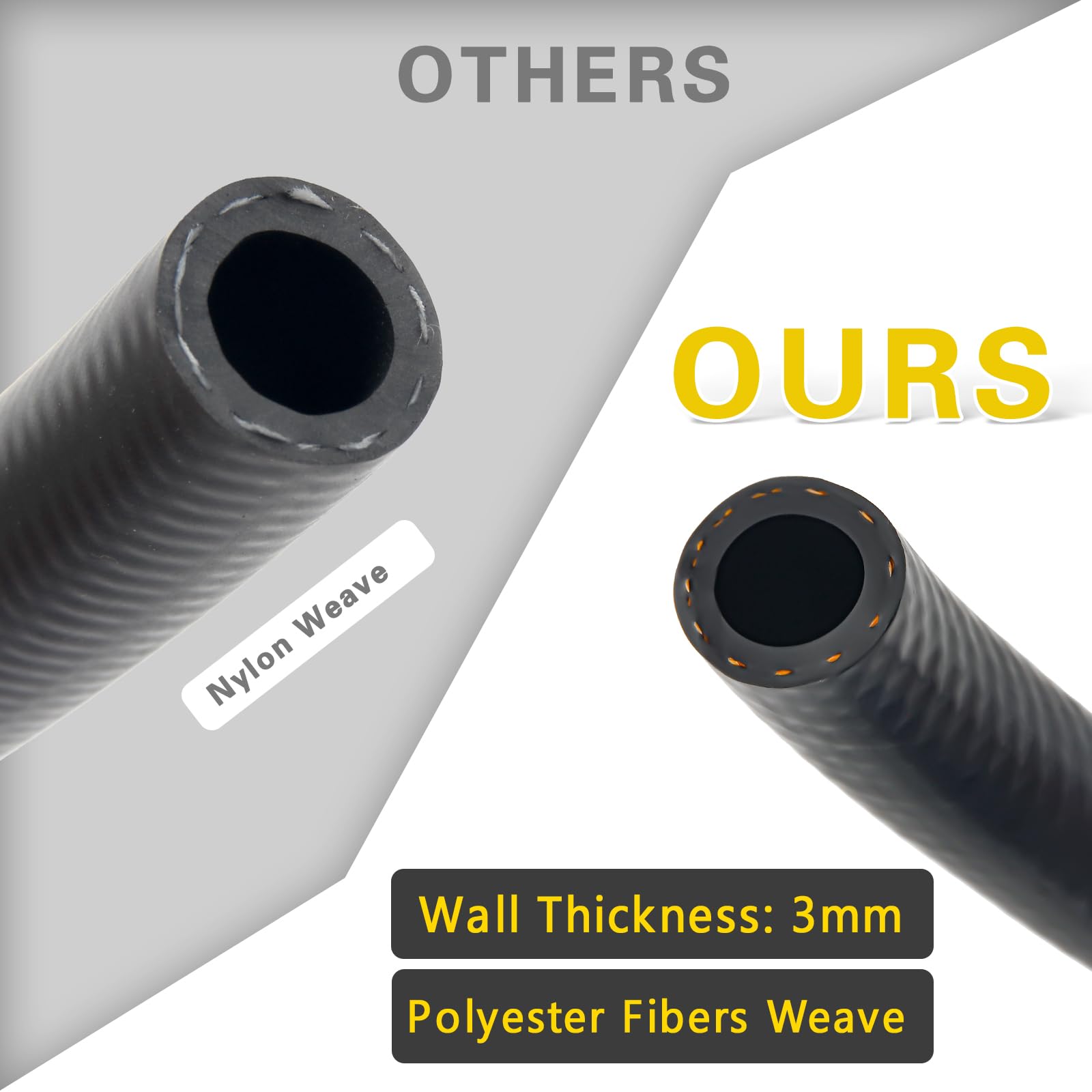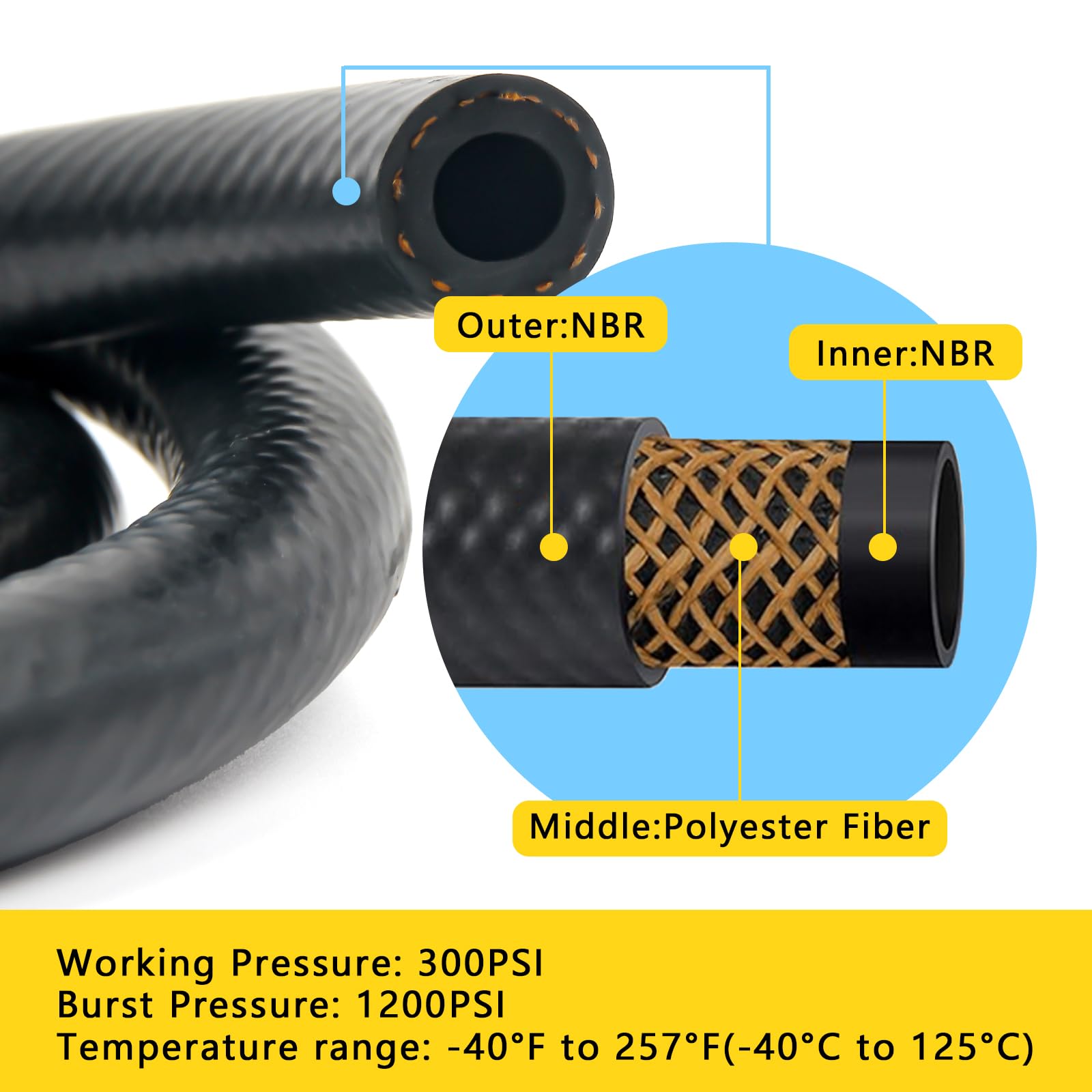 High Performance: The tubing hose is made of premium NBR + braided Polyester Fibers material, 3mm wall to ensure thick and flexible,durability and resilience. Working Pressure: 300PSI. Burst Pressure: 1200PSI. Temperature range: -40°F to 257°F(-40°C to 125°C)