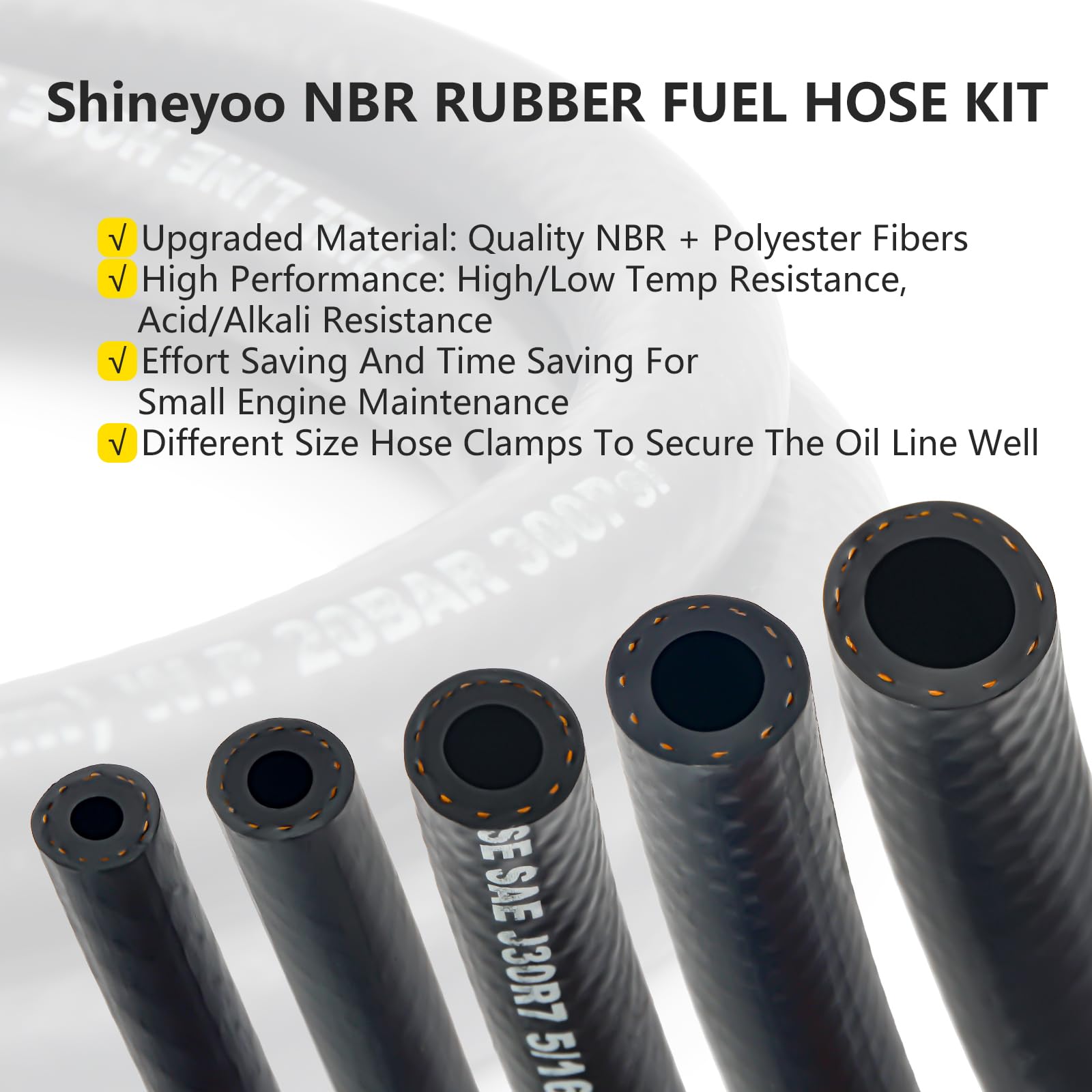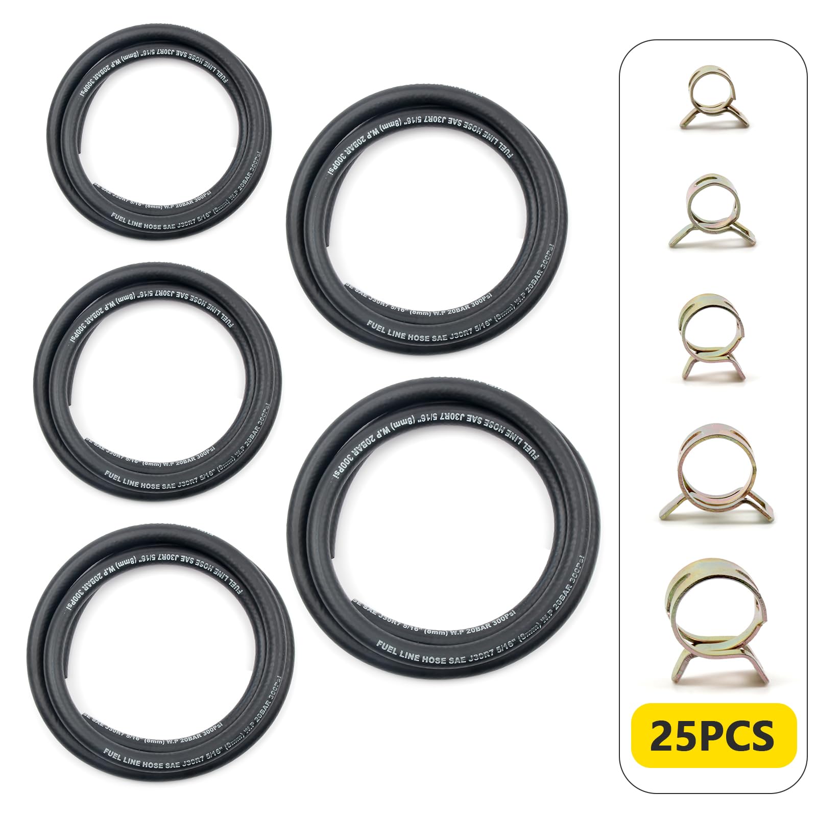 5 Size Fuel Line Hose Kit: This kit includes the most common hose size, 3/8" 5/16" 1/4" 1/2" 3/16" 5FT with appropriate sized clamps 25pcs. A variety of fuel hose at the ready for times when you need them, enough variety and length for nearly any project