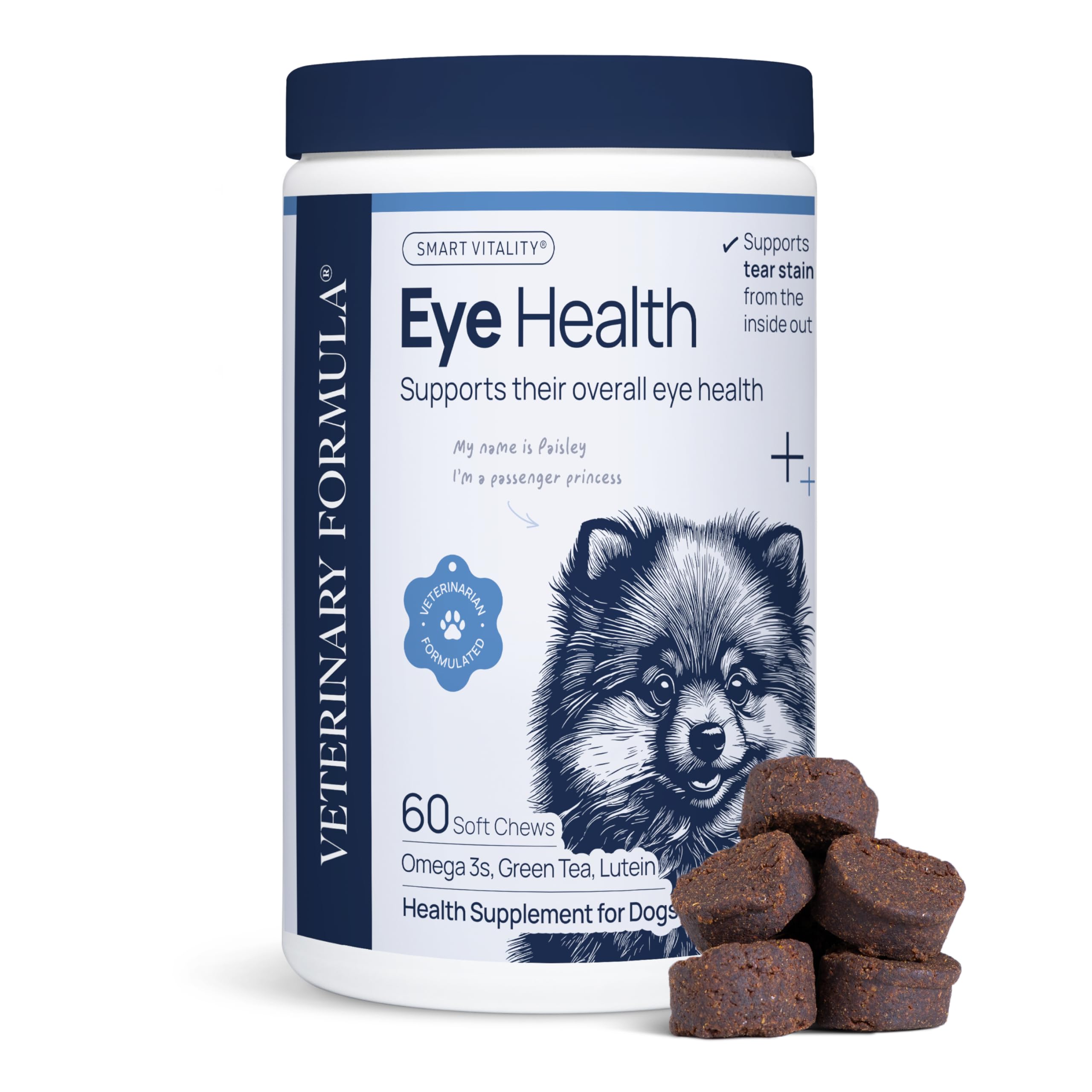 Help your dog see the world more clearly with Veterinary Formula Smart Vitality Eye Health Supplement. Whether you’re concerned about tear stains, eye dryness, or supporting long-term vision health, this daily supplement is designed to support your dog’s eyes from the inside out. Formulated by veterinarians, these soft chews combine omega fatty acids, antioxidants, and herbal support to promote eye comfort, moisture balance, and immune health. Omega-3 and Omega-6 fatty acids from flaxseed and algae oil help support skin health around the eyes and maintain moisture to naturally reduce tear staining. Antioxidants like lutein, green tea extract, and cranberry extract help protect delicate eye tissues and support normal vision. Ceylon cinnamon and marshmallow root provide plant-based support to help maintain clear, comfortable eyes and promote overall wellness. With a tasty pork flavor and no artificial flavors or preservatives, these chews are easy to give and made for daily use. No powders, messy drops, or hard-to-swallow pills. Just one simple chew for daily eye support. Like all Smart Vitality supplements, our Eye Health formula is made in the USA in a cGMP-compliant facility and carries the NASC Quality Seal. You can feel confident knowing you're giving your pet a supplement held to the highest safety and quality standards. Give your dog the daily support they need for clearer eyes, healthy skin, and a brighter outlook with Smart Vitality Eye Health Supplement.