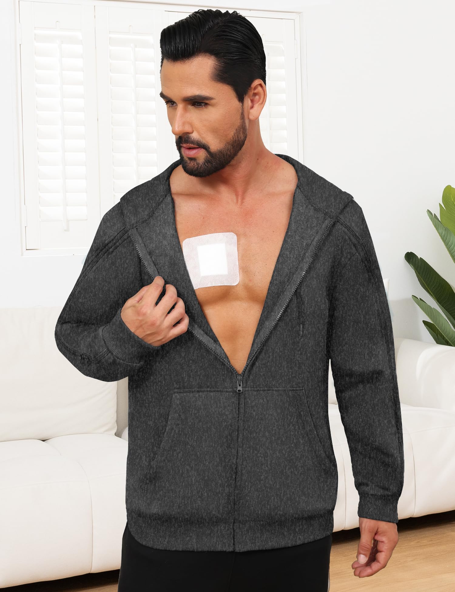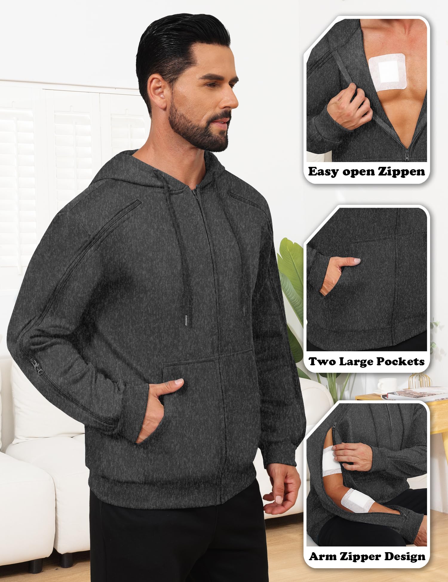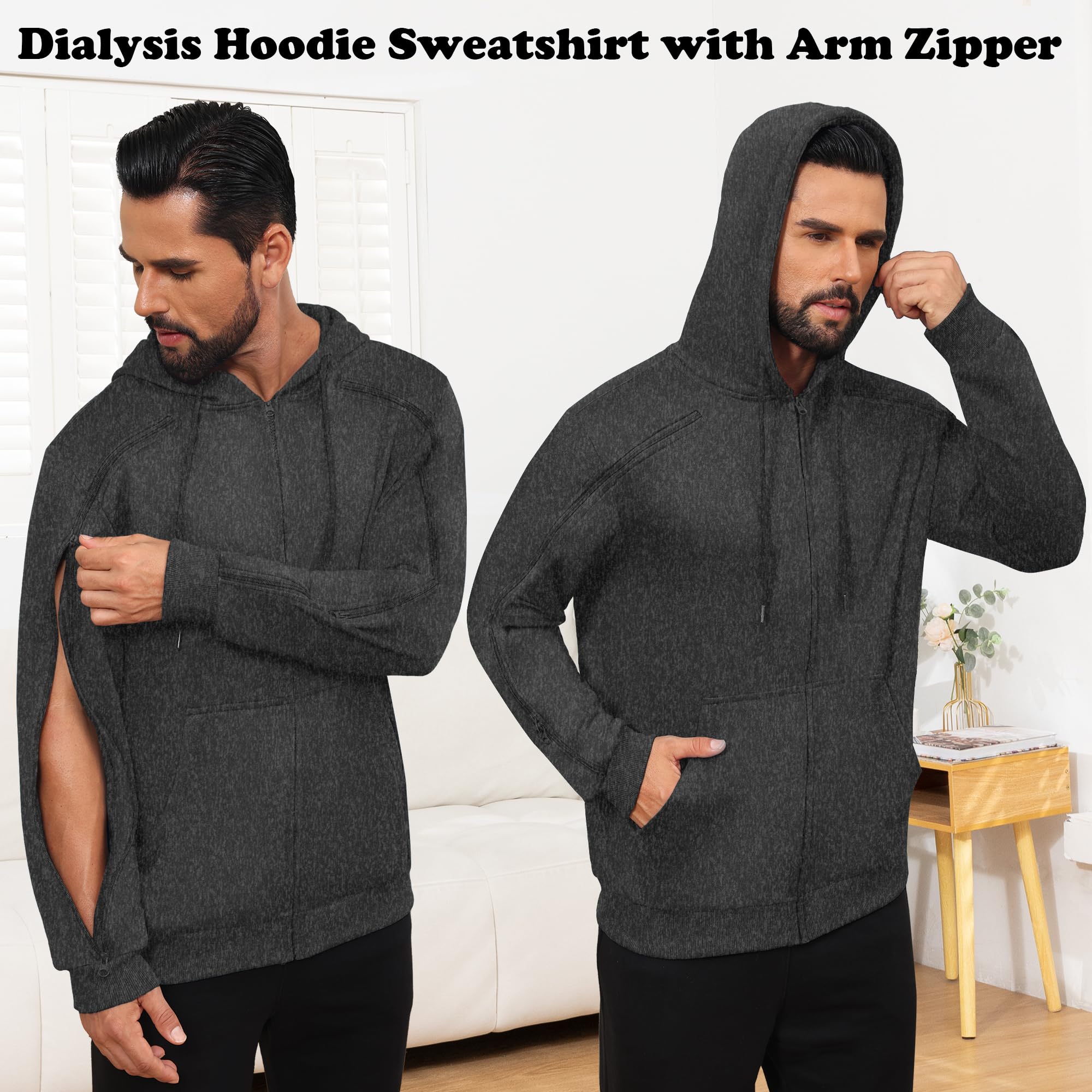 KGGEOO Dialysis Sweatshirt with Arm Zipper Jacket Full-Zip IV Hoodie for Dialysis Clothing Chemo Hoodie with Pockets Dark Grey