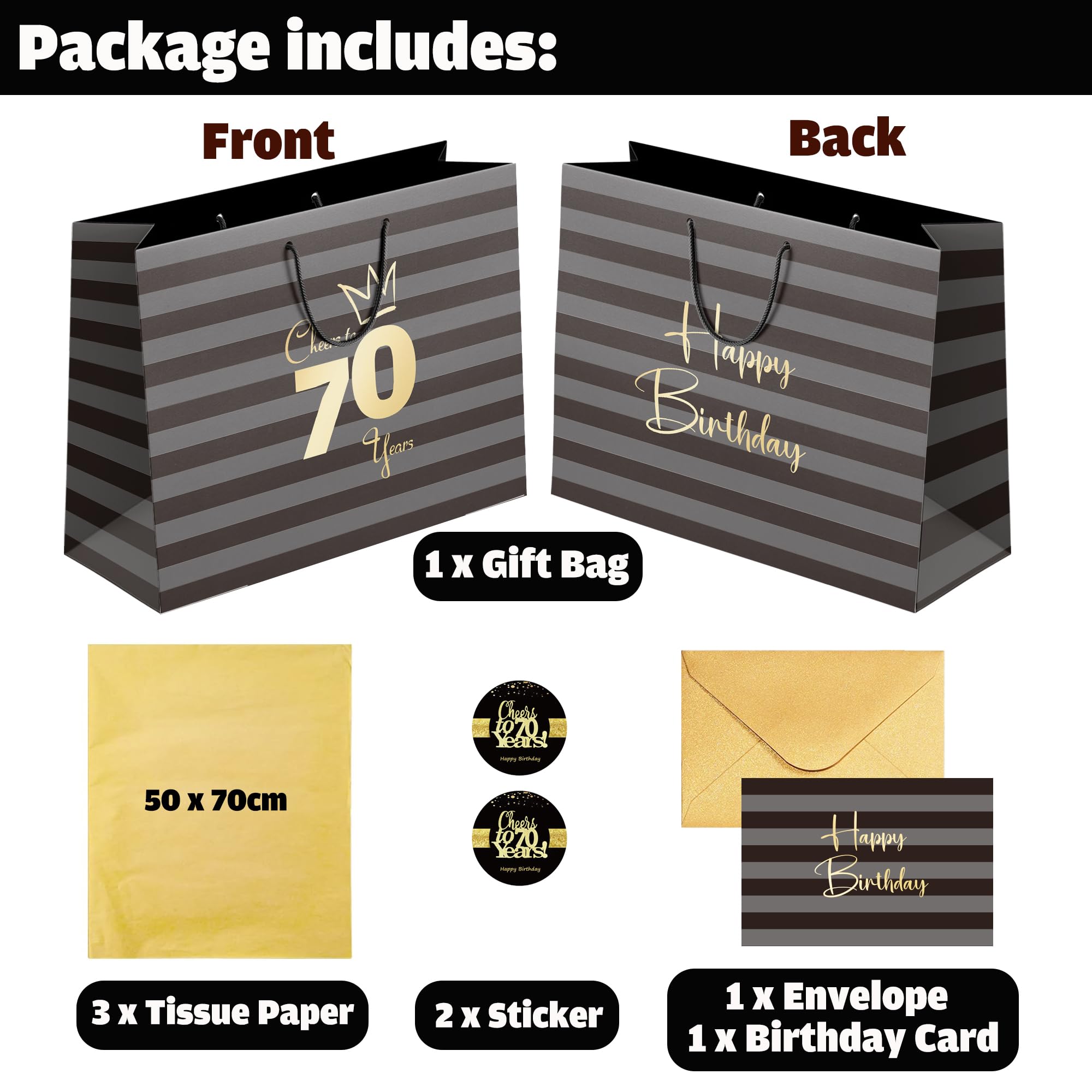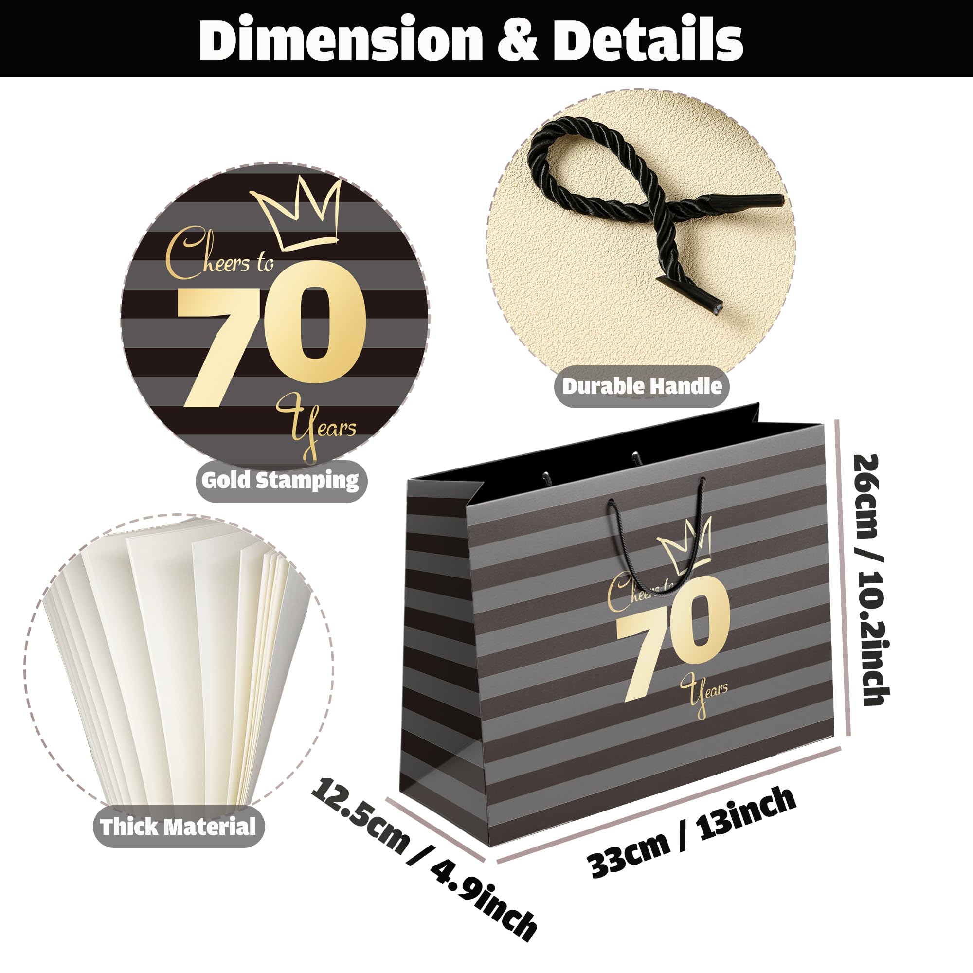 【70th Birthday Bag for Women】: The black and gray striped gift bag reads "Cheers to 70 years" and "Happy Birthday"!