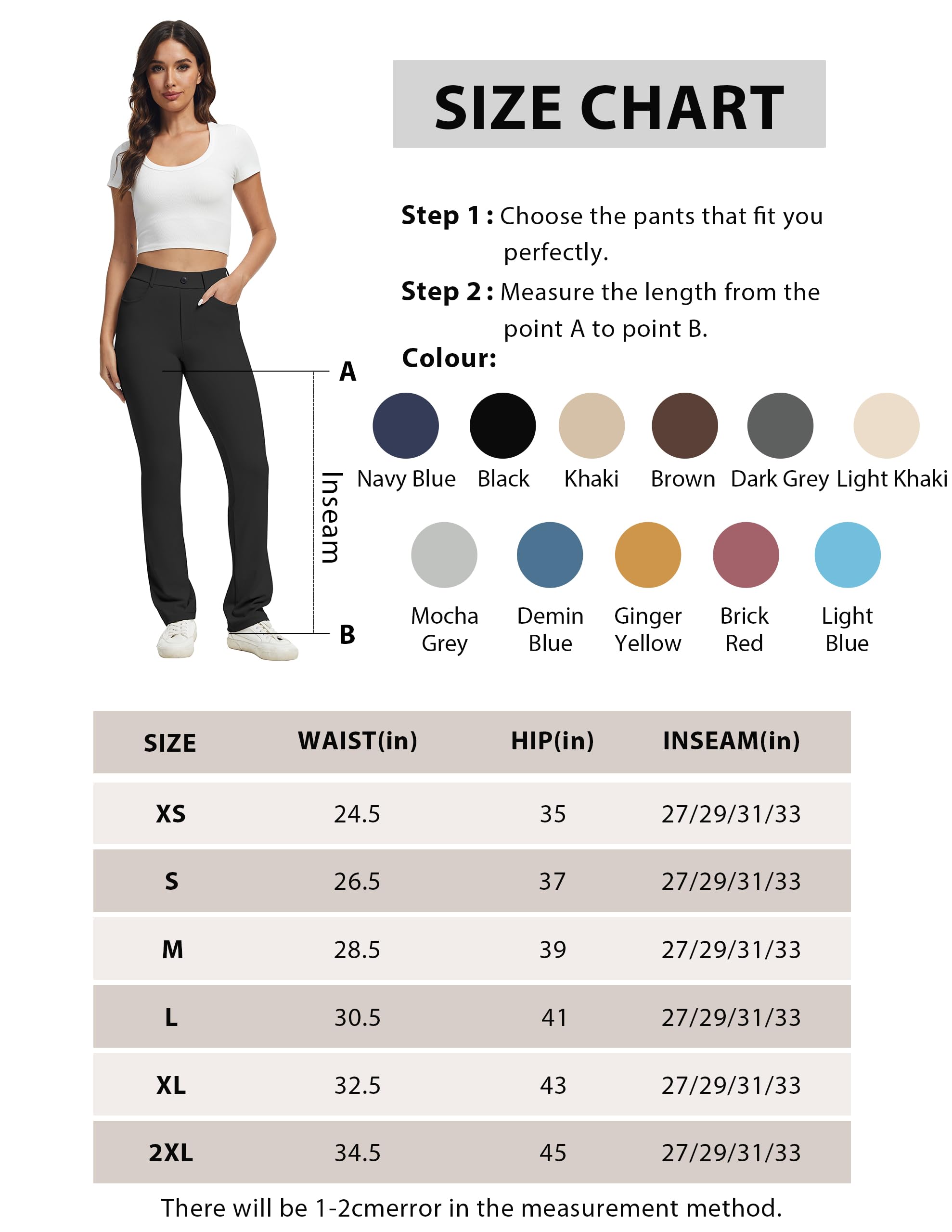 4 Inseam Lengths: 27 inseam fits women 5 feet 2 inch or under; 29 inseam fits women 5 feet 2 inch to 5 feet 4 inch; 31 inseam fits women 5 feet 5 inch to 5 feet 7 inch;33 inseam fits women 5 feet 8 inch to 5 feet 10 inch;Please refer to the size chart to choose the correct inseam