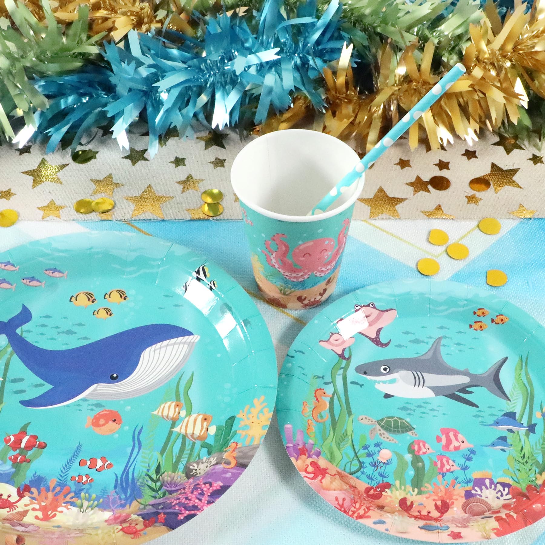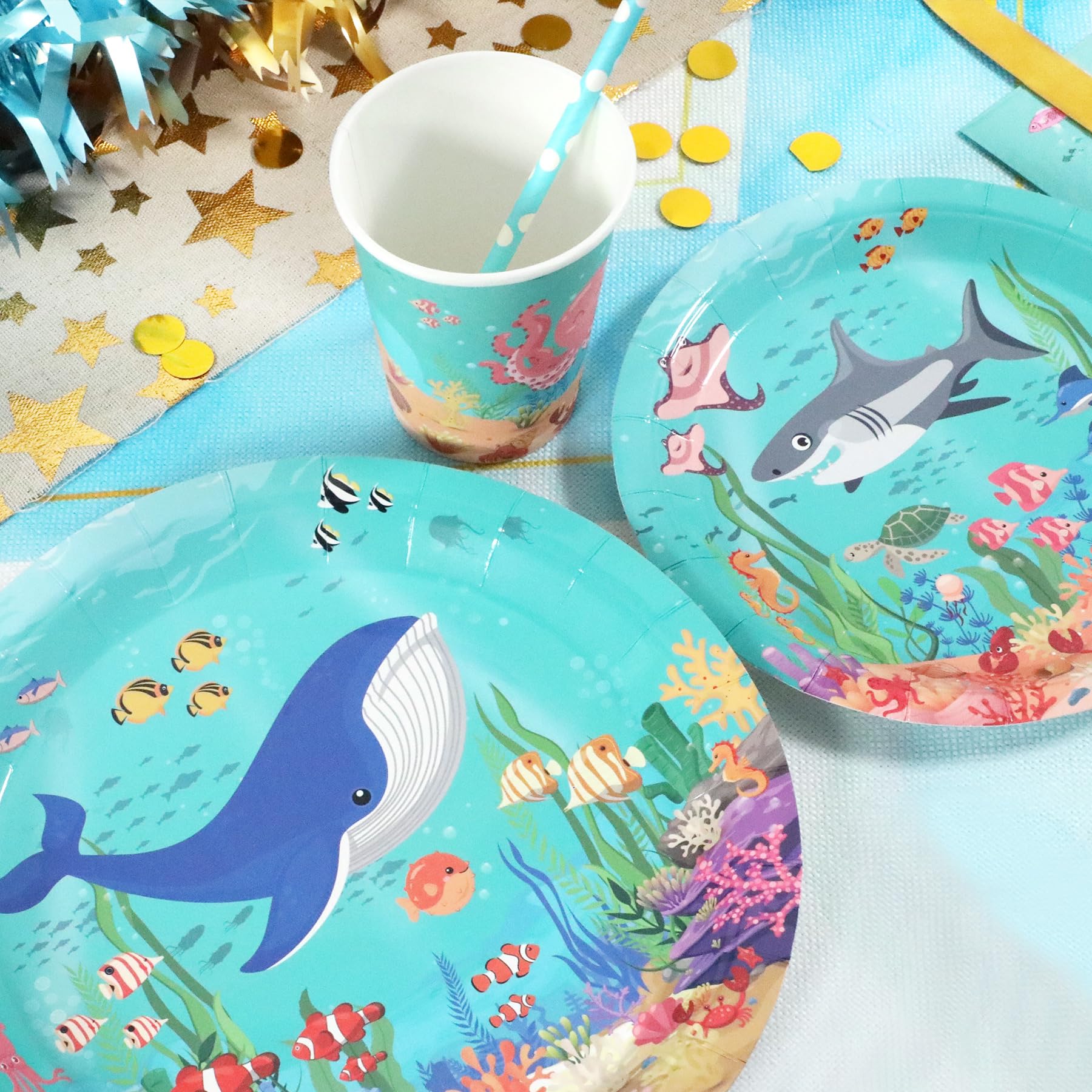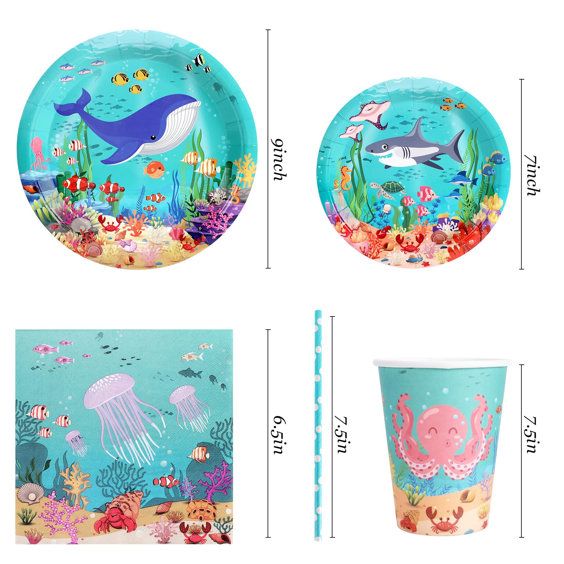 【Serves 24 Guests】: The under the sea theme disposable dinnerware comes with 9" dinner paper plates *24, 7" paper dessert plates *24, 9oz paper cups *24, 6.5" napkins (3 layers) *24 and paper straws *24. The durable dinnerware set allows you to serve 24 guests at one time.