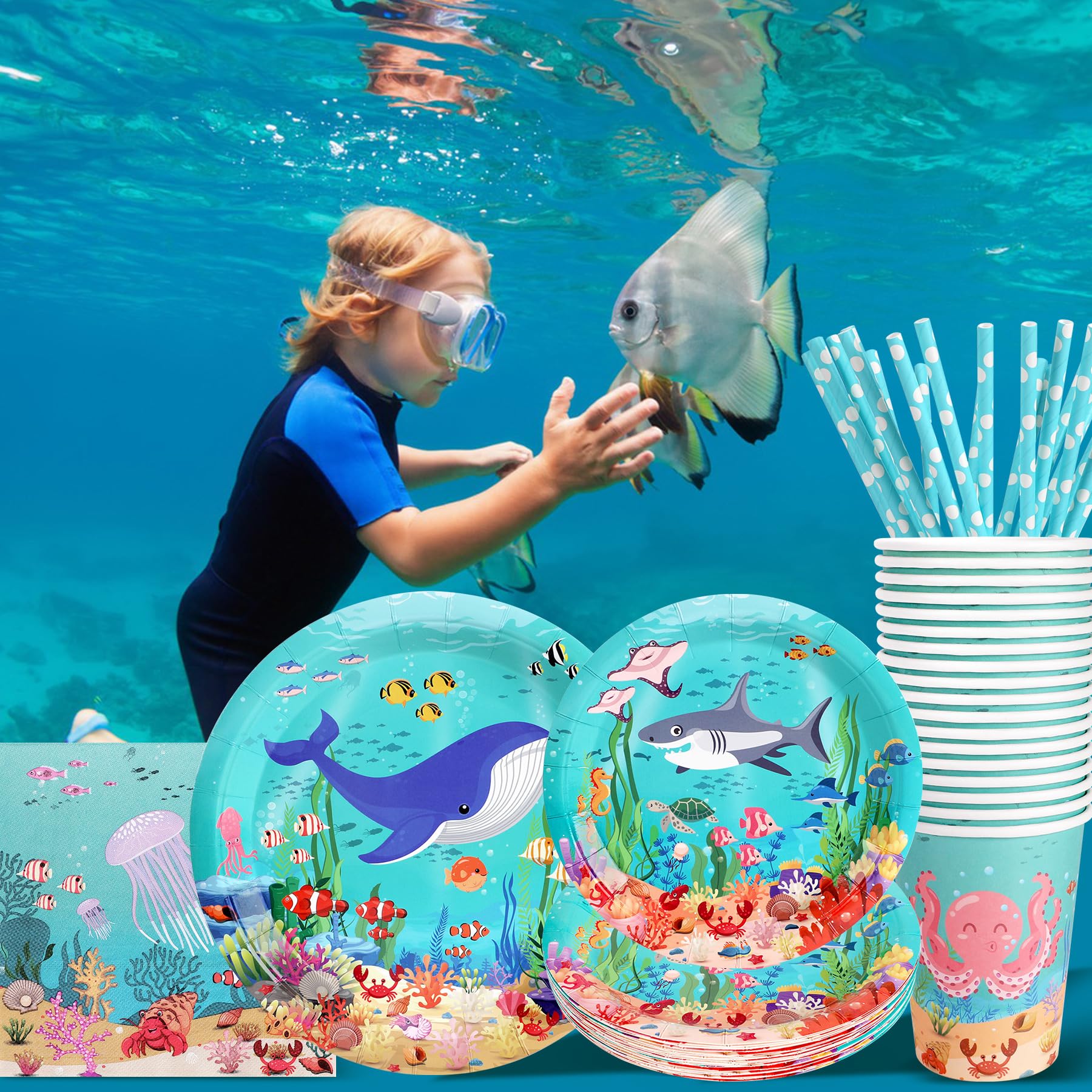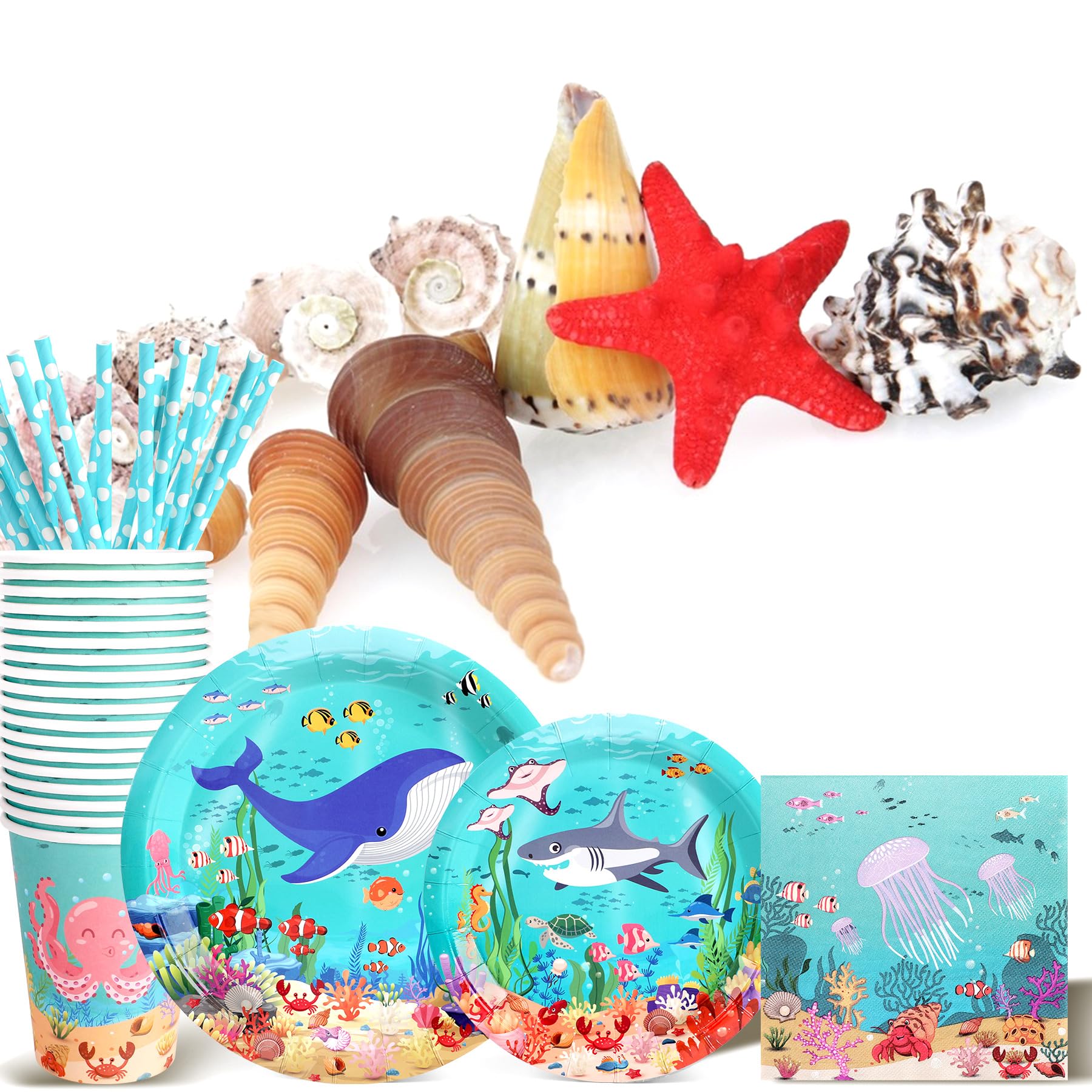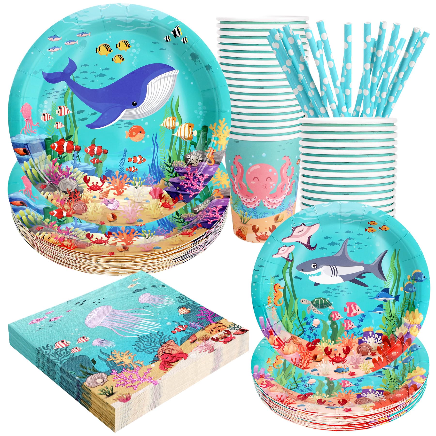 【Serves 24 Guests】: The under the sea theme disposable dinnerware comes with 9" dinner paper plates *24, 7" paper dessert plates *24, 9oz paper cups *24, 6.5" napkins (3 layers) *24 and paper straws *24. The durable dinnerware set allows you to serve 24 guests at one time.