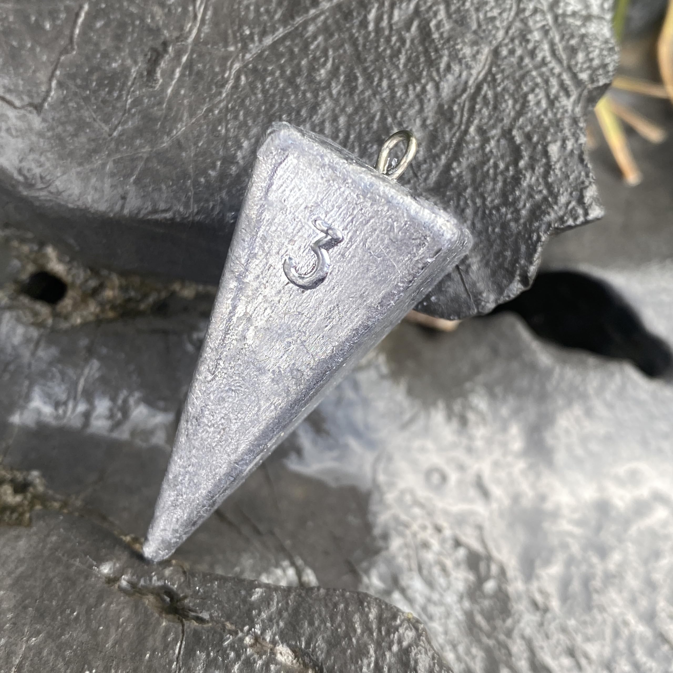 Pyramid sinker tapered pointy shape allows it to dig into soft surfaces such as sand or mud very well, allowing the bait to be held fairly still in a current, they also drop to the bottom very quickly