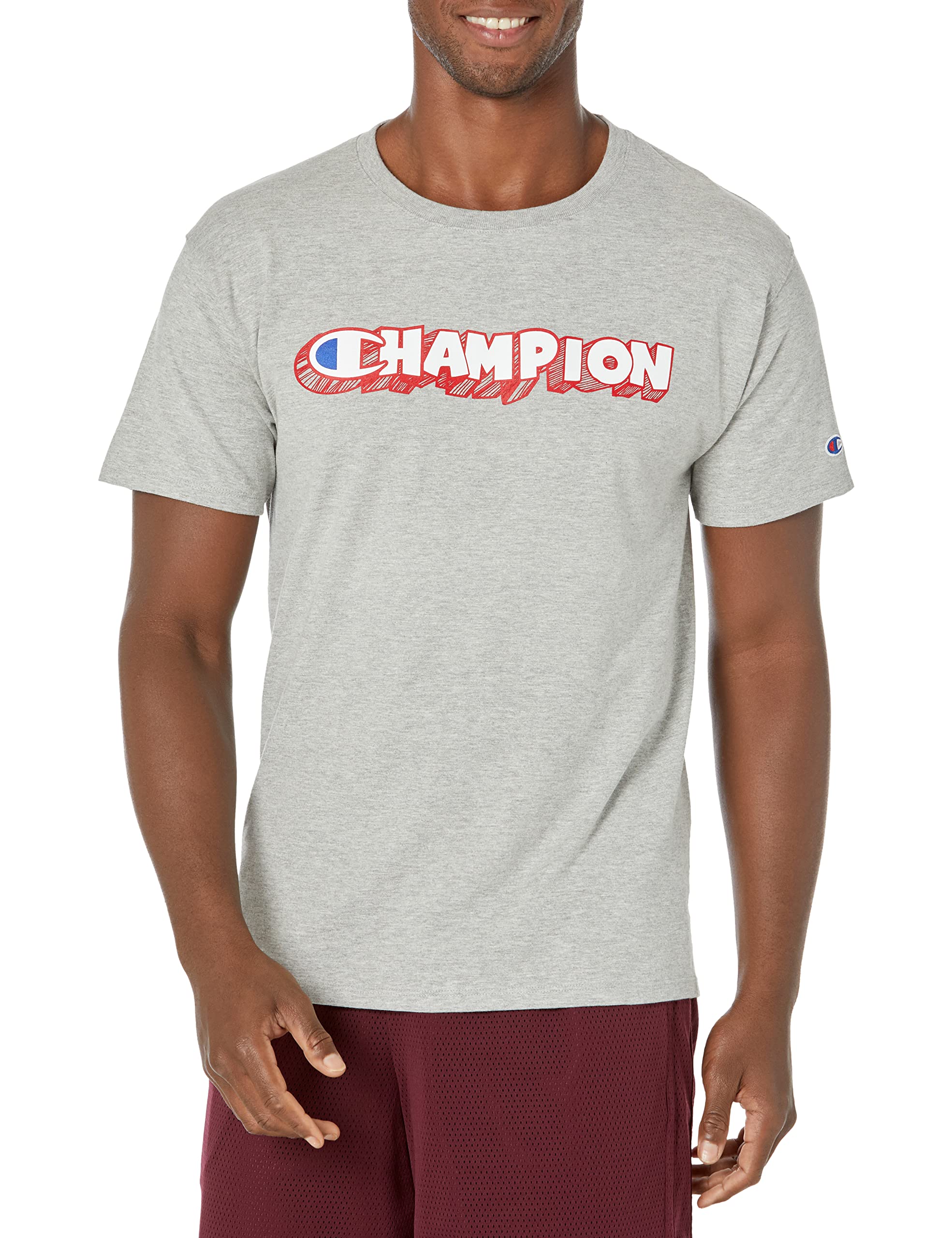 THE GRAPHIC - Cartoonish, block-style Champion script spans the front of this men's t-shirt.
