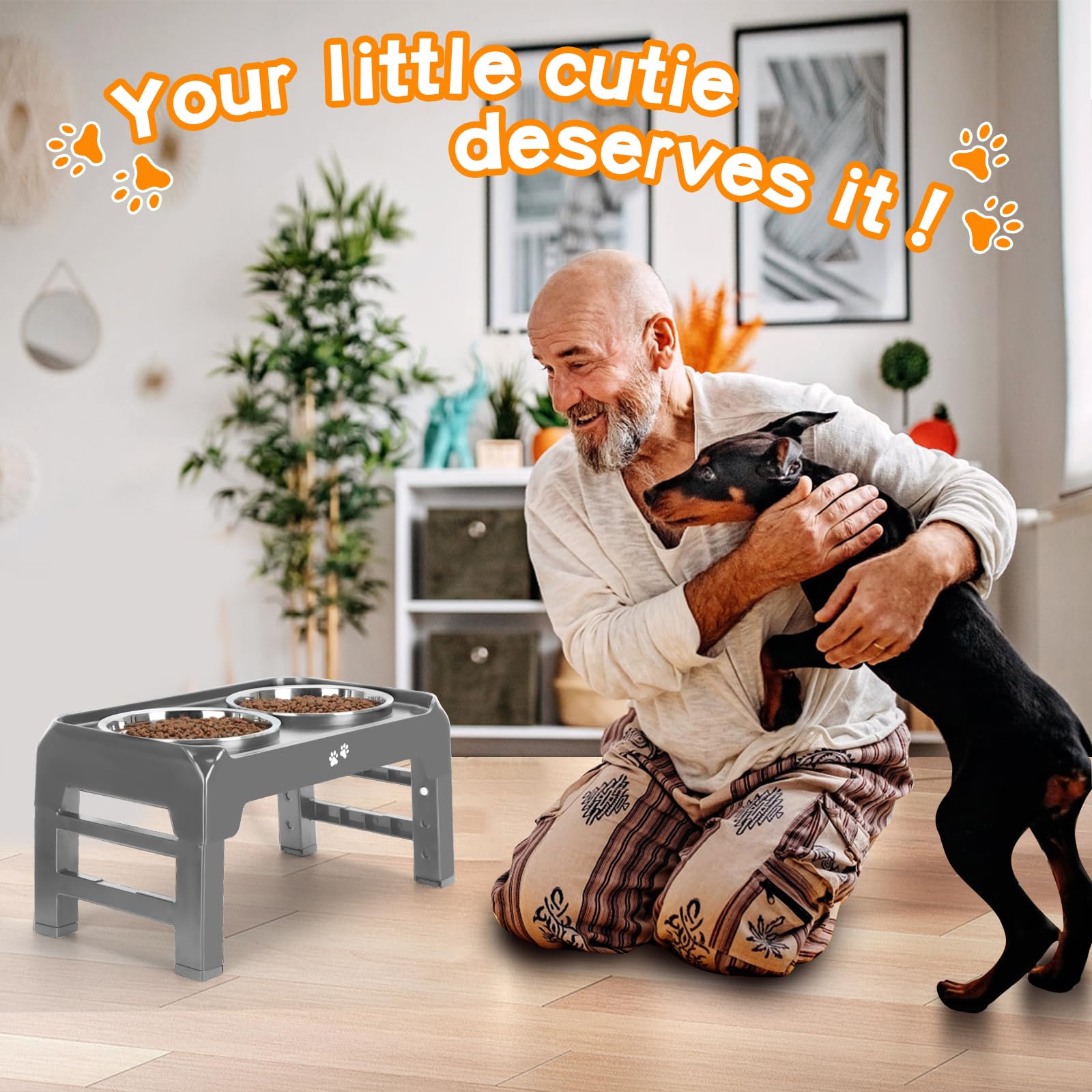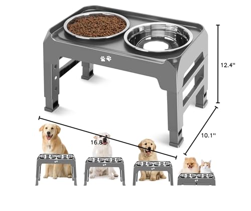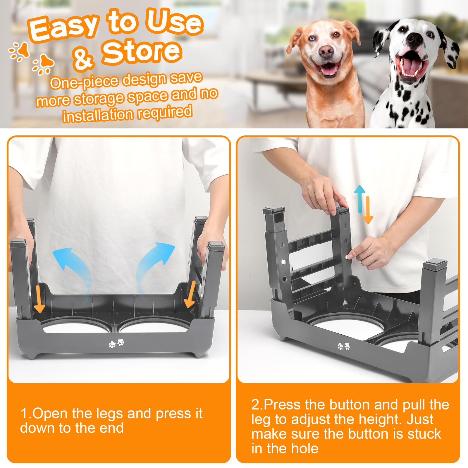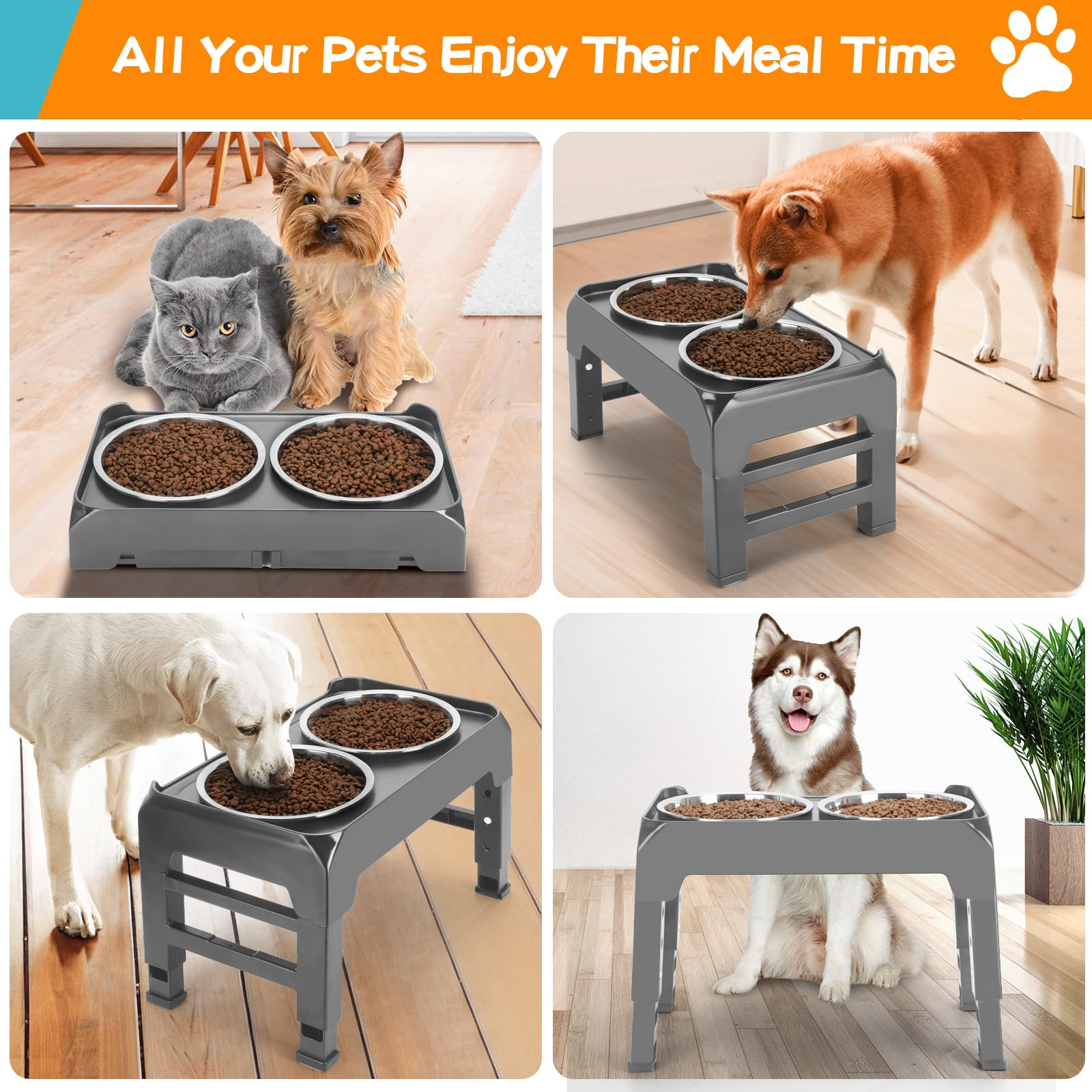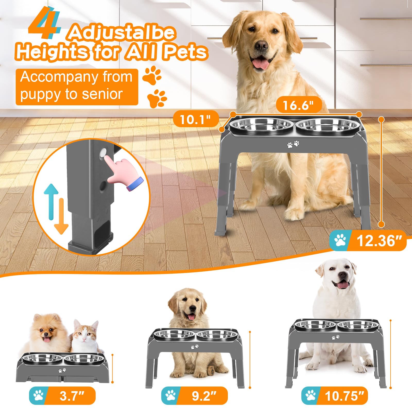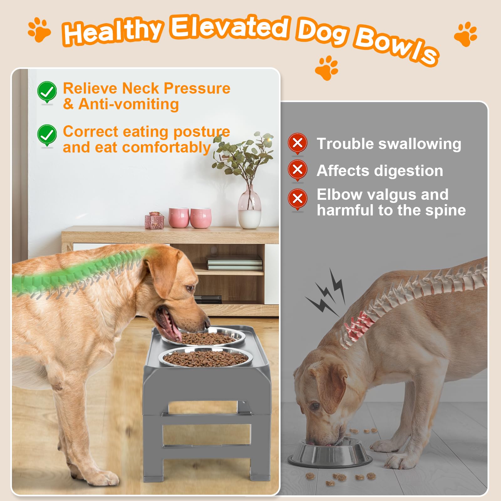 🐕Adjustable Height Dog Bowl Stand for Dogs of All Sizes: Say goodbye to bending down! Our elevated dog bowls can be adjusted to 4 different heights: 3.7", 9.2", 10.75", and 12.36", accompany then from puppy to full grown. The raised dog bowl can not only makes it easier and comfortable for dogs to access their food and water, but also prevents dust or floor debris from falling into the bowls, ensuring a clean and healthy dining experience.