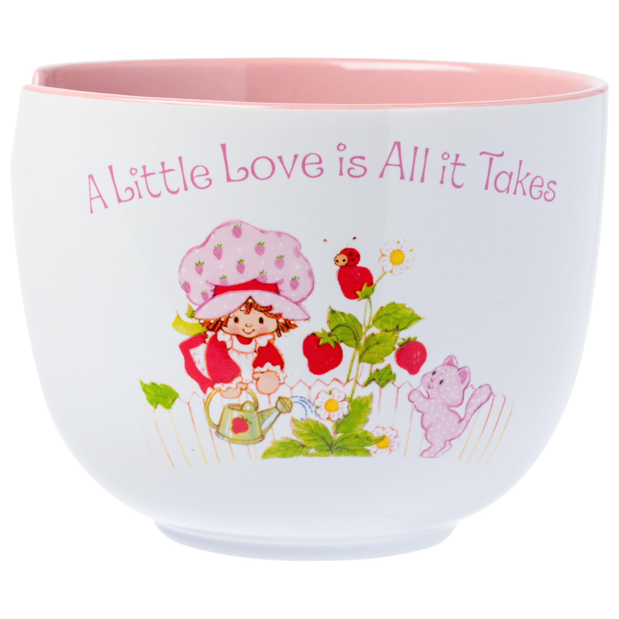 ADORABLE RAMEN BOWL: Themed bowl features Strawberry Shortcake and Custard in an adorable garden. Written above the beloved characters is “A Little Love is All it Takes.” Bowl is white with a pink interior.