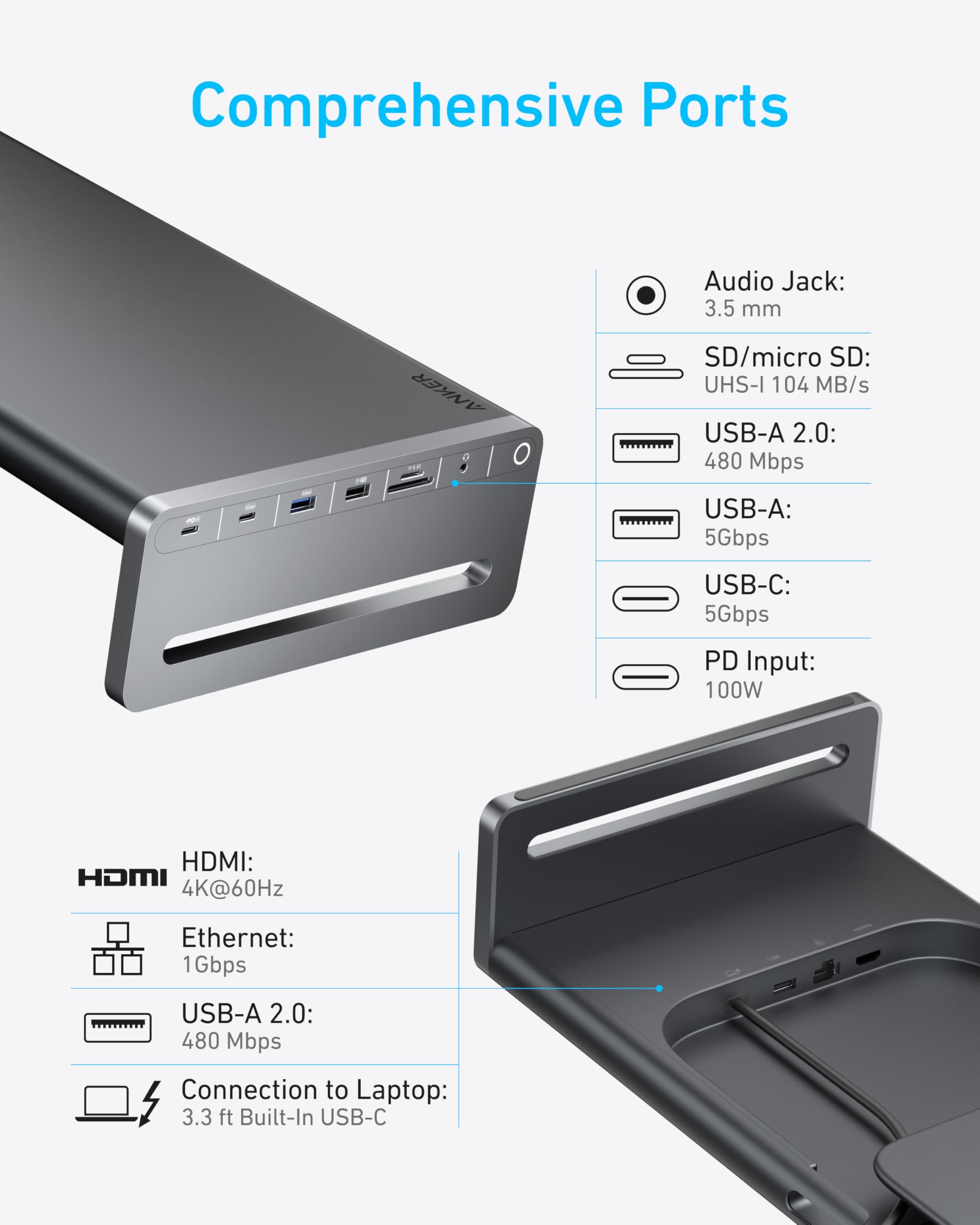 10 Ports for Every Connection: Loaded with a 100W PD input, 5Gbps USB-C and USB-A for rapid data syncing, two 480 Mbps USB-A 2.0 ports, a SD/micro SD reader, an audio jack, Ethernet connectivity, and 4K@60Hz HDMI.