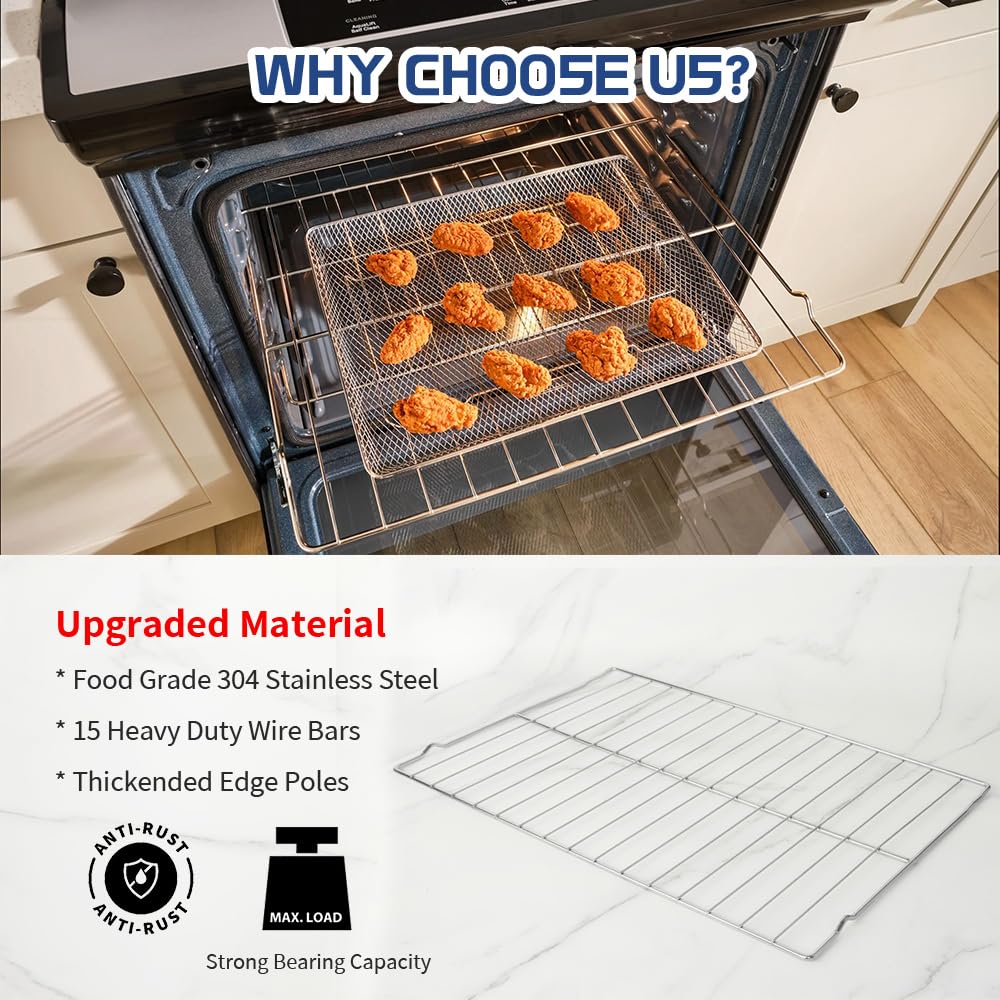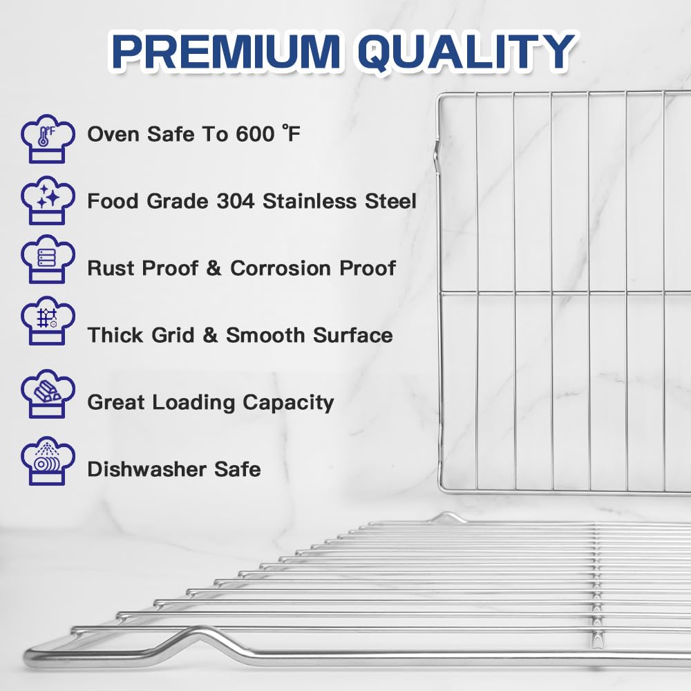 ✔ UPGRADED VERSION - The Range Oven Rack is made of standard food-grade superior stainless steel, which is durable and rustproof. Narrow grid pattern, included a total of 15 crossbar stainless steel fine wires, which can bear greater weight. Thickened rack edges are stronger, increase the support and balance of the entire rack, less likely to bend.
