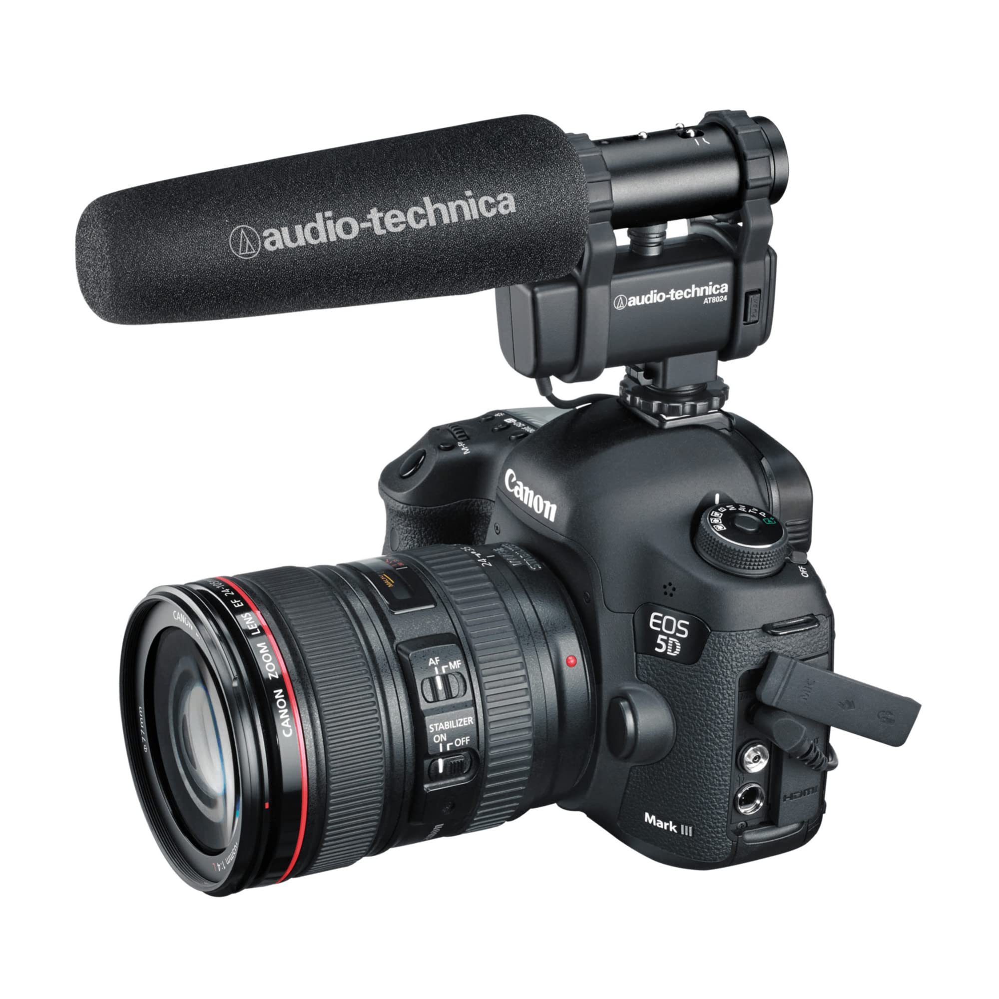 With its lightweight yet feature-rich design, the AT8024 Stereo/Mono Camera-Mount Microphone offers a simple, powerful solution for capturing high-resolution audio for video. Selectable line-cardioid mono and internally matrixed mid-side stereo modes provide the flexibility to focus the recording on a single sound source or to widen the field for outstanding sonic realism. In either mode, the AT8024 delivers audio that is dramatically better than that supplied by the camera's internal microphone. The AT8024 camera-mount microphone also comes equipped with a three-position adjustable attenuator (-20 dB, -10 dB, 0 dB) to capture even soft and very loud sound passages without distortion. A switchable low-frequency roll-off reduces pickup of undesired ambient noise, room reverberation and mechanically coupled vibrations. The microphone is powered by a single AA battery for optimal performance with high max SPL, and features an integral camera shoe mount that attaches quickly to DSLRs and shoe-equipped camcorders.